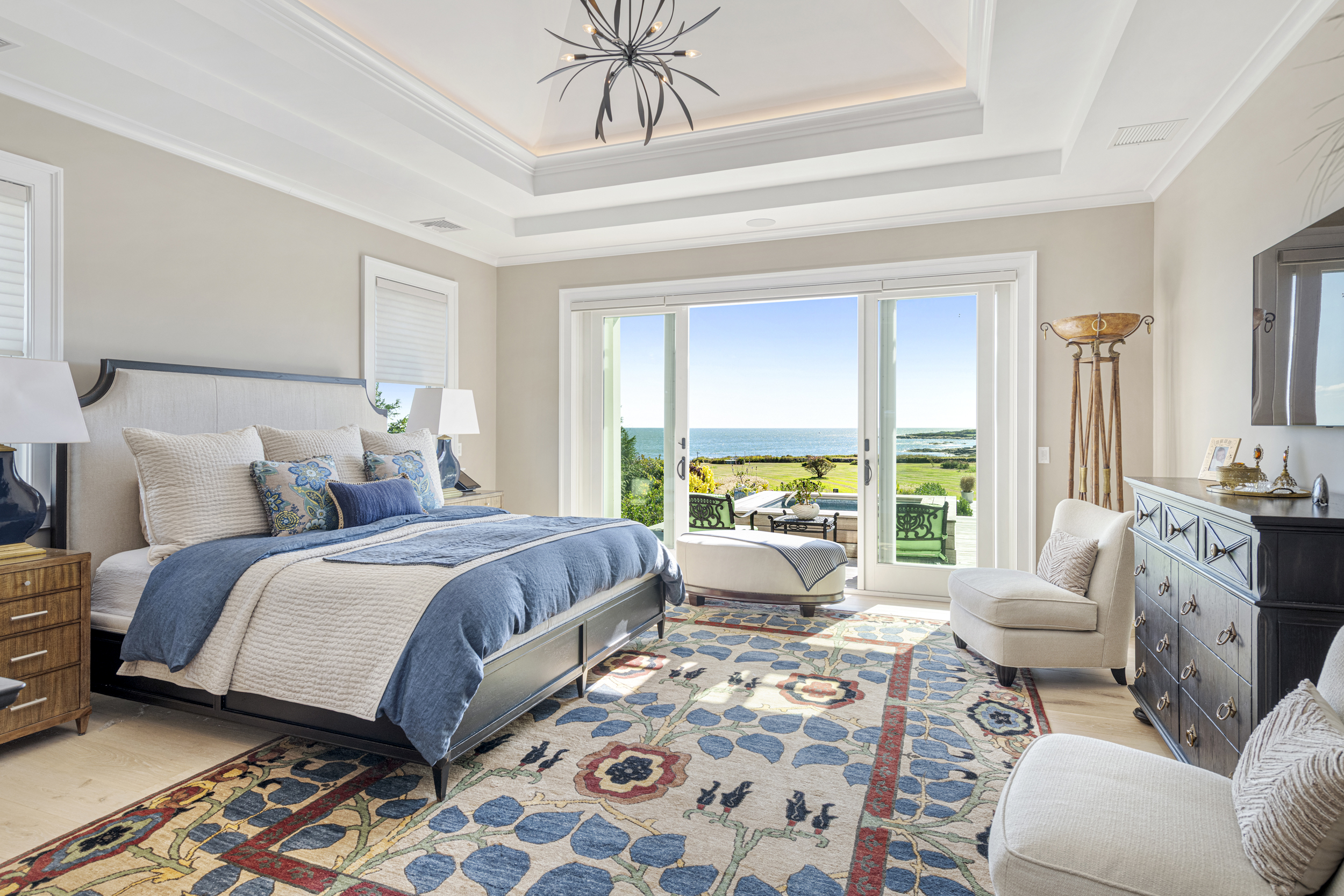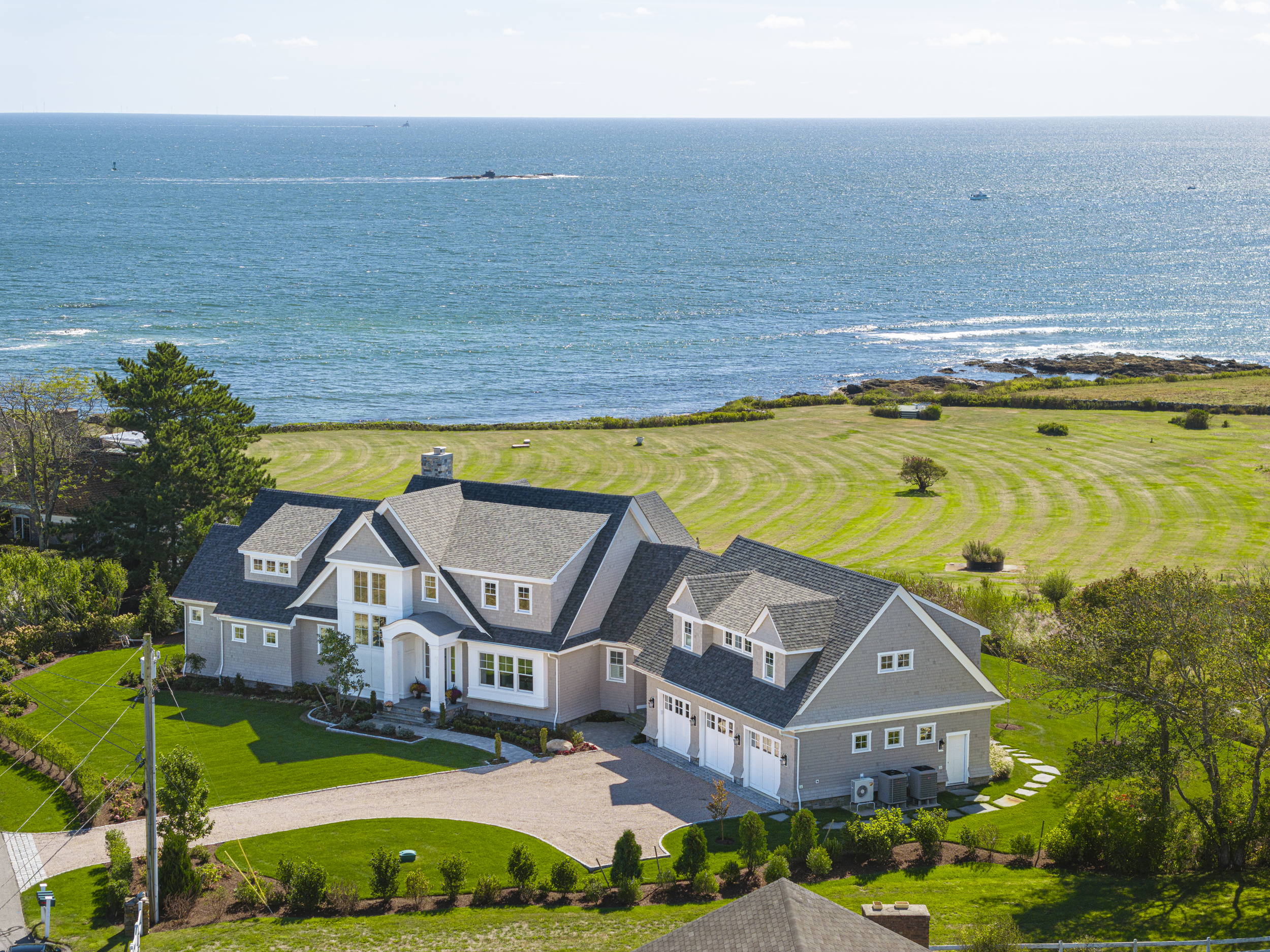 Set within the gated coastal enclave of Anawan Cliffs, this newly constructed Sweenor Builders residence (2021) offers a rare convergence of exclusivity, craftsmanship, and uninterrupted connection to the Atlantic. Encompassing 4 bedrooms, 4.5 baths, and approximately 7,400 square feet on nearly an acre. The home is intentionally oriented south, capturing sweeping ocean views that evolve throughout the day, from the soft morning light to the shimmer of late afternoon and the rhythmic movement of white-capped surf.