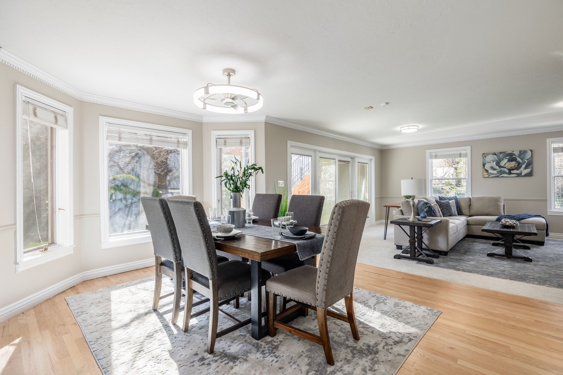 Discover an exceptional home in one of Sandy’s most sought-after locations, where timeless style, thoughtful updates, and breathtaking natural surroundings come together beautifully. This striking red brick Colonial is set against a stunning mountain backdrop and sits on a rare, nearly half-acre lot, offering both space and privacy in an unbeatable setting. Backing directly onto Hidden Valley Park, this property provides unobstructed views and private gate access to expansive green space, paved walking trails, a playground, and direct connections to the Bonneville Shoreline Trail system. From here, you can explore Bear Canyon, hike to the iconic suspension bridge, or simply enjoy the peace and privacy of having no backyard neighbors. Inside, the home has been extensively updated and thoughtfully designed for both everyday living and entertaining. The main level features a beautifully updated chef’s kitchen with painted cabinetry, new hardware, upgraded stainless steel appliances, and a spacious pantry. The kitchen flows seamlessly into a large great room with casual dining and a cozy family room with a fireplace—creating a warm and inviting gathering space. You’ll also find a spacious formal living room with its own fireplace, a formal dining room, and an impressive executive office complete with built-in bookshelves. The main floor showcases brand new carpet and beautifully refinished natural oak hardwood floors, restored to a light, natural finish that adds warmth and character. Both the main and upper levels have also been freshly painted in a striking neutral color palette, and much of the lighting throughout these levels has been thoughtfully updated, giving the home a clean, modern, move-in-ready feel. A massive laundry room with abundant cabinetry and a convenient mudroom adds both functionality and storage. Upstairs, the primary suite is truly a retreat, featuring its own fireplace, built-in bookshelves, and exceptional, unobstructed mountain views. The fully remodeled primary bathroom offers a spa-like experience with a standalone tub, large tile shower, and a double-sink vanity with new cabinetry and a beautiful granite countertop. Step directly from the primary suite onto a spacious private deck overlooking Hidden Valley Park and the Wasatch Mountains—an ideal place to relax and take in the scenery. The upper level also includes a massive bonus room perfect for game tables, a home gym, or an additional family room—creating an ideal hangout space. Two generously sized guest bedrooms each feature walk-in closets with space-saving systems, and the fully remodeled guest bathroom includes double sinks, a granite countertop, and a standalone tile shower. A versatile bonus den or craft room adds even more flexibility. Beautiful laminate flooring runs throughout most of the upper level, enhancing the home’s updated feel. The basement offers incredible potential and flexibility, complete with a separate entrance, its own laundry room, and plumbing in place for a future kitchen or wet bar. With two additional bedrooms and a large family room, this space is perfectly suited for multi-generational living, guests, or even rental opportunities. Additional highlights include a spacious four-car garage, oversized RV parking with room for both an RV and a boat, and a backyard designed for fun with a playground area and basketball standard. This is a rare opportunity to own a move-in-ready home that offers space, versatility, and direct access to nature—all in one of Sandy’s most desirable locations.