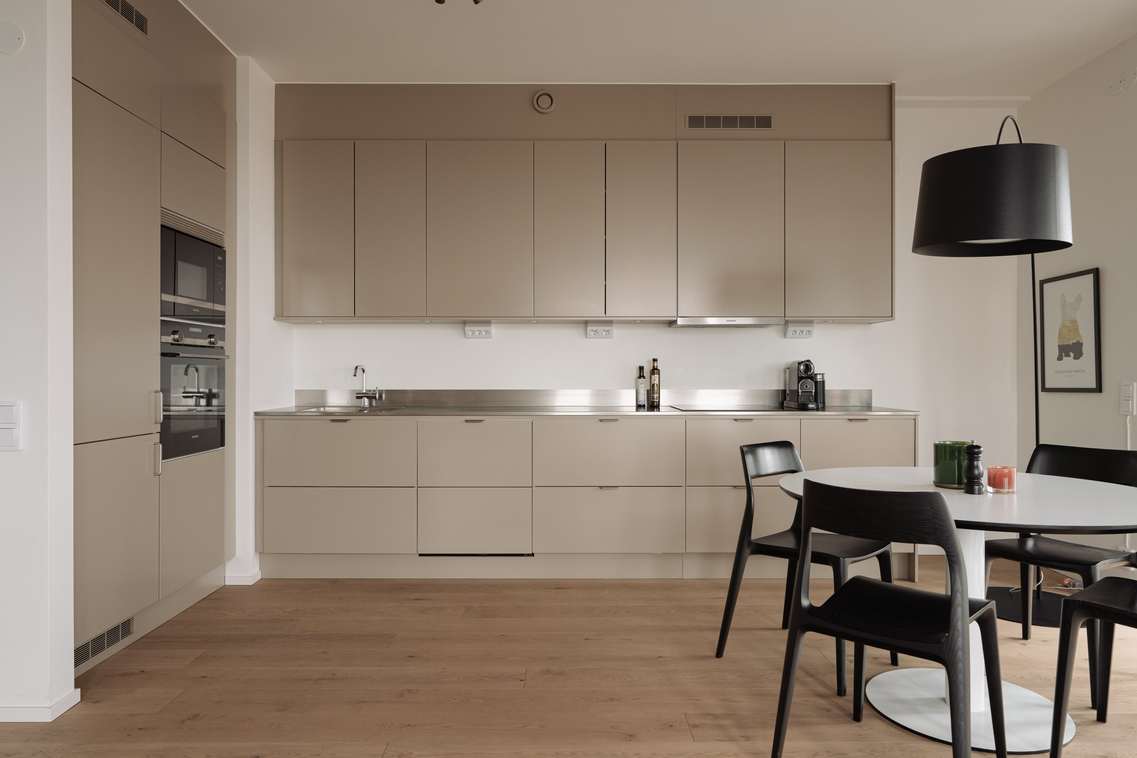 The apartment offers a consistently high standard with a sleek, modern design. The kitchen and living room are arranged in an open-plan layout, featuring a longitudinal terrace with beautiful views. Underfloor heating runs throughout, and deep window niches extend all the way down to the floor.