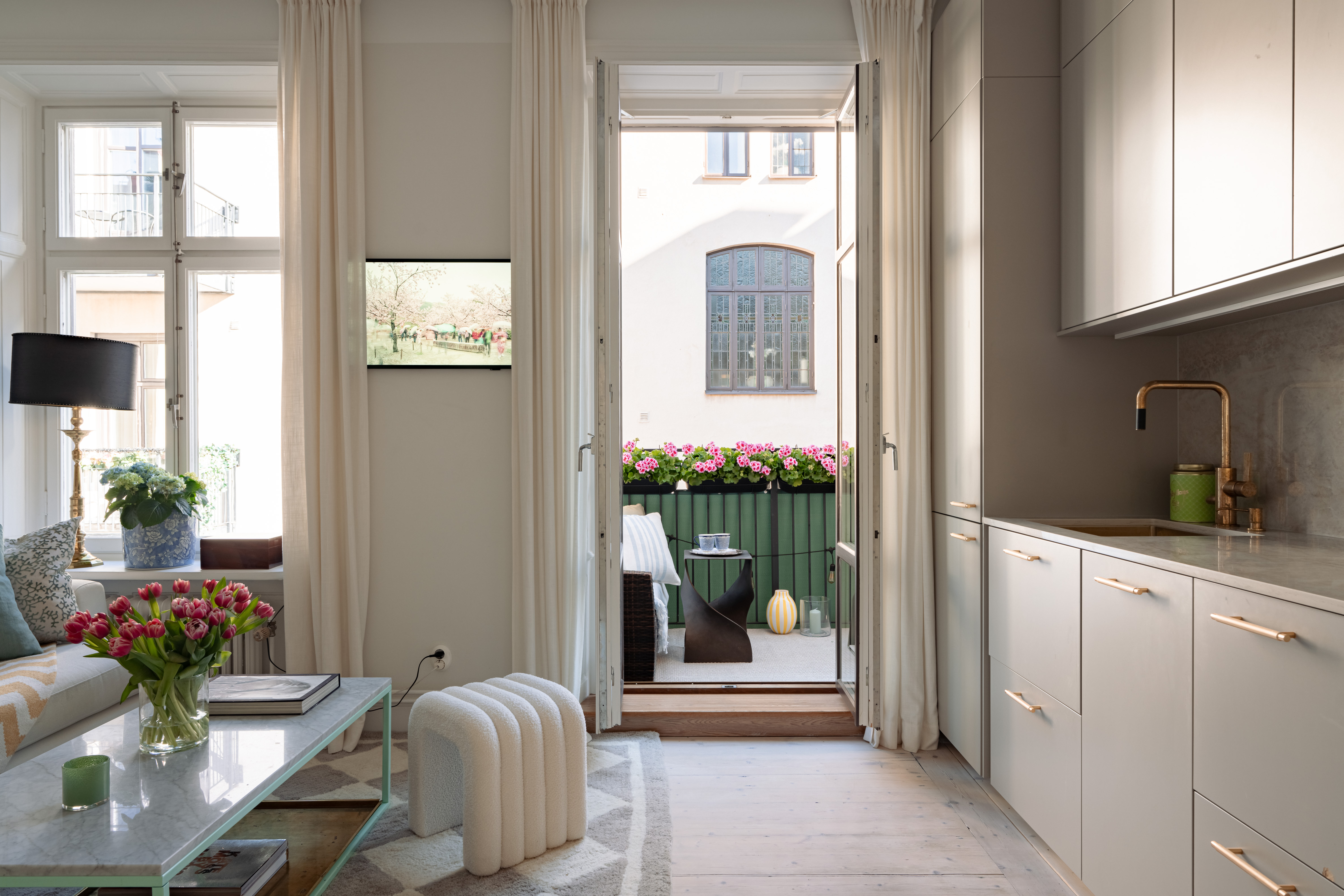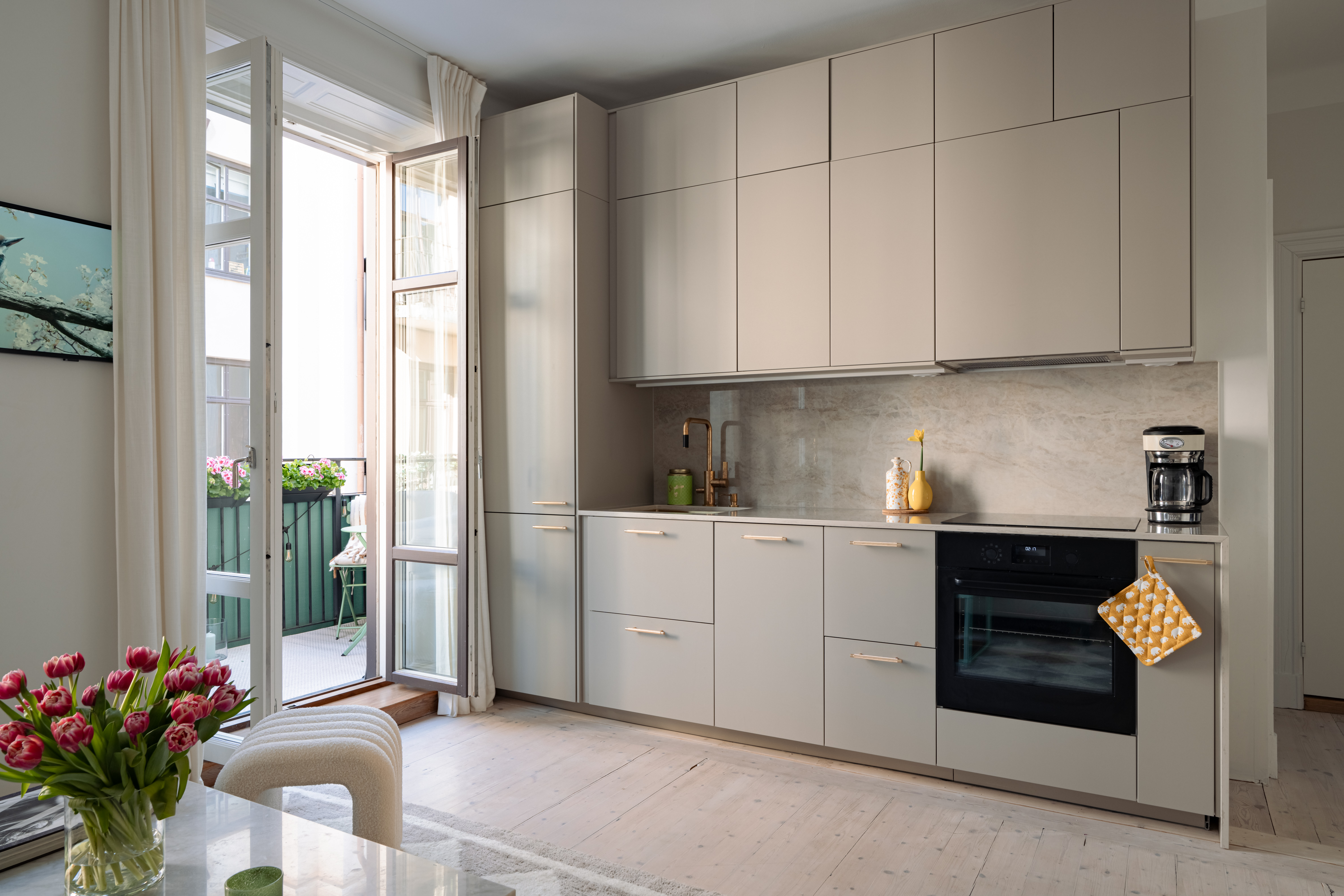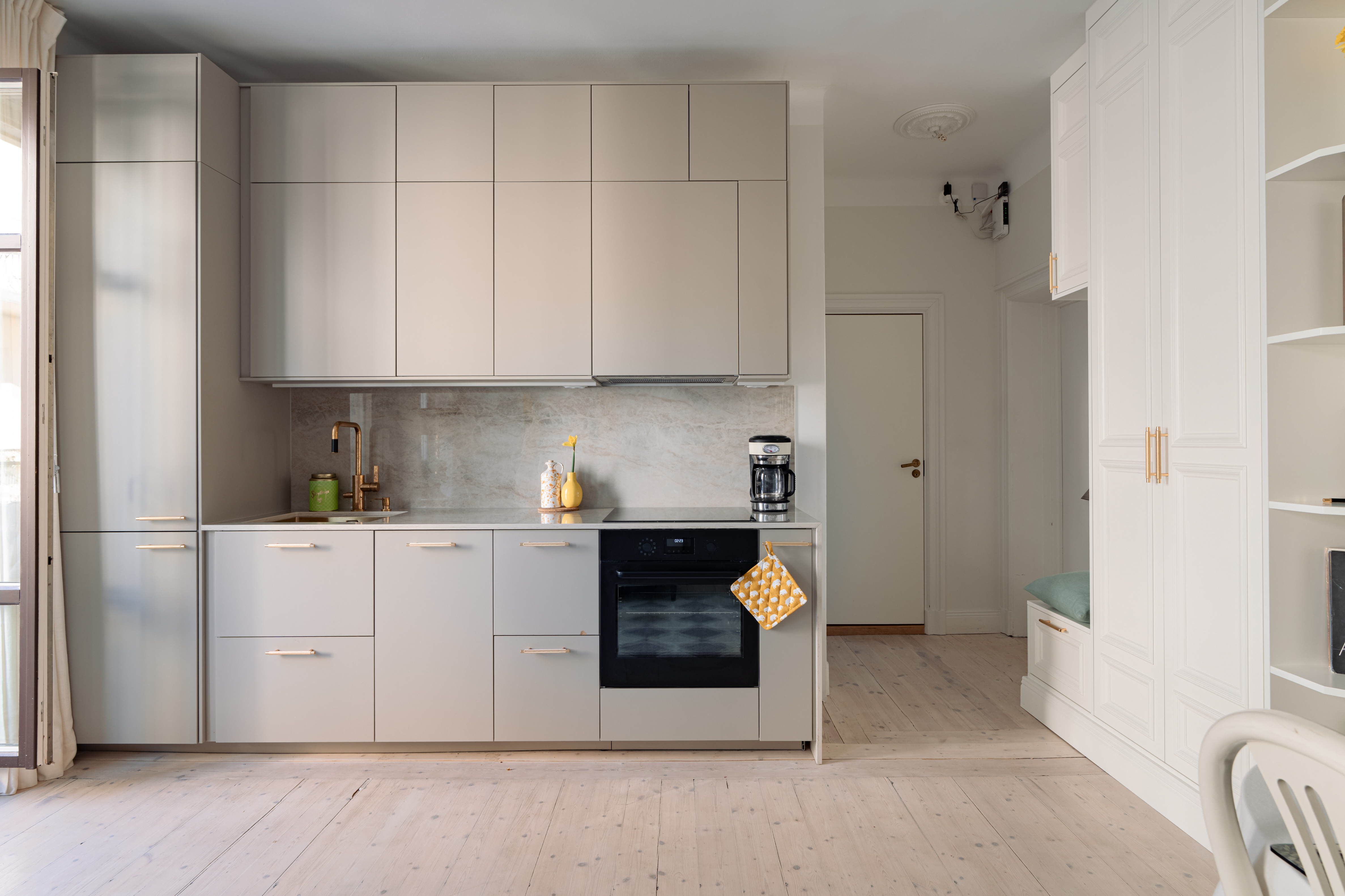 This is a stylish and well-considered home where every detail reflects quality and aesthetics. The kitchen is elegantly designed with an exclusive composite countertop and fittings from Tapwell. The bedroom faces a quiet courtyard and includes custom-built storage that maximizes space in a refined way. In the entrance, you are welcomed by bespoke, built-in storage crafted by a fine carpenter, adding both character and excellent storage solutions. The bathroom is designed in subtle, timeless tones with elegant brass details.