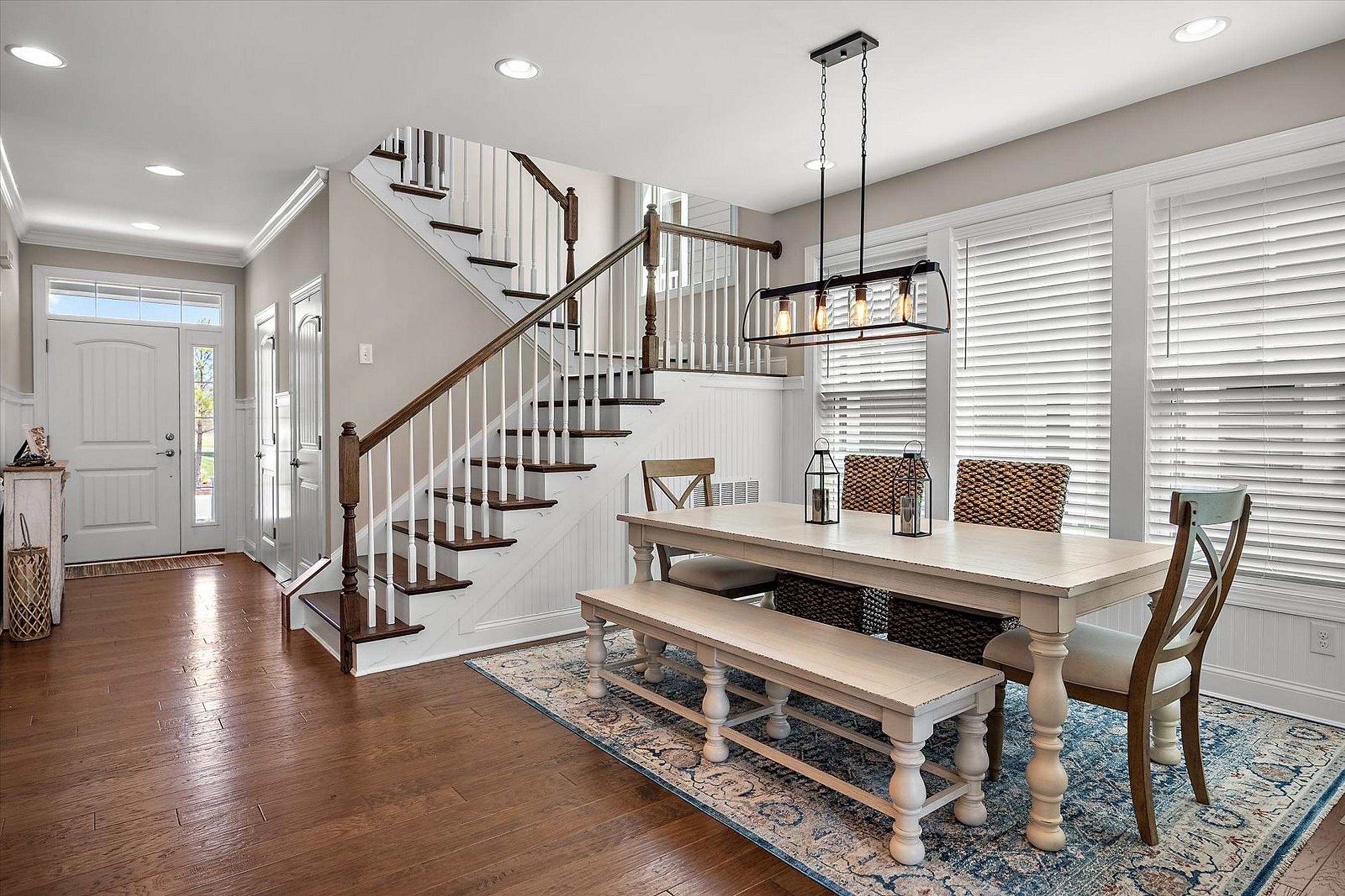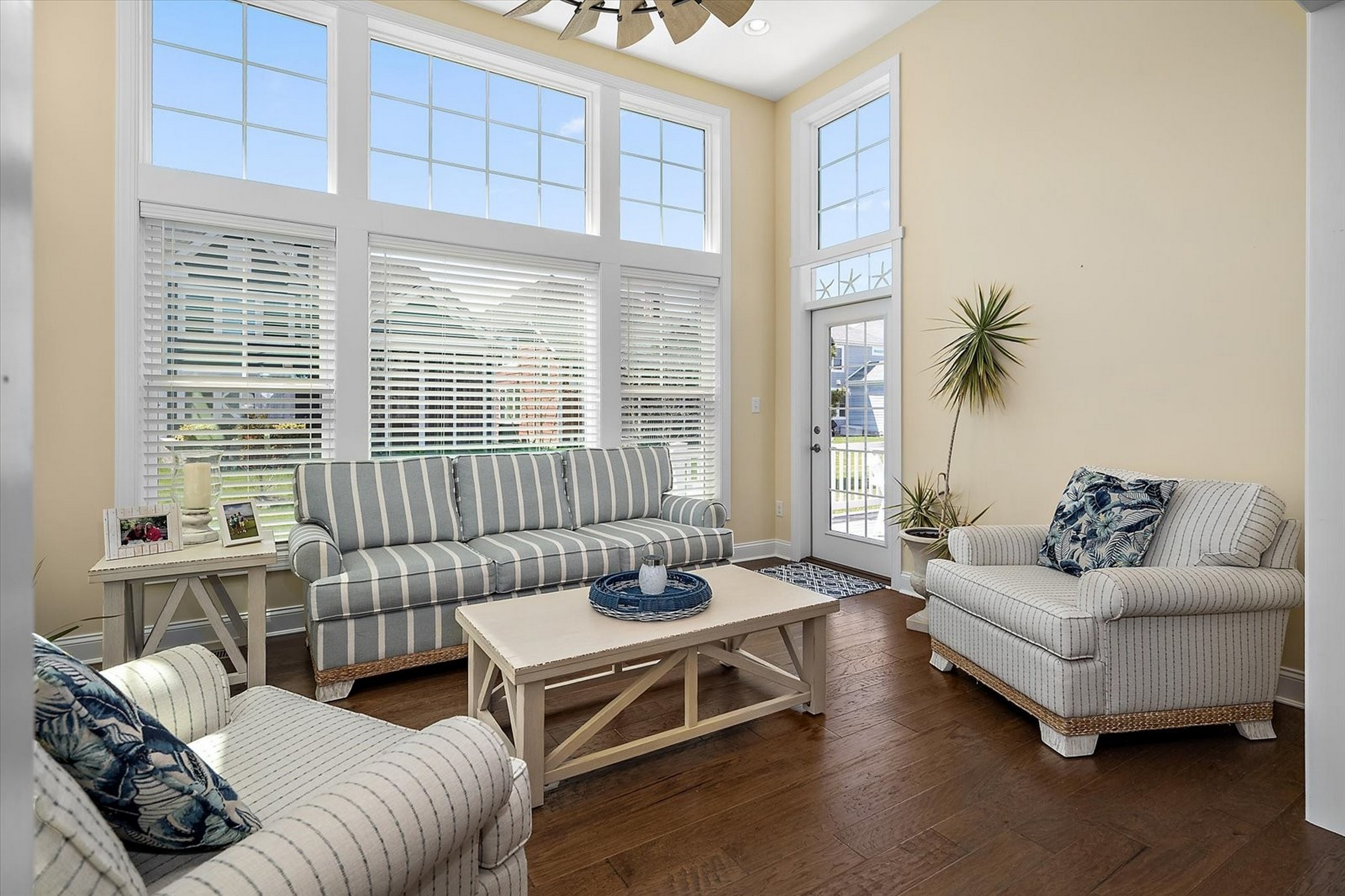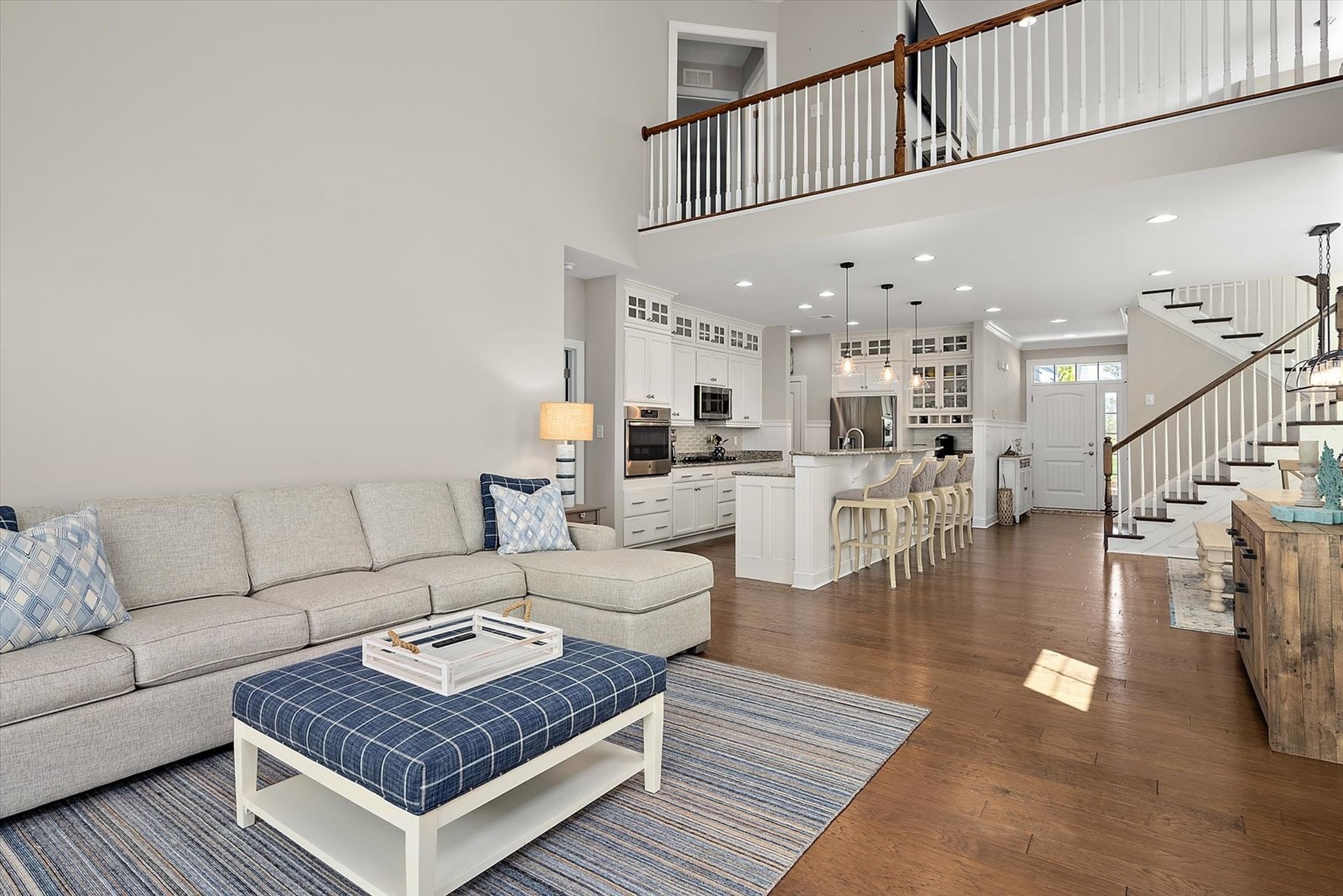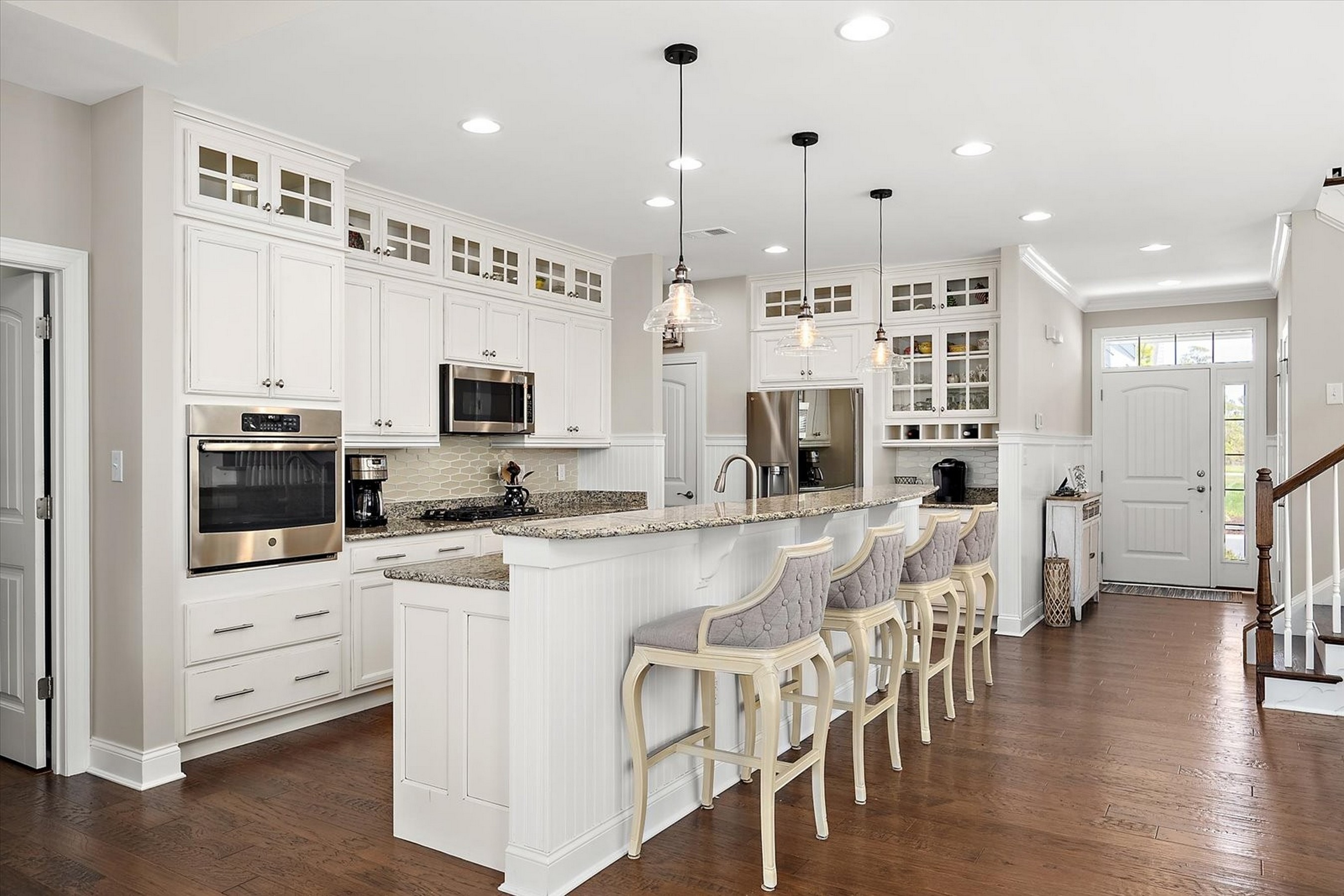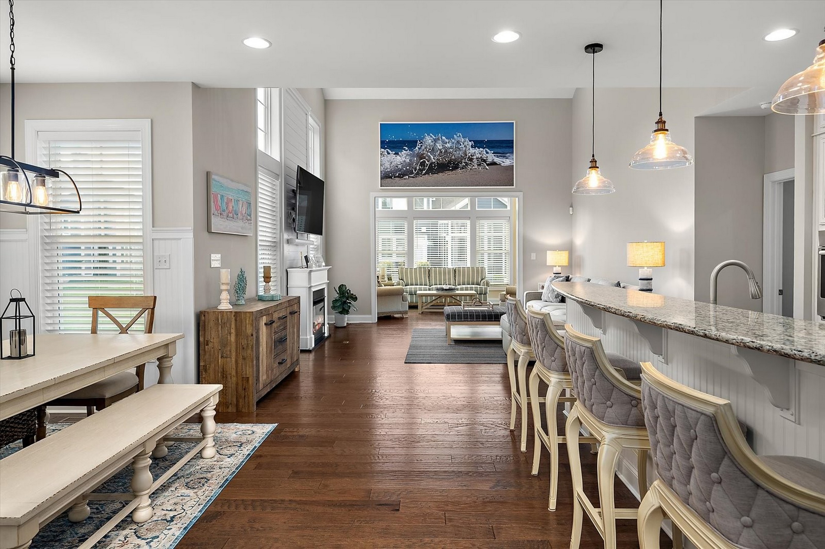 Welcome to 22072 Seaport Square, a stunning Schell Jasmine model nestled in the amenity-rich coastal community of Bayside. This impeccably designed retreat blends modern luxury with relaxed beachside charm—perfect for both entertaining and everyday living. From the moment you step inside, you're greeted by an open-concept floor plan filled with natural light and refined coastal finishes. The heart of the home is the gourmet kitchen, featuring stainless steel appliances, a gas cooktop, glass tile backsplash, granite countertops, a pantry, and a spacious two-tier island—ideal for gathering with family and friends. Just off the kitchen, the dining area provides a welcoming space for casual meals or elegant dinner parties.The main-level primary suite serves as a private oasis, complete with a tray ceiling, two generous walk-in closets, and a spa-inspired ensuite bath with a custom tiled shower, frameless glass door, built-in bench, and dual sink vanity. Additional main-level highlights include a sunroom with vaulted ceilings, a stylish powder room for guests, and a convenient laundry room with interior access to the garage. The great room impresses with soaring ceilings and an elegant switchback staircase leading to the upper level. Upstairs, you'll find a versatile loft, two well-appointed bedrooms that share a full bath, and a fourth bedroom featuring its own private en-suite—perfect for guests or extended family. Located in a thoughtfully planned, resort-style community surrounded by natural coastal beauty, Bayside offers world-class amenities and an exceptional lifestyle. Just minutes from the beaches of Fenwick Island, Bethany Beach, and Ocean City, this home presents the perfect opportunity to enjoy coastal living at its finest.