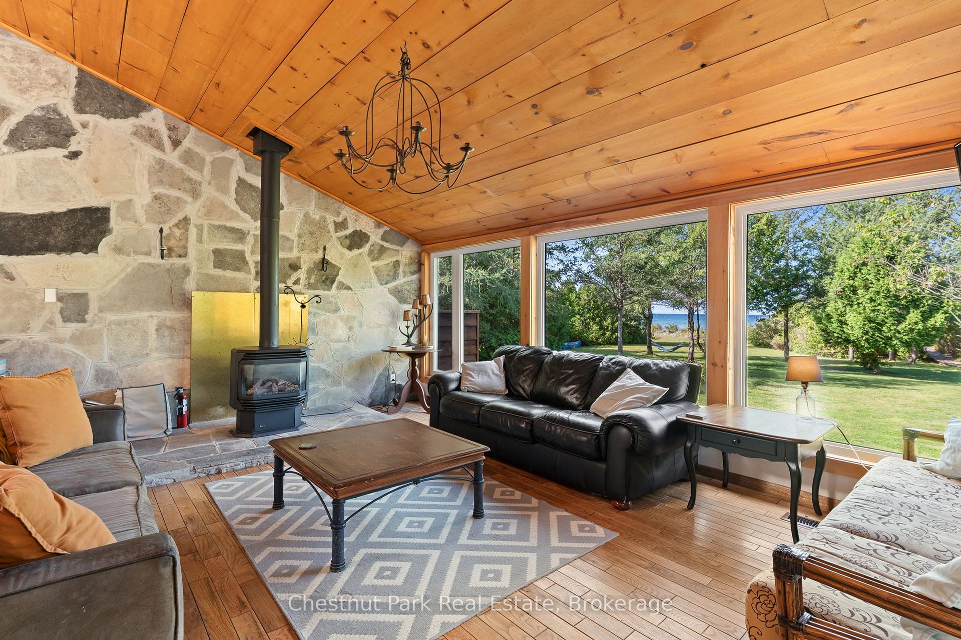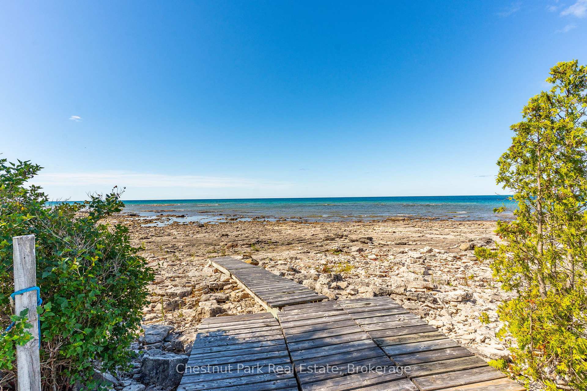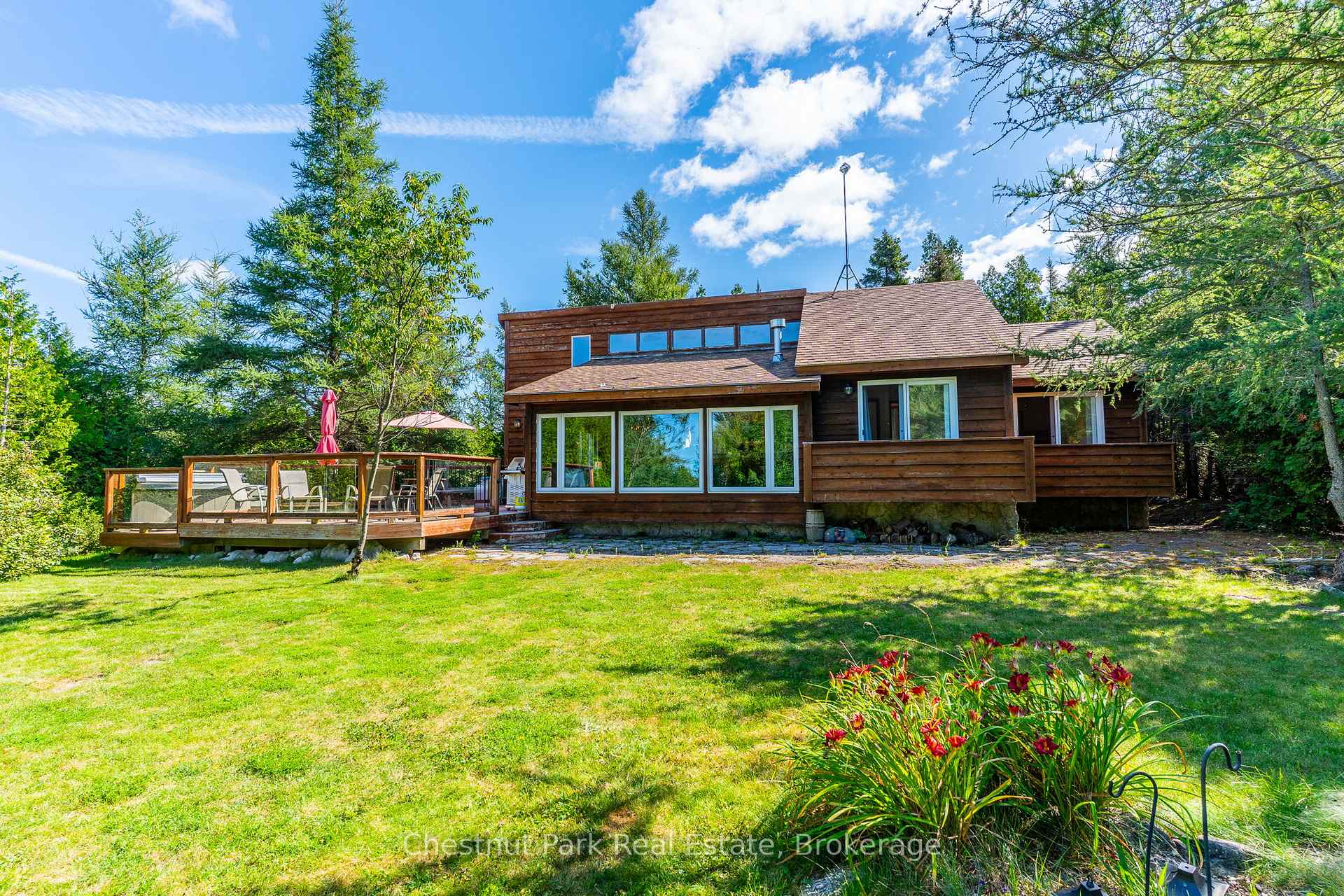 Welcome to your private Waterfront Retreat at Johnston's Harbour on the stunning Bruce Peninsula; close to Tobermory. This exceptional yr-round home showcases a desired Viceroy style & is conveniently located on a municipally maintained, yr-round road, offering both comfort & accessibility in a spectacular natural setting. Designed to capture breathtaking water views, the home features 2 bedrooms, each with its own private balcony overlooking the lake. The primary bedroom includes a private ensuite, while the spacious main bath offers a corner Jacuzzi tub & separate shower; perfect for relaxing after a day in the sunshine. The open-concept kitchen & dining area overlook the impressive great room, highlighted by soaring vaulted ceilings, a fireplace & expansive windows that frame the waterfront beyond, creating a bright living space ideal for entertaining. Step outside to a tiered waterside deck complete with a new hot tub (2025), where you can unwind under incredible star-filled skies while listening to the gentle waves. Located on almost 1 acre, this property offers excellent outdoor living with a large grassy area & unique SANDY BEACH, ideal for kids & pets to play. The prime waterfront features clear, shallow water & a flat rock shore, perfect for swimming, exploring and enjoying spectacular sunset views. A detached, finished 10' x 14' Bunkie with covered porch provides overflow accommodation for guests, while the detached workshop/shed offers ample storage for tools & water toys. Under 30 mins from Tobermory, this property places you in the heart of the renowned Bruce Peninsula; a premier destination known for camping, hiking, fishing & natural beauty. Nearby attractions; Bruce Peninsula National Park, Fathom Five National Marine Park, Bruce Peninsula Bird Observatory & the iconic Bruce Trail. Whether you're seeking a year-round home, cottage or investment opportunity, this remarkable waterfront home comes fully furnished and ready to make forever memories. Refrigerator, Stove, Dishwasher, Hood Fan, Microwave, 4 Bar stools, Stackable Washer & Dryer, Water Softener, UV Water Filtration system, Electric Hot Water Heater, TV & Bracket on Great room wall, Hot tub (New Summer 2025), All House & Shed & Bunkie Contents as seen and in AS-IS condition.