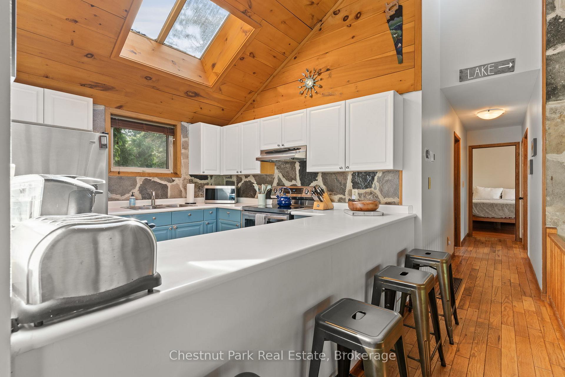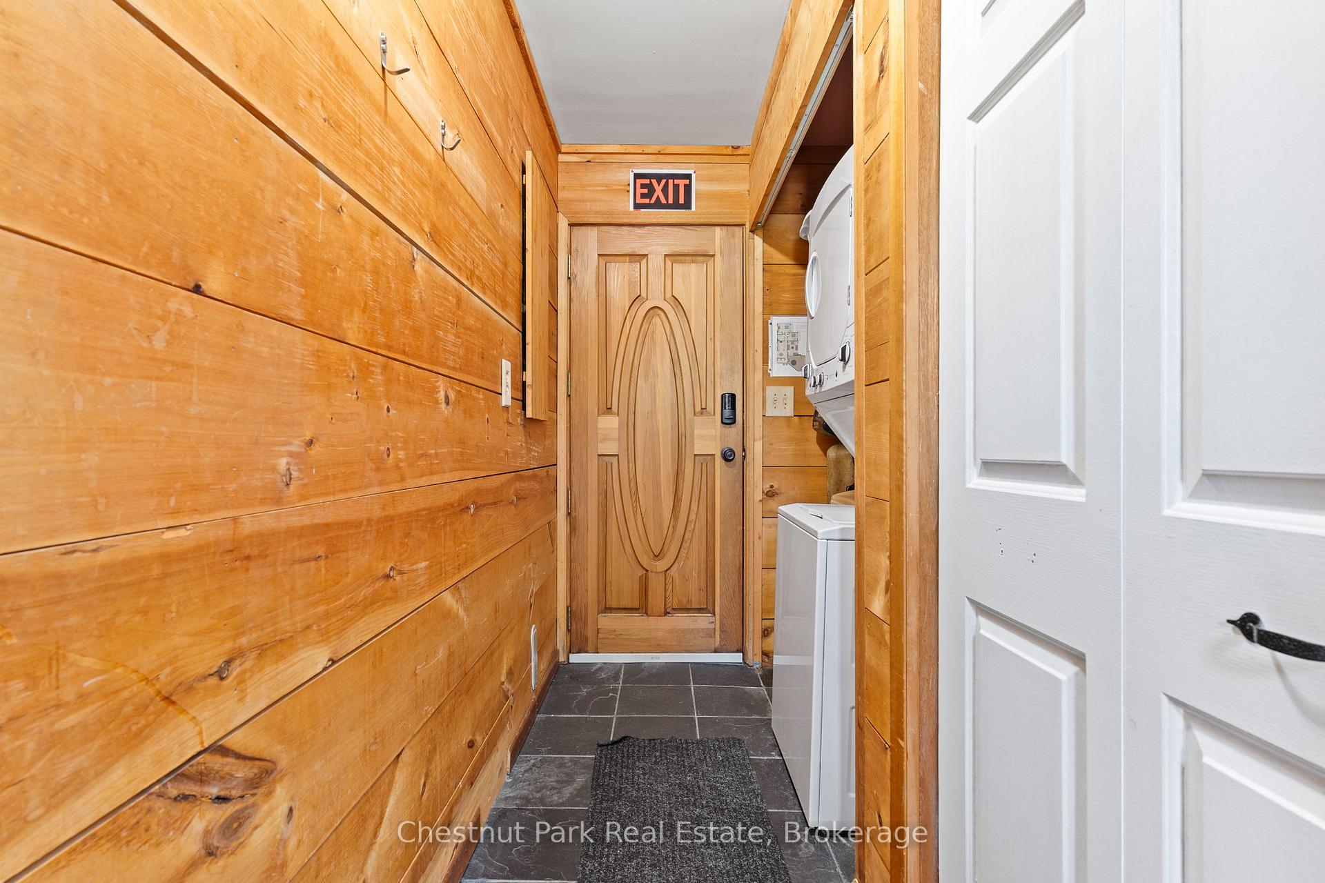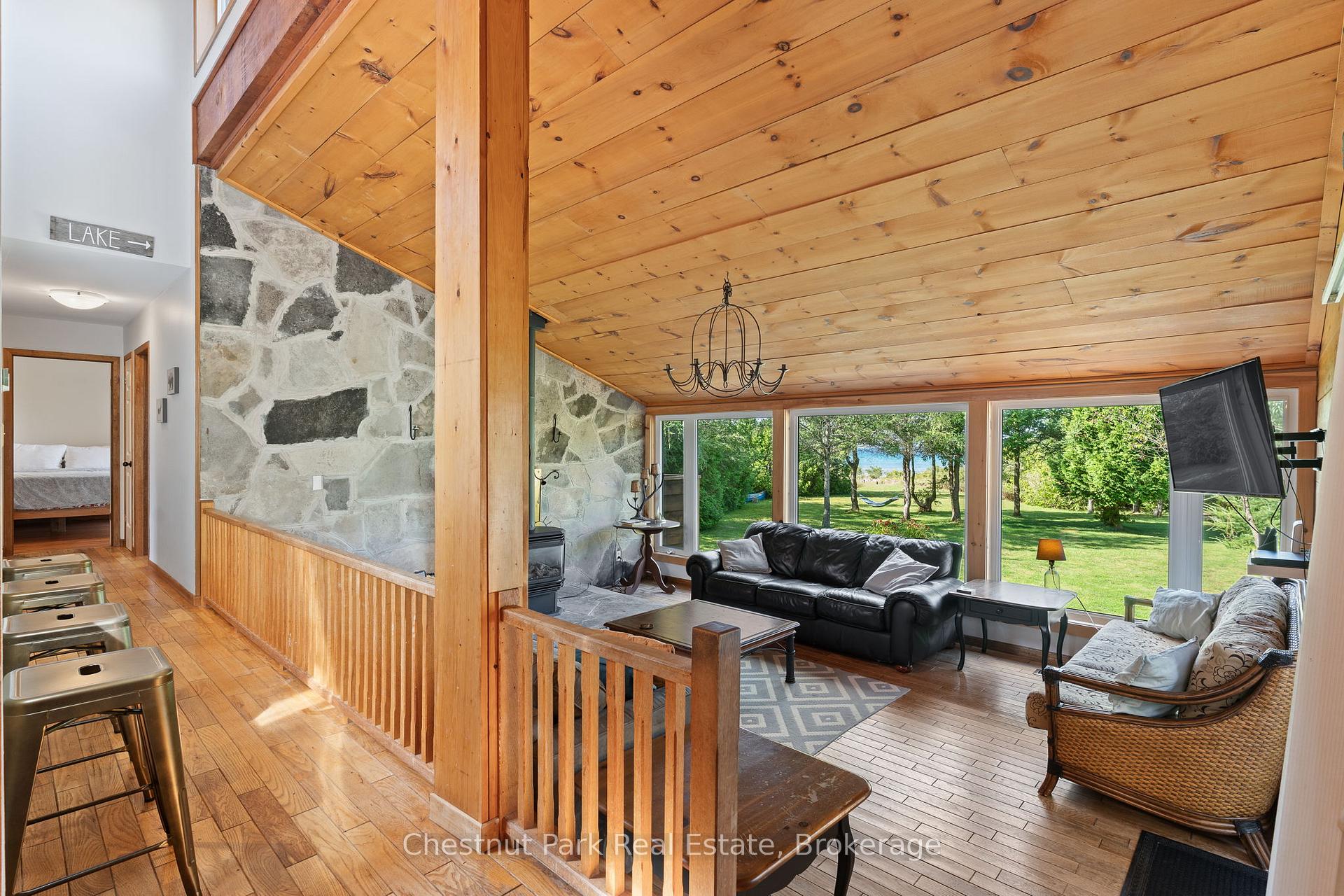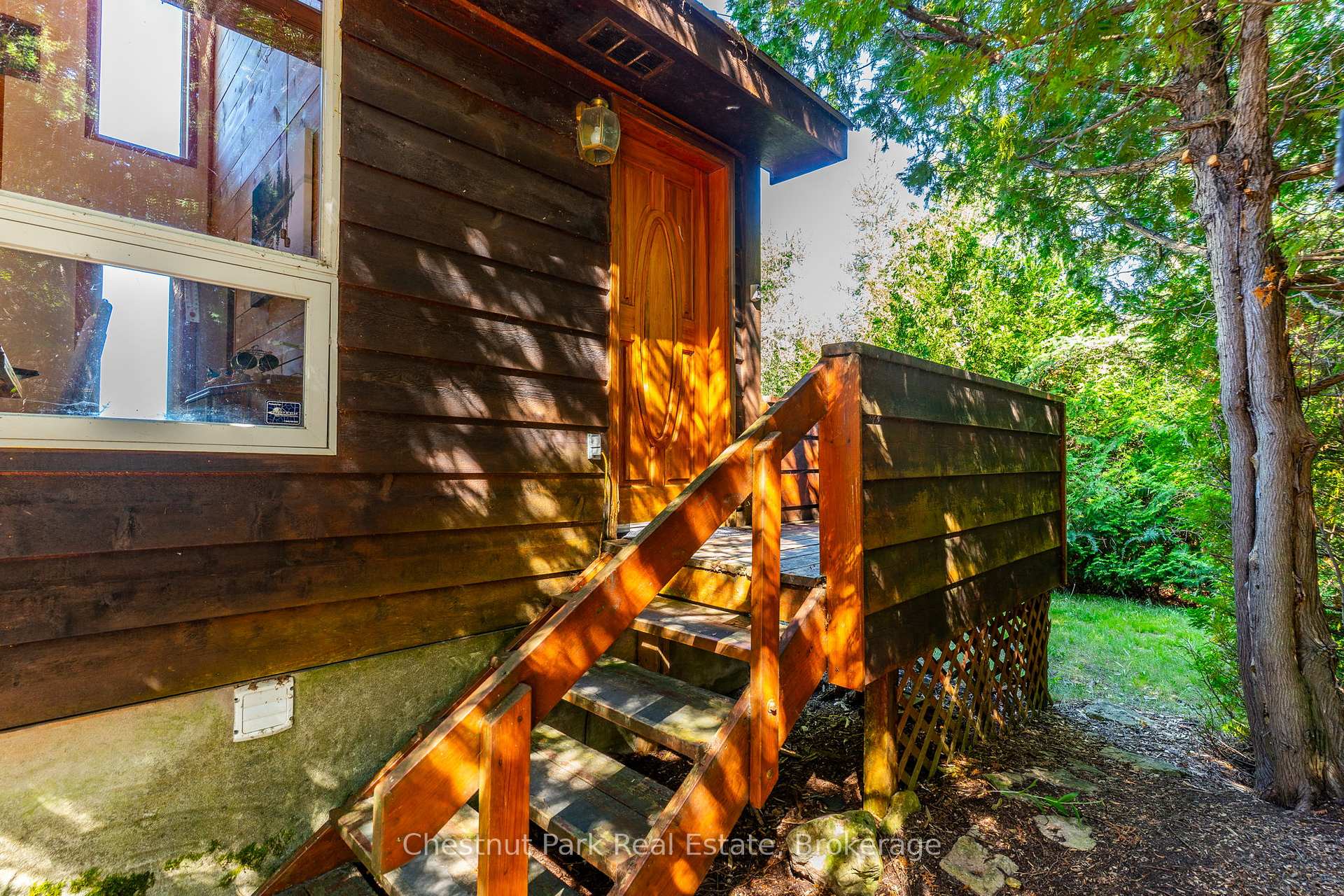 Welcome to your private Waterfront Retreat at Johnston's Harbour on the stunning Bruce Peninsula; close to Tobermory. This exceptional yr-round home showcases a desired Viceroy style & is conveniently located on a municipally maintained, yr-round road, offering both comfort & accessibility in a spectacular natural setting. Designed to capture breathtaking water views, the home features 2 bedrooms, each with its own private balcony overlooking the lake. The primary bedroom includes a private ensuite, while the spacious main bath offers a corner Jacuzzi tub & separate shower; perfect for relaxing after a day in the sunshine. The open-concept kitchen & dining area overlook the impressive great room, highlighted by soaring vaulted ceilings, a fireplace & expansive windows that frame the waterfront beyond, creating a bright living space ideal for entertaining. Step outside to a tiered waterside deck complete with a new hot tub (2025), where you can unwind under incredible star-filled skies while listening to the gentle waves. Located on almost 1 acre, this property offers excellent outdoor living with a large grassy area & unique SANDY BEACH, ideal for kids & pets to play. The prime waterfront features clear, shallow water & a flat rock shore, perfect for swimming, exploring and enjoying spectacular sunset views. A detached, finished 10' x 14' Bunkie with covered porch provides overflow accommodation for guests, while the detached workshop/shed offers ample storage for tools & water toys. Under 30 mins from Tobermory, this property places you in the heart of the renowned Bruce Peninsula; a premier destination known for camping, hiking, fishing & natural beauty. Nearby attractions; Bruce Peninsula National Park, Fathom Five National Marine Park, Bruce Peninsula Bird Observatory & the iconic Bruce Trail. Whether you're seeking a year-round home, cottage or investment opportunity, this remarkable waterfront home comes fully furnished and ready to make forever memories. Refrigerator, Stove, Dishwasher, Hood Fan, Microwave, 4 Bar stools, Stackable Washer & Dryer, Water Softener, UV Water Filtration system, Electric Hot Water Heater, TV & Bracket on Great room wall, Hot tub (New Summer 2025), All House & Shed & Bunkie Contents as seen and in AS-IS condition.