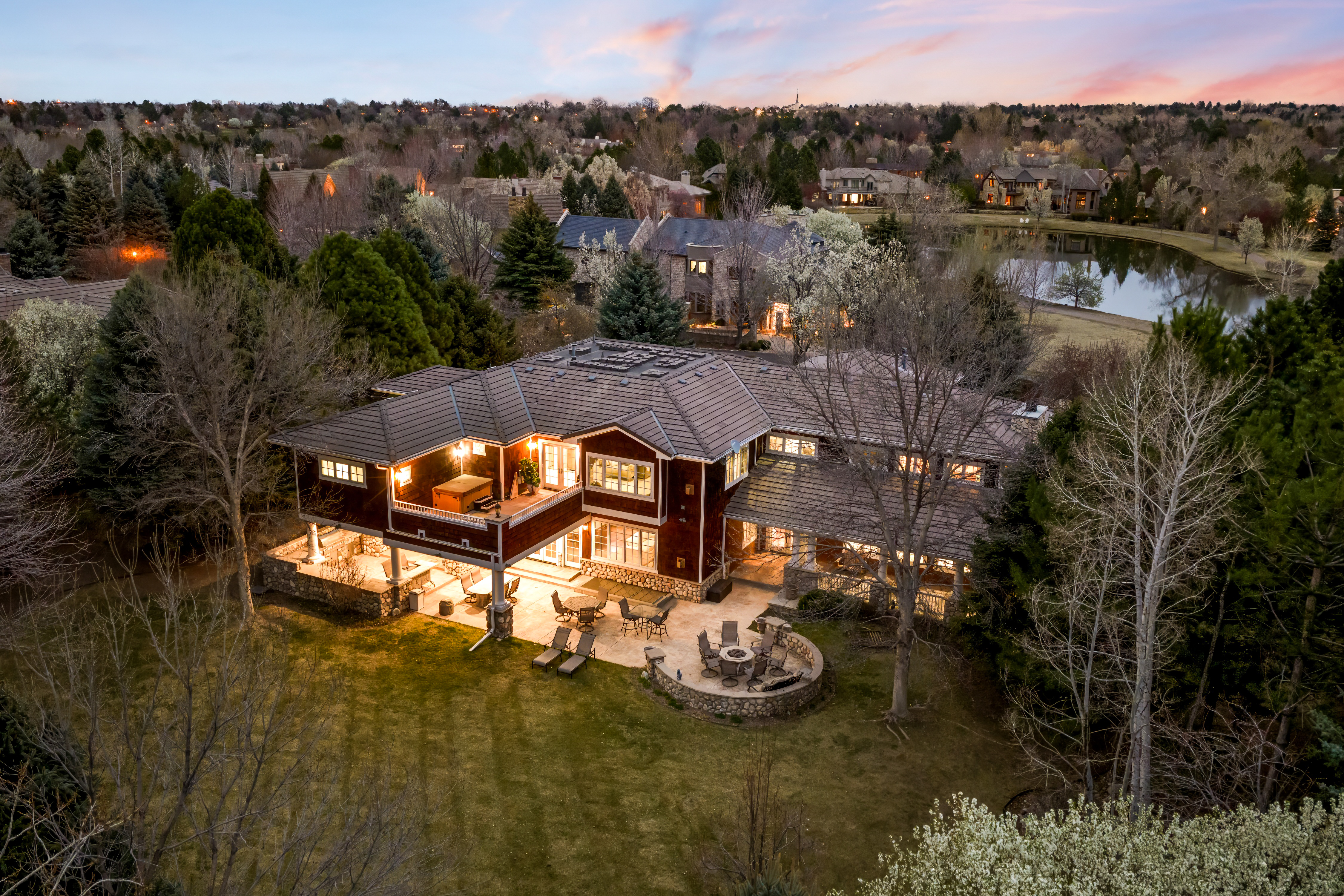 Set on a quiet cul-de-sac in Buell Mansion, 7 Waterside Terrace makes a strong first impression with its inviting circular drive. Framed by mature landscaping, the residence is thoughtfully positioned to take in mountain views and the peaceful setting of Buell Lake. Expansively covered porches and terraces create seamless indoor-outdoor living, offering inviting spaces to gather or unwind. Inside, warm wood floors and a welcoming entry set the tone for comfortable, elevated living. The great room features beamed ceilings and a fireplace, connecting easily to a well-appointed kitchen with premium appliances, ample workspace, and both butler’s and walk-in pantries—designed for everyday living as well as entertaining. The home includes 6-bedroom suites, each with its own bath and walk-in closet. Five are located upstairs, including a spacious primary suite with dual vanities, two walk-in closets, and a steam shower. A private lower-level guest suite provides added flexibility. Additional features include two main-floor studies, multiple laundry areas, a mudroom with built-in storage, and a four-car garage. The lower level offers space to relax and recharge with a fitness area, game room, bar, and theater. Outdoors, the landscaped grounds are anchored by a covered kitchen with a built-in grill, dining area, and fire feature—ideal for enjoying Colorado evenings. Conveniently located near Denver, this home combines privacy, comfort, and thoughtful design.