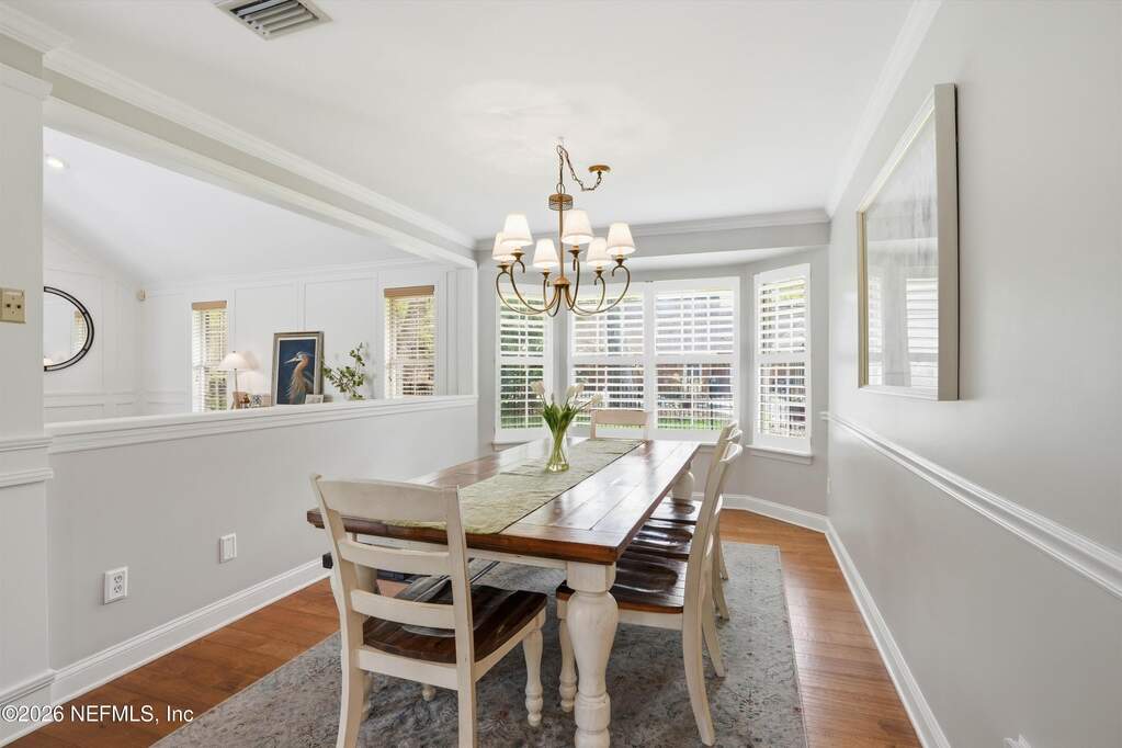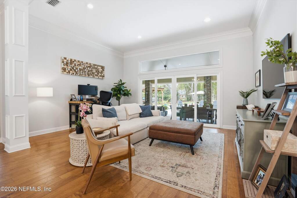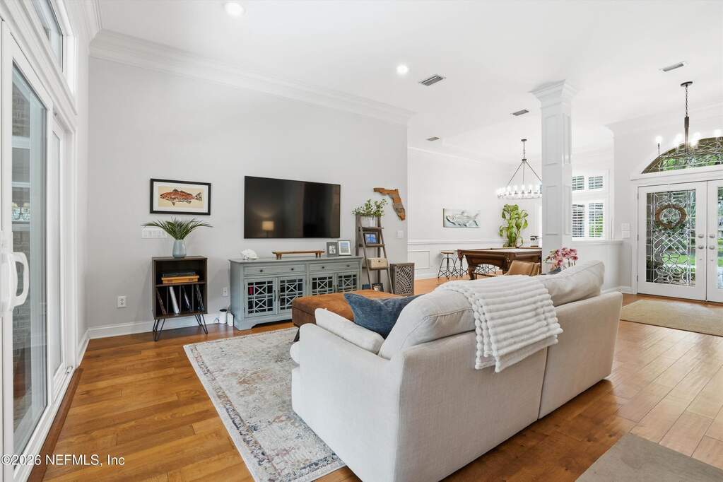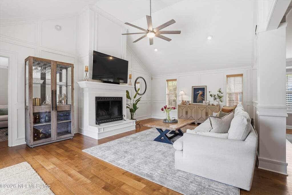 Welcome to Bayside living at its finest! This beautifully updated all-brick home offers 4 bedrooms / 3 baths, completely renovated with modern finishes throughout. Double entry doors open to a bright, inviting foyer with rich wood floors that flow seamlessly through the main living areas. Spacious family room features vaulted ceilings, a charming wood-burning fireplace, and stunning views of the newly added saltwater pool, perfect for entertaining or relaxing. The thoughtfully designed layout offers a split bedroom floor plan, and both open gathering spaces and private retreats. Step outside to your resort-style oasis and enjoy Florida living year-round. Located in a charming gated community with tree-lined streets, residents can enjoy the pool, clubhouse, tennis courts, playground, kayak launch, and access to the community dock on the St. Johns River with the most beautiful sunsets! Water included in the HOA. Top-rated school district in the state, and a truly exceptional lifestyle.