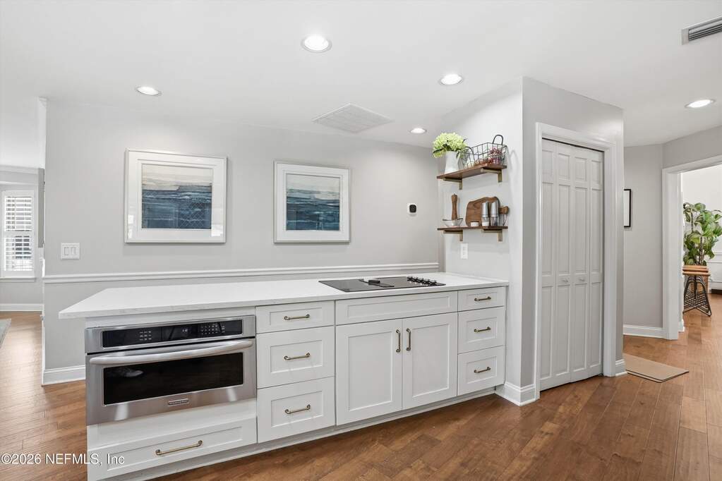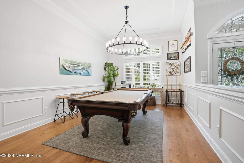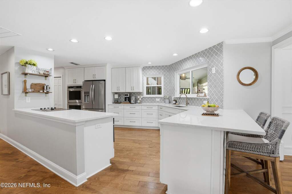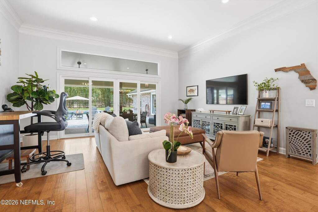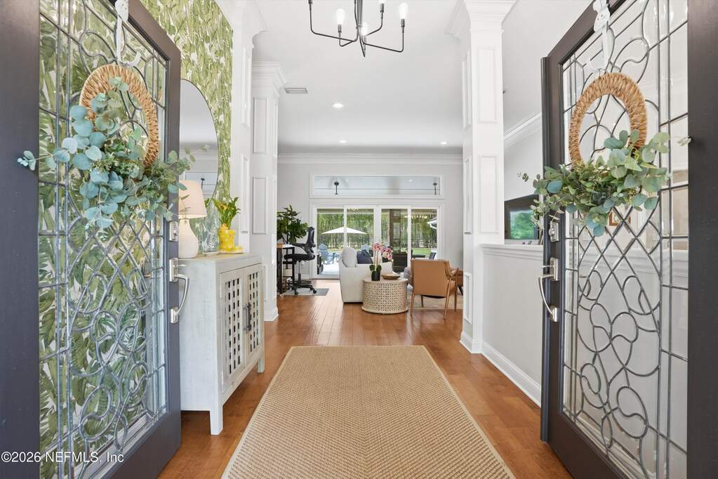 Welcome to Bayside living at its finest! This beautifully updated all-brick home offers 4 bedrooms / 3 baths, completely renovated with modern finishes throughout. Double entry doors open to a bright, inviting foyer with rich wood floors that flow seamlessly through the main living areas. Spacious family room features vaulted ceilings, a charming wood-burning fireplace, and stunning views of the newly added saltwater pool, perfect for entertaining or relaxing. The thoughtfully designed layout offers a split bedroom floor plan, and both open gathering spaces and private retreats. Step outside to your resort-style oasis and enjoy Florida living year-round. Located in a charming gated community with tree-lined streets, residents can enjoy the pool, clubhouse, tennis courts, playground, kayak launch, and access to the community dock on the St. Johns River with the most beautiful sunsets! Water included in the HOA. Top-rated school district in the state, and a truly exceptional lifestyle.