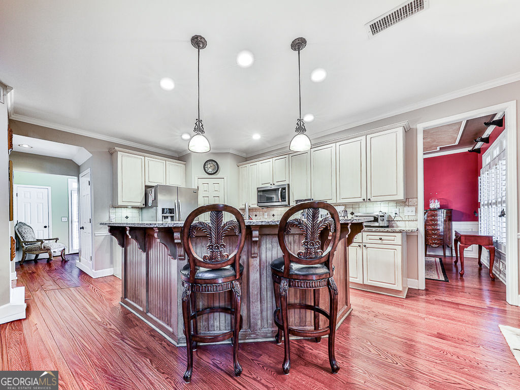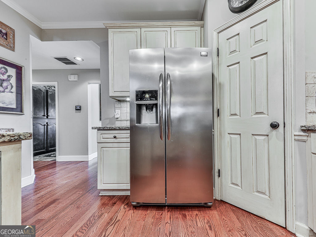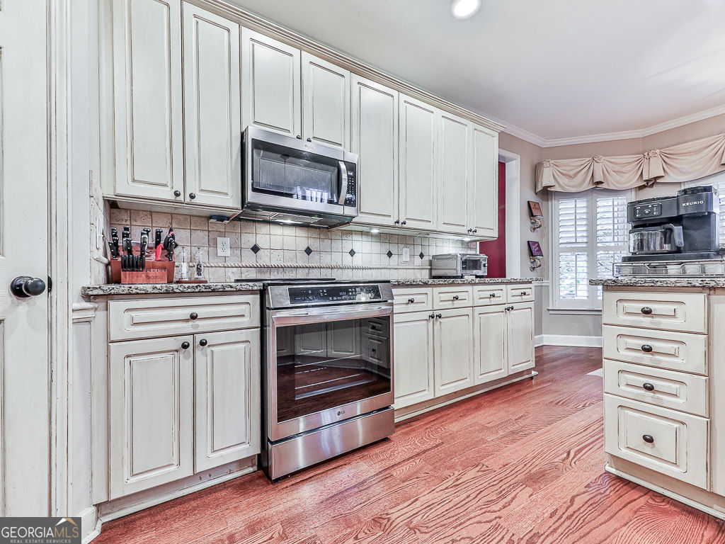 Step into a home that effortlessly blends comfort, and space-designed for both everyday living and unforgettable gatherings. From the moment you enter, the open floor plan and rich hardwood floors create a warm, inviting atmosphere, while the dramatic two-story family room with custom built-in bookcases serves as a lovely centerpiece. The updated kitchen with newer induction stove, with gas hookup flows seamlessly into the eating area and spacious sunroom, making it the perfect hub for entertaining or simply enjoying quiet mornings. Just beyond, a covered porch overlooks a private, fenced backyard-your own peaceful retreat. Every detail has been considered, from the custom laundry room with abundant cabinetry and storage to the formal living and dining rooms that offer timeless charm. Upstairs, the oversized primary suite is a true sanctuary, complete with a generous sitting area and dual closets, while the secondary bedrooms provide ample space for family or guests. Plantation shutters throughout add a refined touch, and the new roof and full lawn irrigation system ensure peace of mind and easy maintenance. The garage goes above and beyond with a dedicated workshop and additional storage area-perfect for hobbies, projects, or keeping everything neatly organized. Ideally located just minutes from downtown Woodstock, as well as nearby parks and trails, this home offers the perfect balance of convenience and tranquility.