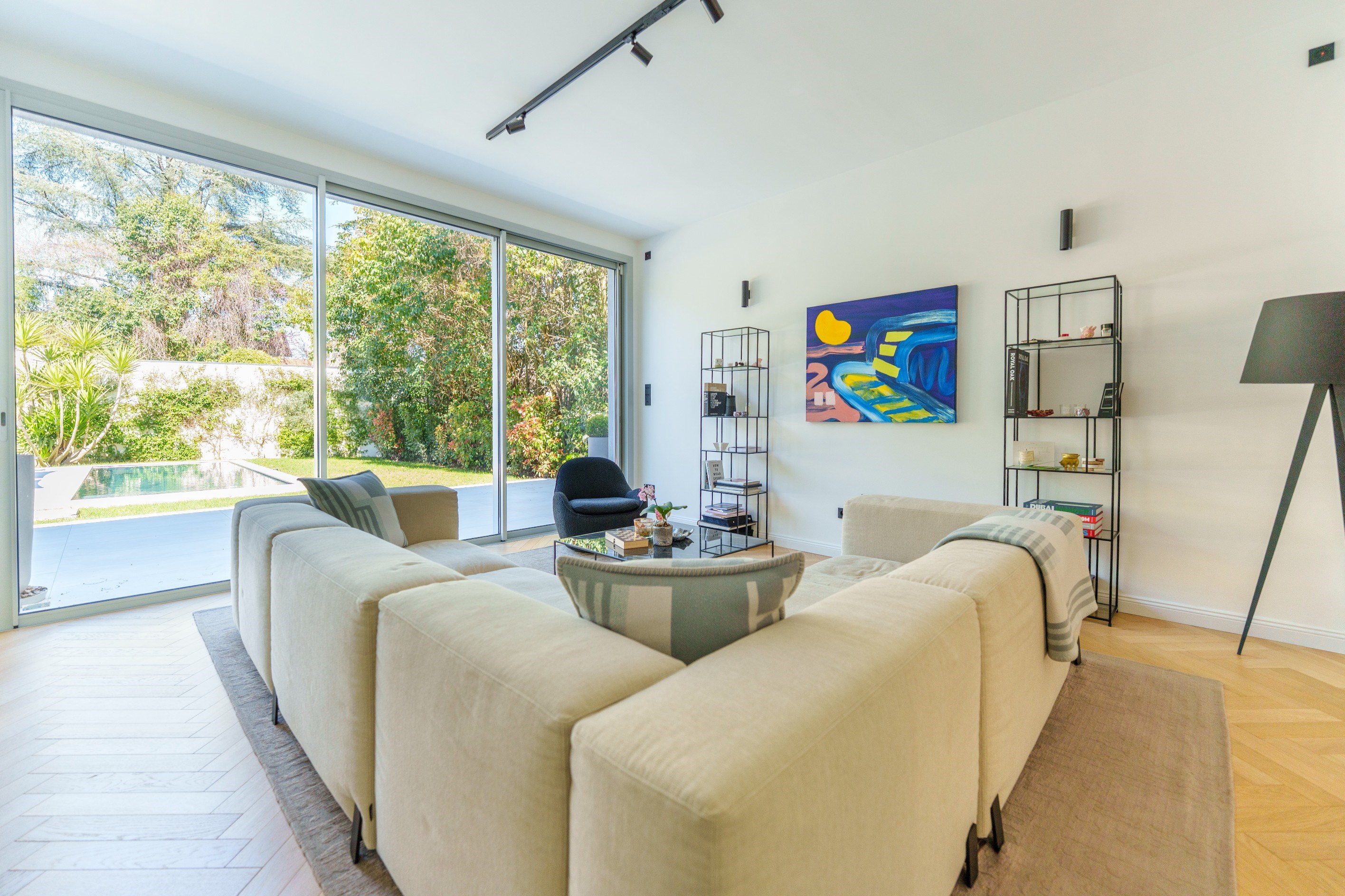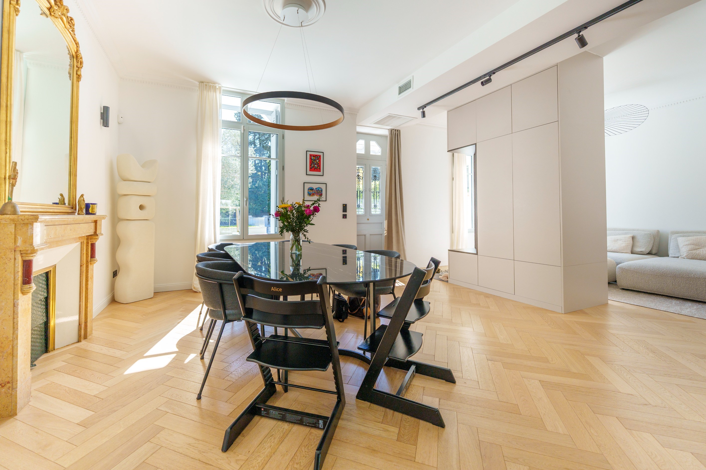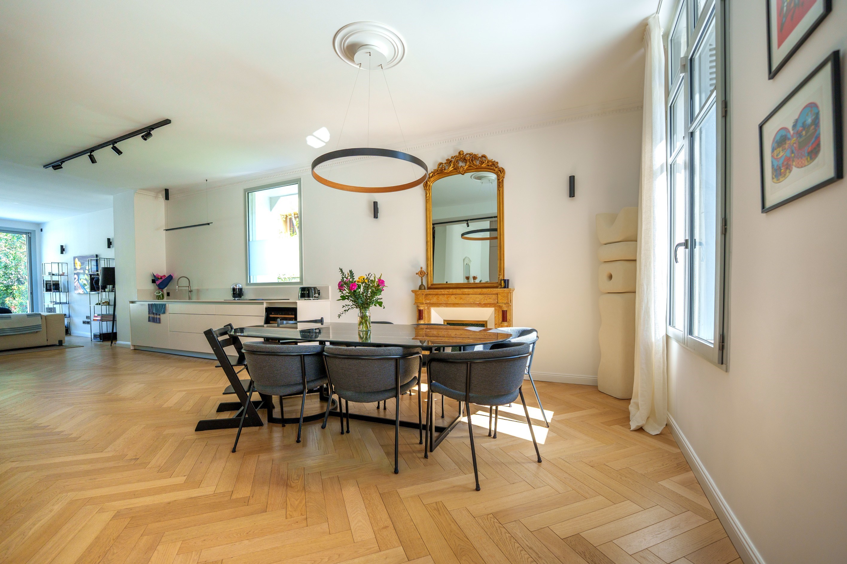 In one of Montpellier’s most iconic and sought-after neighborhoods, Montpellier Sotheby’s International Realty is pleased to present an exclusive property where the charm of the past harmonizes with an exceptional contemporary renovation. Tucked away from prying eyes, in the heart of a quiet, leafy setting, this home offers over 200 m² of living space, thoughtfully designed around spacious rooms and abundant natural light. From the moment you step inside, elegance takes center stage: a spacious, open-concept reception area with clean lines opens onto the outdoors through large, custom-made floor-to-ceiling windows. The kitchen, featuring high-end finishes, blends seamlessly with a dining room, an intimate and cozy living room, and a second living room of ideal proportions, naturally extending the living space toward the terrace, garden, and pool. A wing, designed as a separate space, currently houses an office and a wellness area with a gym and sauna. Adaptable to suit your needs, it offers the possibility of creating a ground-floor suite opening onto the pool. Upstairs, three elegant bedrooms offer comfort and serenity. Two of them share a meticulously finished bathroom, while the third has its own en-suite bathroom, ensuring privacy and functionality. The top floor reveals a remarkable master suite, a true sanctuary under the eaves, where spacious rooms, custom storage, and a refined en-suite bathroom create a serene