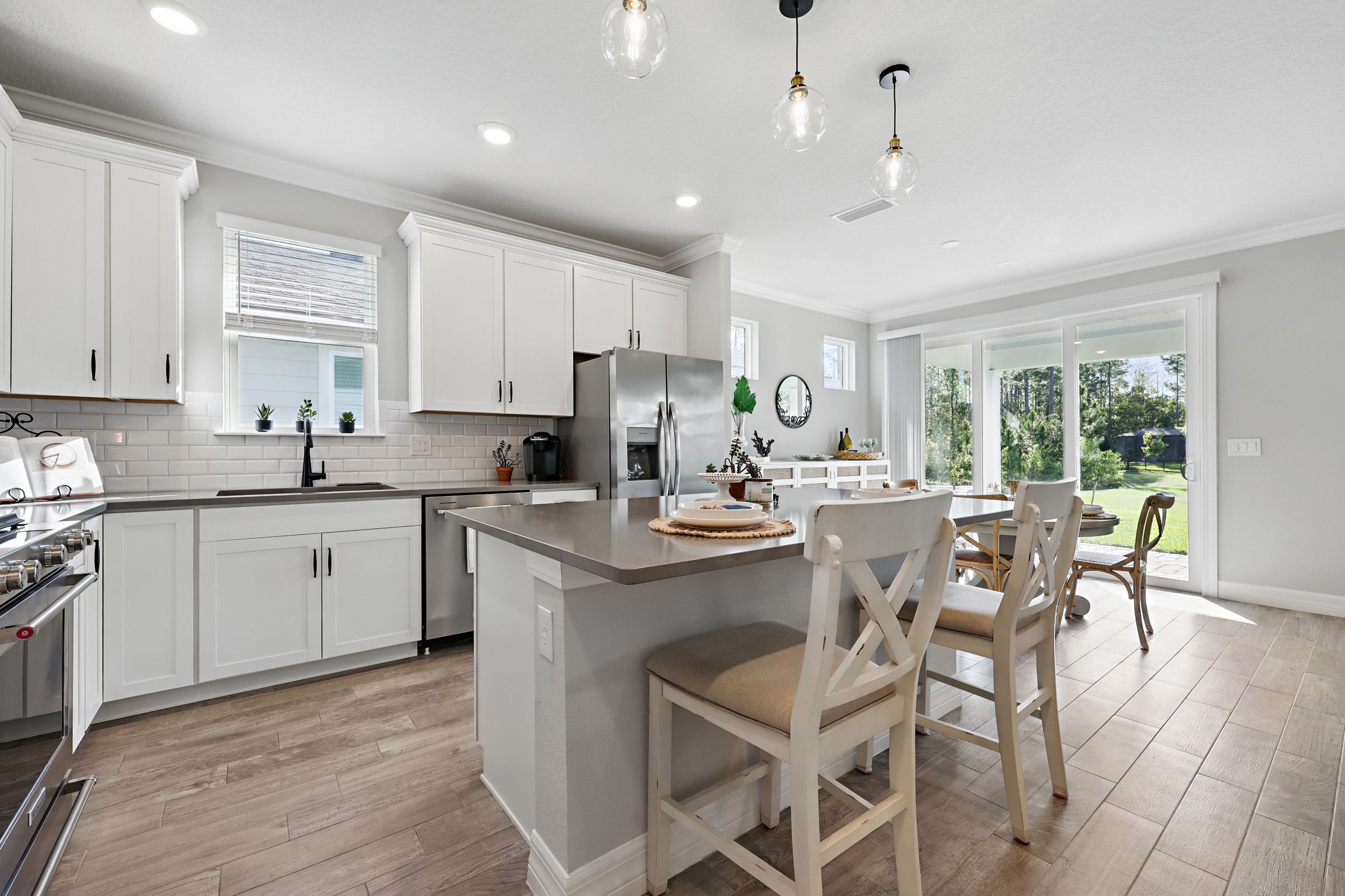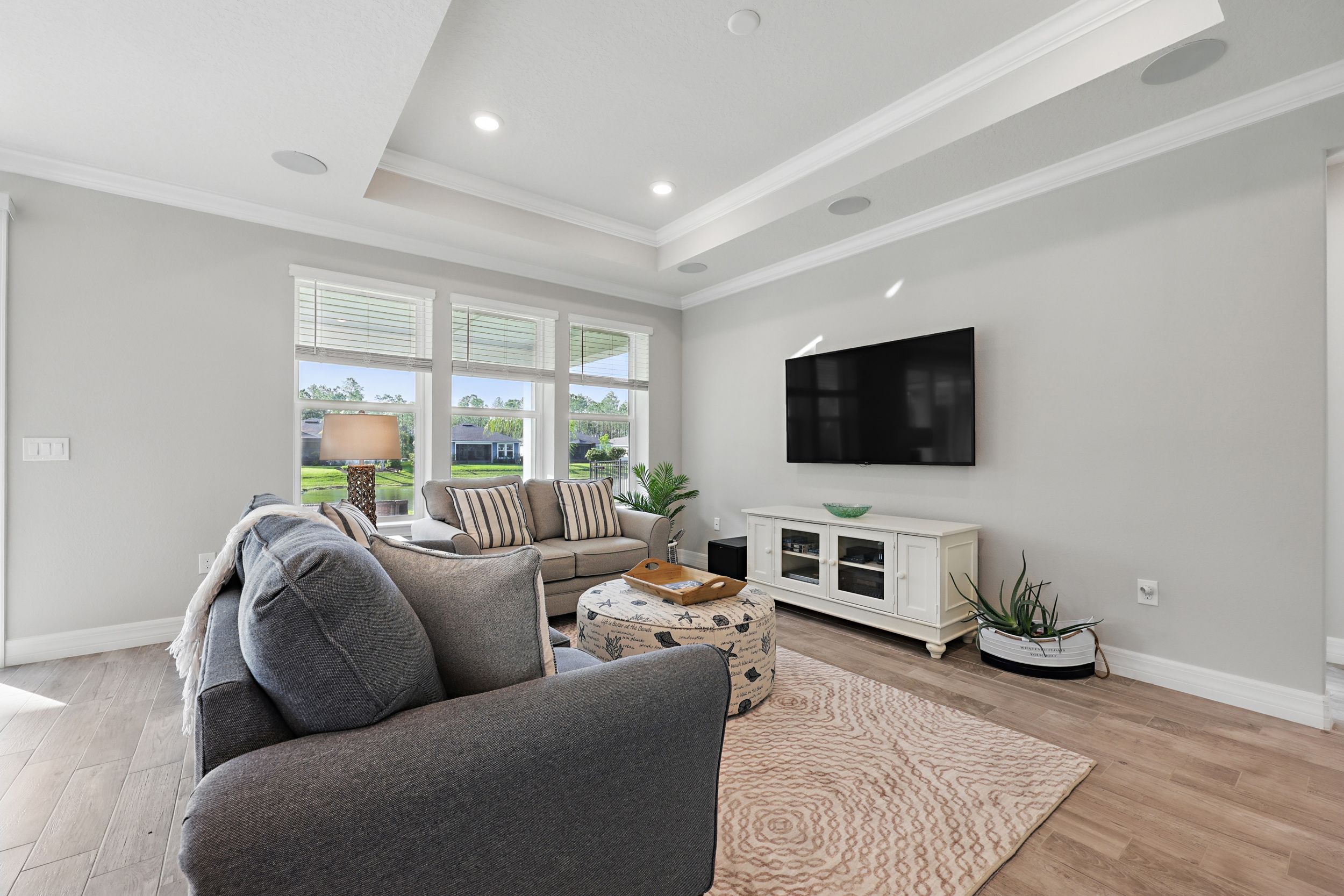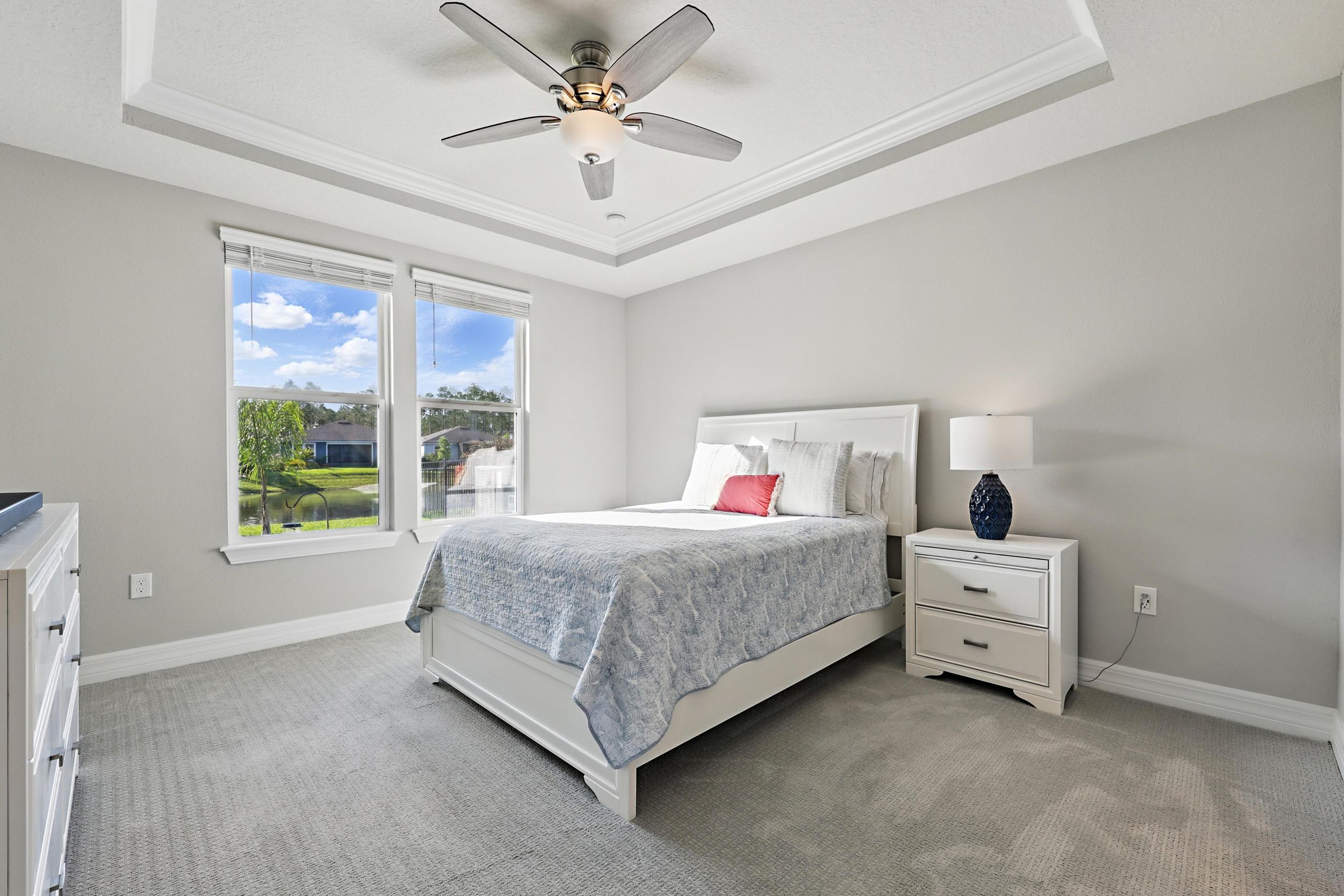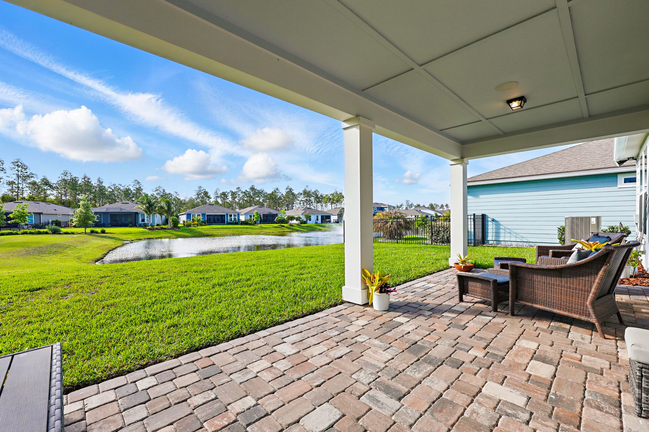 Welcome to Del Webb Nocatee and this beautifully upgraded 2-bedroom, 2-bathroom, 1,670 square foot home. Located walking distance to the Canopy Club, this home offers a serene water view and the perfect blend of comfort and elegance. As you enter, you'll be greeted by a bright and spacious open floor plan, with a stunning office that provides a peaceful space for work or relaxation. The upgraded kitchen is a chef's dream, featuring high-end finishes, modern appliances, and ample counter space. The Synergy Surround Sound System functions not only through the living area, but also on the back lanai. The inviting front porch provides a charming space to enjoy your morning coffee or relax with a good book while the back lanai looks over a beautiful pond and preserve. The Master Suite has been thoughtfully designed to overlook the water and offers a spa-like experience with luxurious frameless shower and sleek finishes. Live the lifestyle you've always dreamed of in the highly sought-after Del Webb community, offering resort-style pools and amenities and an active, vibrant atmosphere. There is a 24 hour guarded gate and a full activities calendar for both Del Webb and Nocatee.As a Nocatee resident, the community includes two waterparks, four other neighborhood pools, numerous playgrounds and dog parks, greenway walking trails, a kayak launch, fitness center, pickleball, tennis, and basketball courts, a full activity calendar, and is fully golf cart accessible. Plus, you're only minutes away from the stunning beaches of Ponte Vedra, allowing you to enjoy the Florida sunshine whenever you wish.
