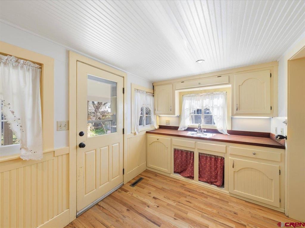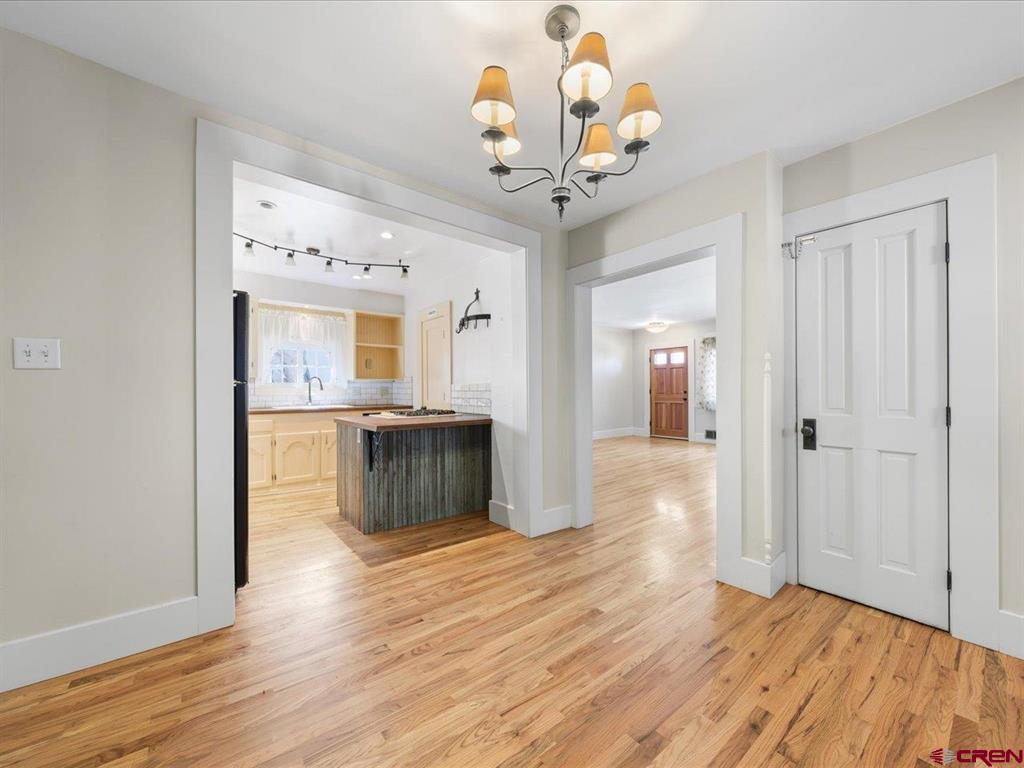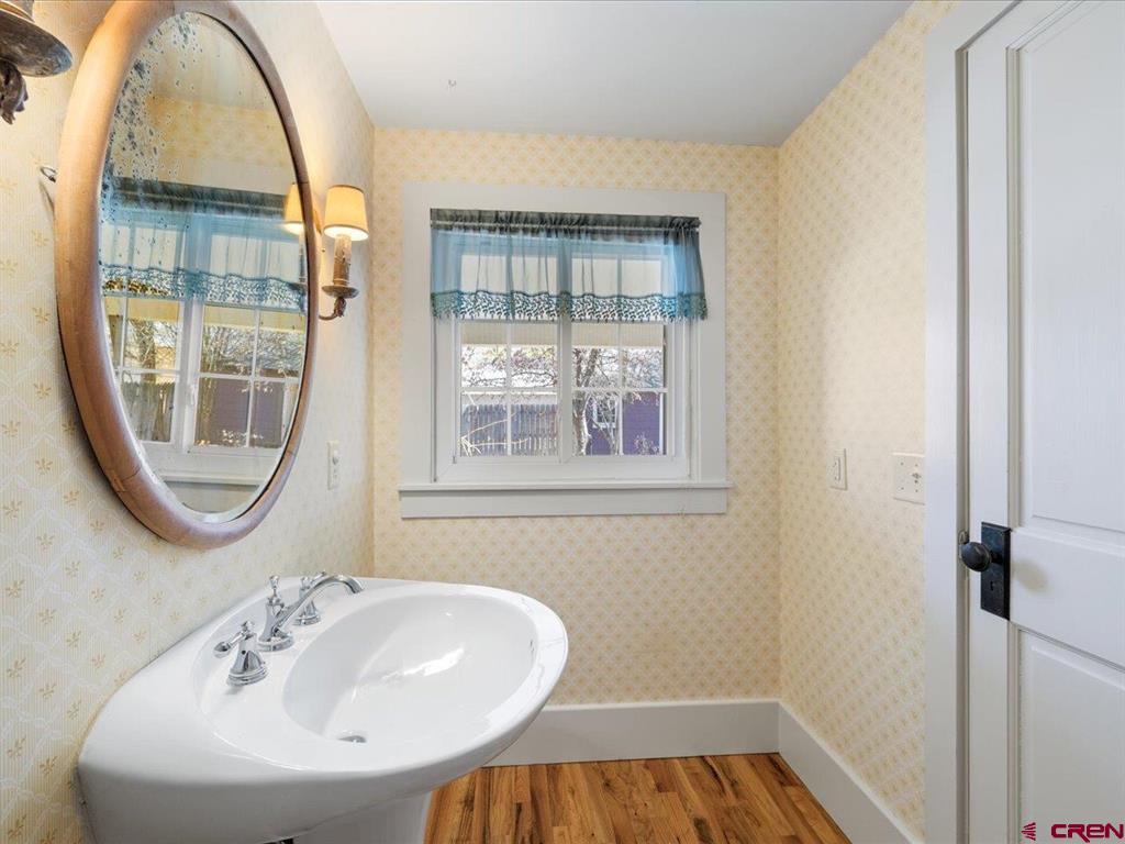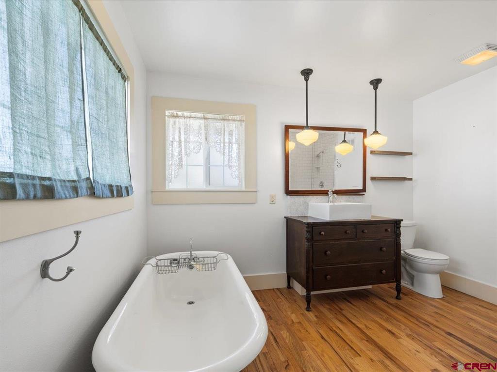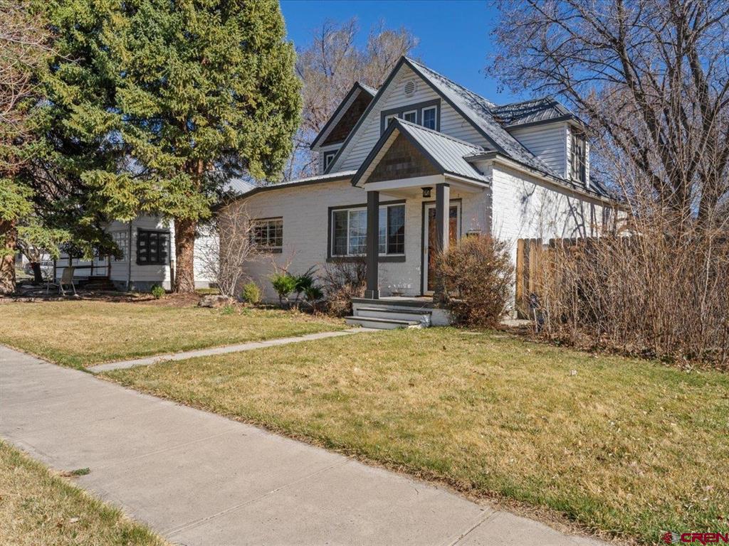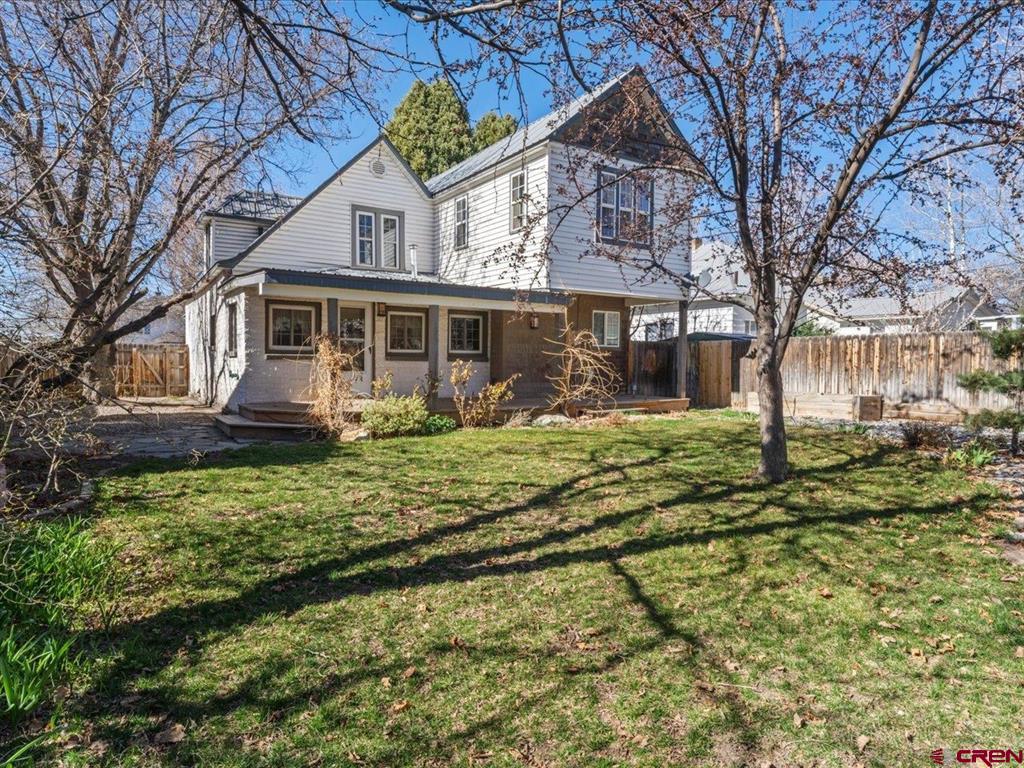 Updated, Cozy & Full of Historic Charm in the Heart of Downtown Montrose! Step into this beautifully remodeled 1912 two-story home where timeless character meets modern comfort. The main level offers a spacious living room, an open kitchen and dining area with pantry, plus a functional mudroom with wet bar and half bath - perfect for entertaining. The main-level primary suite is a true retreat, featuring a walk-in closet and private bath highlighted by a clawfoot tub and spacious tiled walk-in shower. Upstairs, you'll find a welcoming family room with vaulted ceilings, three additional bedrooms, a bath with a newly updated shower, and a conveniently located laundry area. Throughout the home, enjoy beautiful wood floors, newer vinyl windows, and forced air heating with central A/C for year-round comfort. Step outside to your own private backyard oasis where lush, mature landscaping surrounds a large covered porch, creating the perfect setting for relaxing or hosting gatherings. The property also features a workshop with a small overhead door, off-street alley access parking, and a variety of fruit trees including plum, peach, cherry, and apple. Ideally located in downtown Montrose, you can bike or walk to restaurants, shops, theaters, and the river park, making this home as convenient as it is charming. The Montrose Regional Airport and Montrose Regional Hospital are both five minutes away adding to the convenience of living downtown. A rare blend of character, updates, and location - don't miss this one!