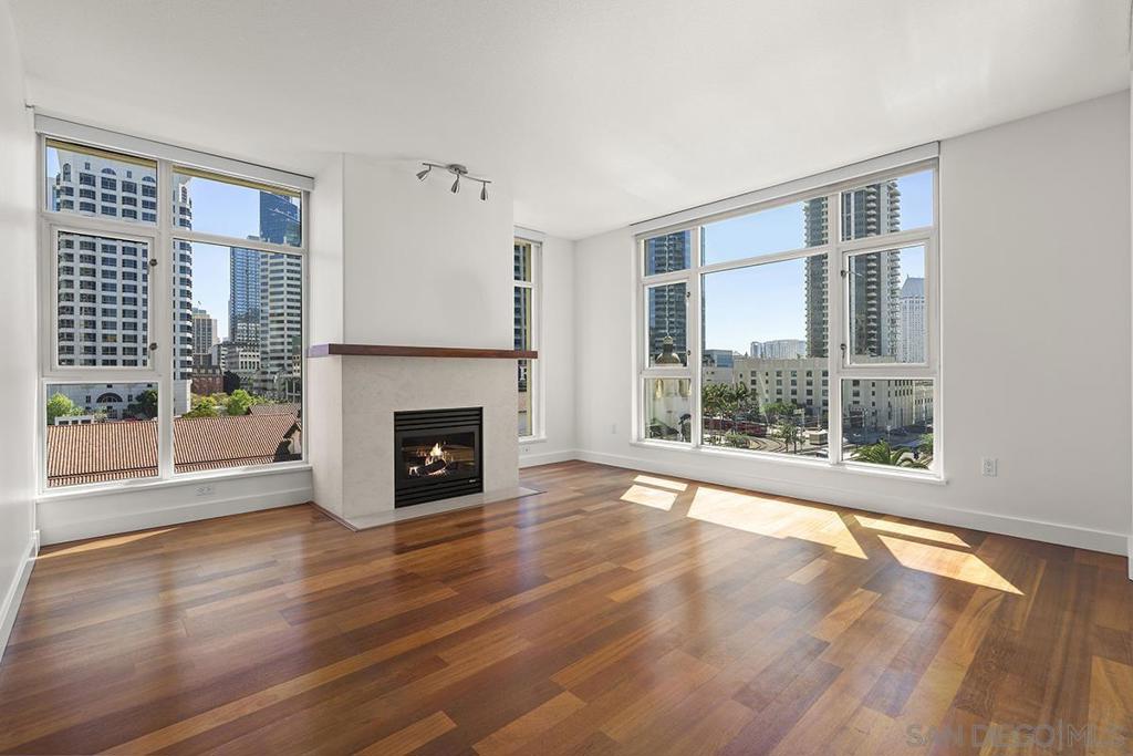 Come see what luxury living all is about at the Grande South! Polished & pristine, this gorgeous condo is highlighted by walls of windows bringing in great natural light while enjoying the beautiful cityscape and bay views from this lightly lived in southeast corner residence. This 7th floor unit features rich engineered wood floors, an ambient fireplace, and an expansive private balcony overlooking the ever-changing city and bustling Embarcadero. The chef's kitchen boasts premium stainless appliances, recessed lighting, and gleaming granite surfaces plus a breakfast bar. The open living/dining area is perfect for entertaining with a tranquil backdrop to enliven the experience! The spacious primary suite offers sunrise mornings, walk-in closet, ensuite bathroom with frameless shower and dual vanity. Plus, newer upgraded LG ThinQ stackable washer and of storage throughout. Embrace sophisticated urban living on Millionaire's Row! The Grande offers top-notch resort-style amenities including a newer updated and upgraded fitness center, sauna & steam room, 80-foot outdoor pool, barbecue area, club room, fully furnished meeting room, guest suite, and bicycle storage. Located across from the Embarcadero, you are sure to enjoy the prime location walkable to the waterfront, Little Italy, and Rady's Shell at Jacobs Park, a unique live music venue and home of the San Diego Symphony! Also enjoy proximity to the future life science and biotechnology research development The Research and Development District (The RaDD) at the Embarcadero and the sustainable tech-focused Horton Plaza Redevelopment in the center of the city. Some photos are virtually staged. Builder indicated 1336sqft, assessor's record states 1227sqft.