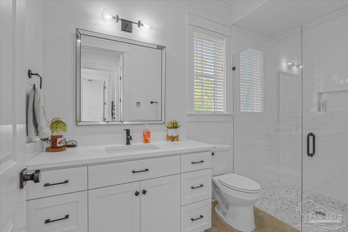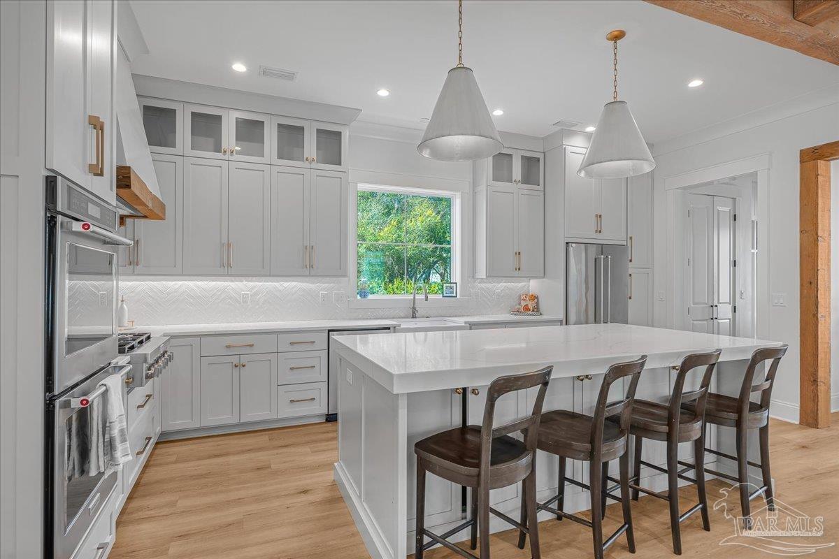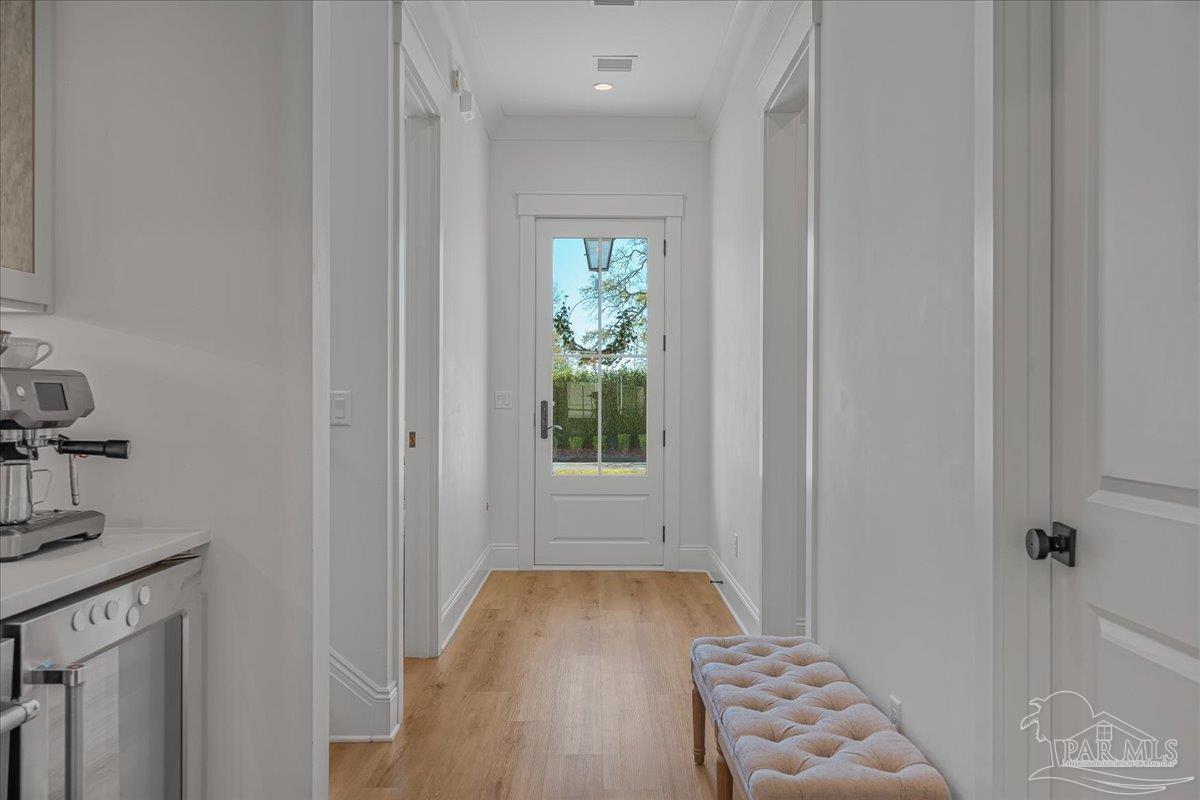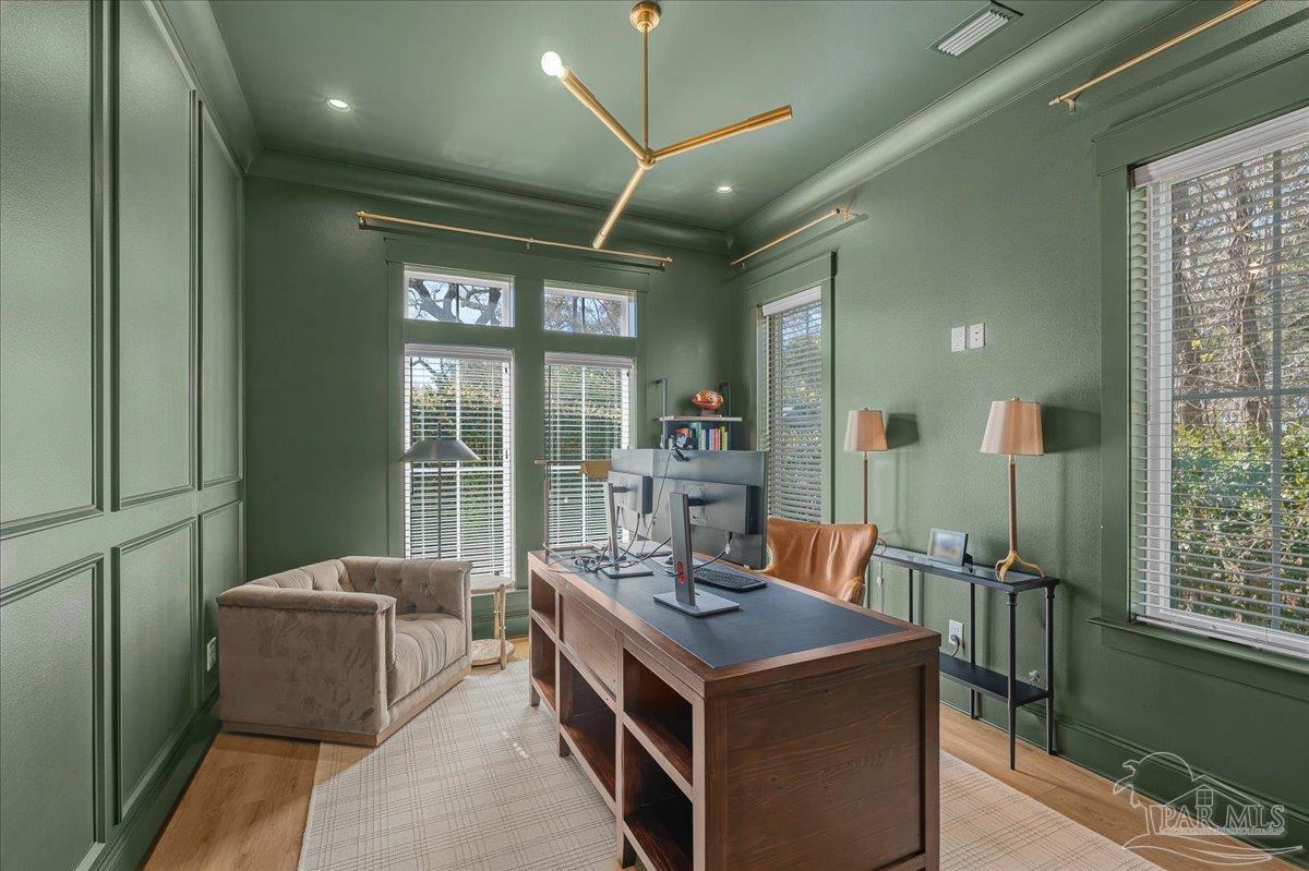 Nestled within a private gated community ideally located between Downtown Pensacola and East Hill, this exceptional residence offers both convenience and a true sense of neighborhood charm. Built in 2020 by a highly respected local builder, this home showcases quality craftsmanship, thoughtful design, and timeless style throughout. Offering 5 bedrooms, 5.5 bathrooms, a dedicated office, two kitchens, and a spacious covered back porch, the layout is designed to accommodate both everyday living and effortless entertaining. From the moment you step inside, the open and airy floor plan welcomes you with refined architectural details and abundant natural light that fills the home from every angle. The main kitchen serves as the heart of the home and features premium appliances, custom cabinetry, and a generous island ideal for cooking, gathering, and entertaining. Just off the kitchen, the semi-formal dining space provides the perfect setting for intimate dinners or larger celebrations. The primary suite offers a peaceful retreat with a spa-like bathroom that includes a freestanding soaking tub, dual vanities, and striking wire-brushed white oak cabinetry extending from floor to ceiling. A spacious closet ensures ample storage and functionality. Above the garage, a private carriage house provides additional flexibility with its own full kitchen, bedroom, living area, and bathroom - ideal for guests, extended family, or a private retreat. This remarkable home offers the perfect balance of luxury, comfort, and location. Schedule your private showing today to experience everything it has to offer.