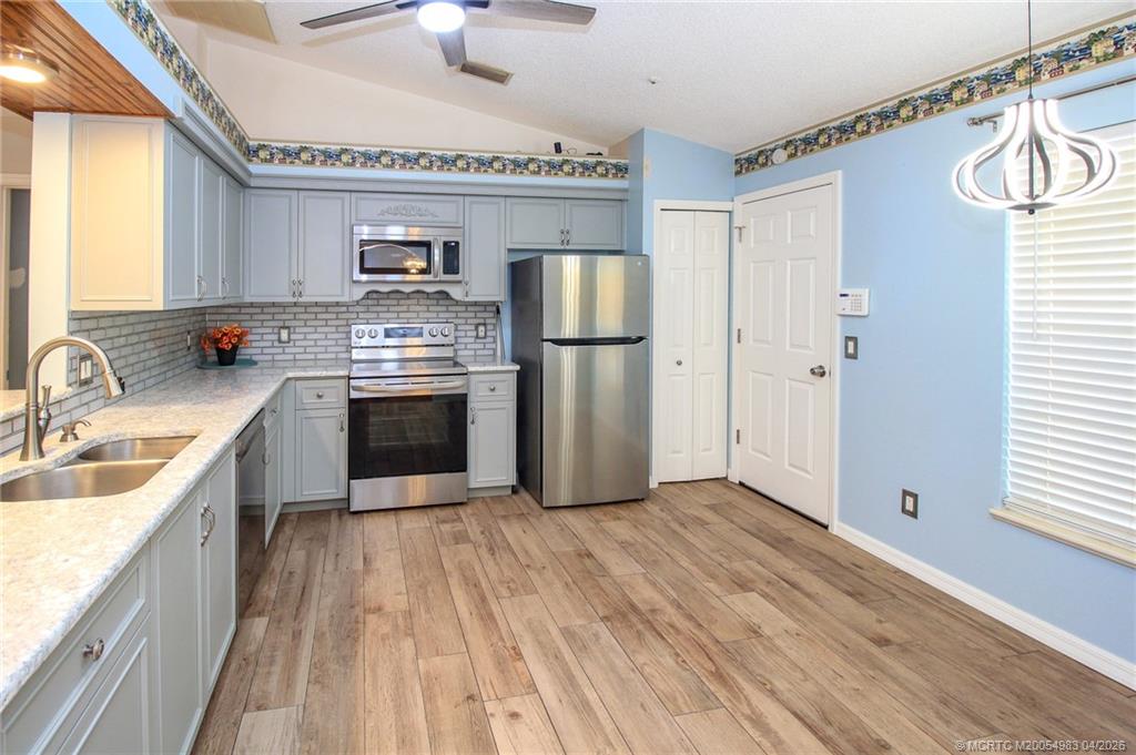 Nicely updated 3-bedroom, 2-bath solid concrete block home in a sought-after community. This move-in-ready property features vaulted ceilings and a desirable split floor plan, offering both openness and privacy. The spacious, modern kitchen is equipped with grey wood cabinets, stainless steel appliances, quartz countertops, and plenty of room to gather. Both bathrooms have been stylishly renovated, and the home offers durable laminate and tile flooring throughout. Enjoy peace of mind with a 2024 A/C, a finished epoxy garage floor, and a fully fenced, large backyard (2024) perfect for outdoor living. Conveniently located near shopping, dining, and schools, with the beach just a short drive away - this home truly has it all!