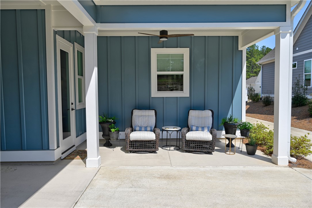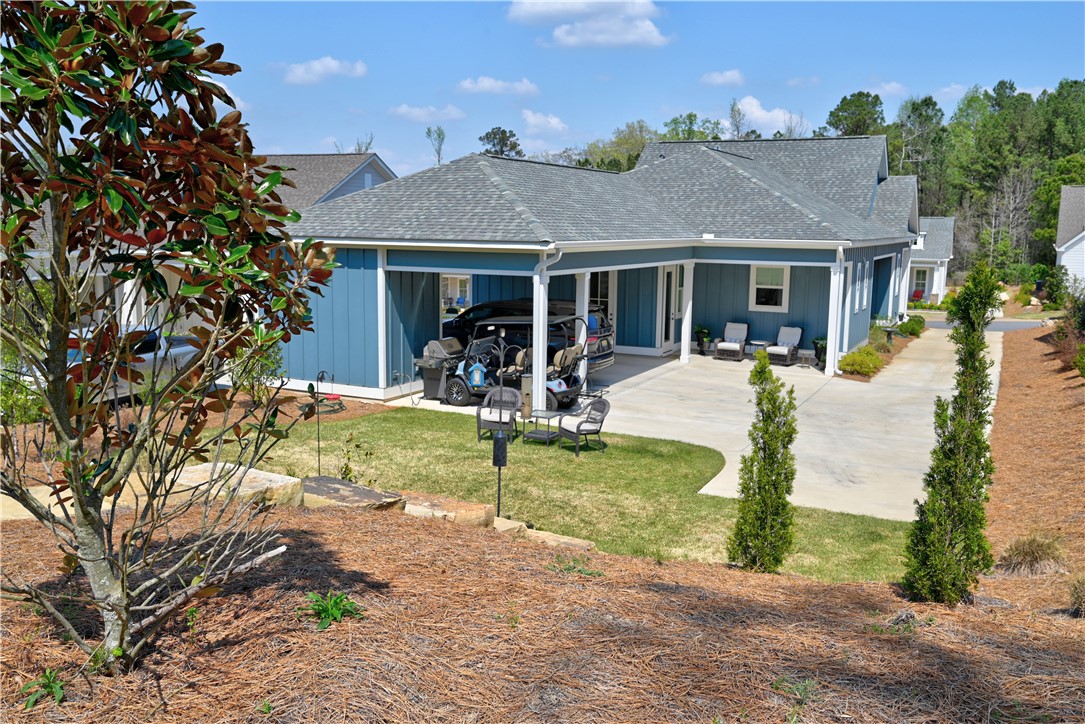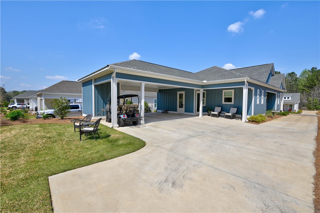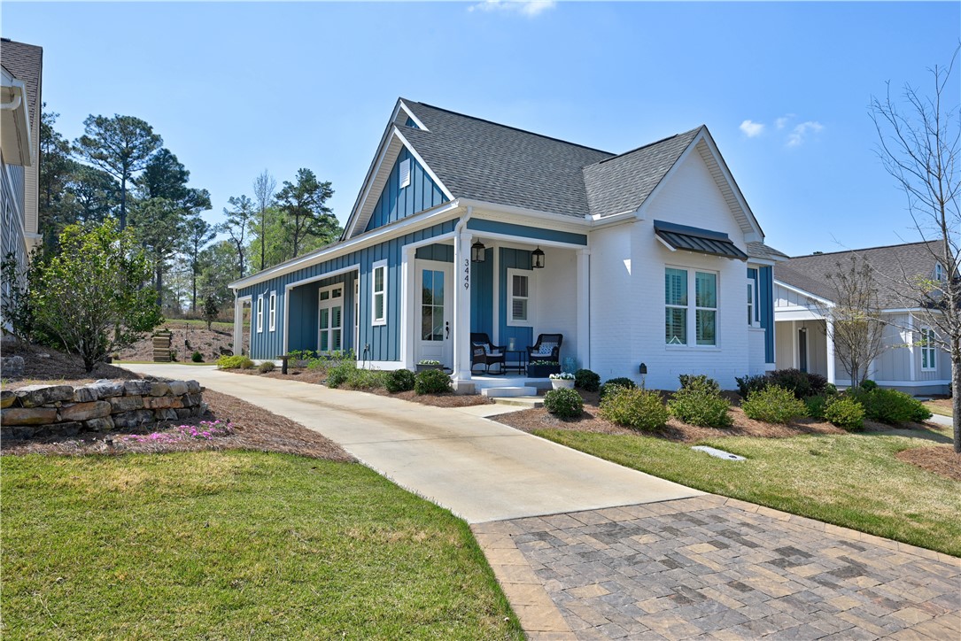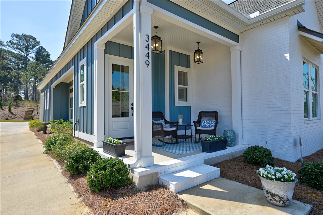 Perfectly positioned along the Grand National golf course in lovely National Village, this beautifully designed cottage offers effortless one-level living paired with exceptional outdoor spaces & serene views. Located on the 4th green & 5th tee box & direct access to the miles of nature trails! With its charming blue & white Craftsman exterior, welcoming covered front porch, & manicured landscaping, 3449 Eagle Trail is quite the belle of the ball! Enjoy the bright, open-concept layout featuring hardwoods, 10' ceilings, extensive crown molding, & abundant natural light. The spacious great room is anchored by a gas log fireplace with custom built-ins & flows into the dining area & chef's kitchen. Kitchen is both functional & stylish, offering quartz countertops, ceiling-height cabinetry, large island, & premium appliances including gas cooktop & double ovens - ideal for everyday living & entertaining. Primary suite provides a peaceful retreat with a spa-like bath featuring dual vanities, curbless tile/glass walk-in shower, & generous closet space. Two additional bedrooms offer flexibility for guests, office, or hobbies, with a well-appointed secondary bath nearby. While the interior is undeniably stunning, the outdoor spaces are what truly sets this home apart! Enjoy golf course views from the covered rear porch & expansive patio. Complete with beautifully terraced landscaping for both privacy & visual interest, the backyard offers direct access to a multi-use community path bordering the course! Oversized carport easily accommodates two vehicles plus a golf cart, with extra storage for added functionality. Enjoy resort-style amenities including access to the Marriott's indoor & outdoor pools, fitness center, award winning restaurant, tennis & pickleball courts, nature trails, fishing lakes, & much more - all just minutes from Auburn University, downtowns of Auburn & Opelika, & TigerTown! Golf cart, grill & washer & dryer are negotiable! Underground dog fence included.