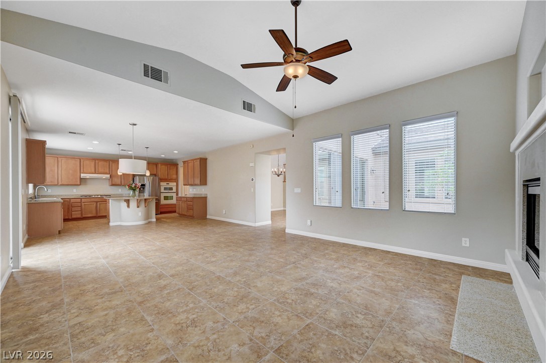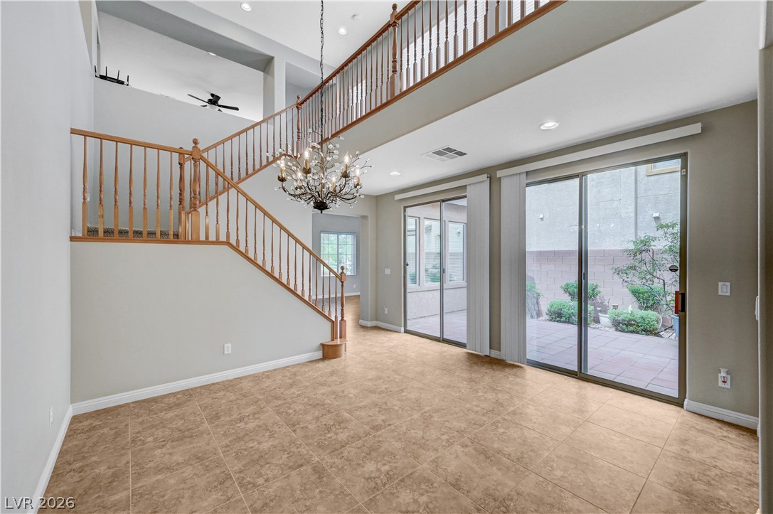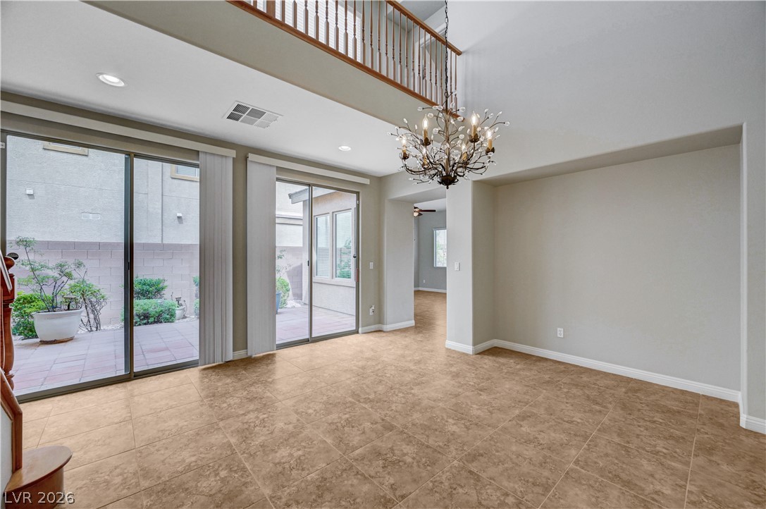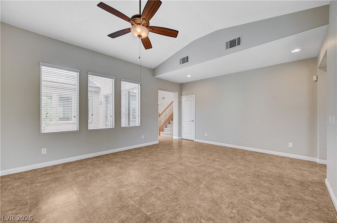 Welcome to this beautifully maintained home in the Waterfalls community of Nelson Ranch! Offering 2,821 sq ft living space, this 3-bedroom home features 2 full baths upstairs and a half bath downstairs. Vaulted ceilings in both the formal living room and family room create an open, light-filled space. The formal dining area has a soaring high ceiling and it opens to a peaceful courtyard, perfect for indoor-outdoor living. The kitchen includes granite countertops, a large island, stainless steel refrigerator, white appliances, and pull-out lower cabinets for easy organization. Cozy fireplace in the family room. Upstairs features a spacious loft and a split-bedroom layout for added privacy. The backyard offers a low-maintenance desert landscape with fruit trees, roses and Hibiscus, a private setting - perfect for relaxing or enjoying outdoor gatherings.Conveniently located near Ice Age Fossils State Park, Tule Springs Fossil Beds National Monument, Aliante Casino, Costco, and shopping.
