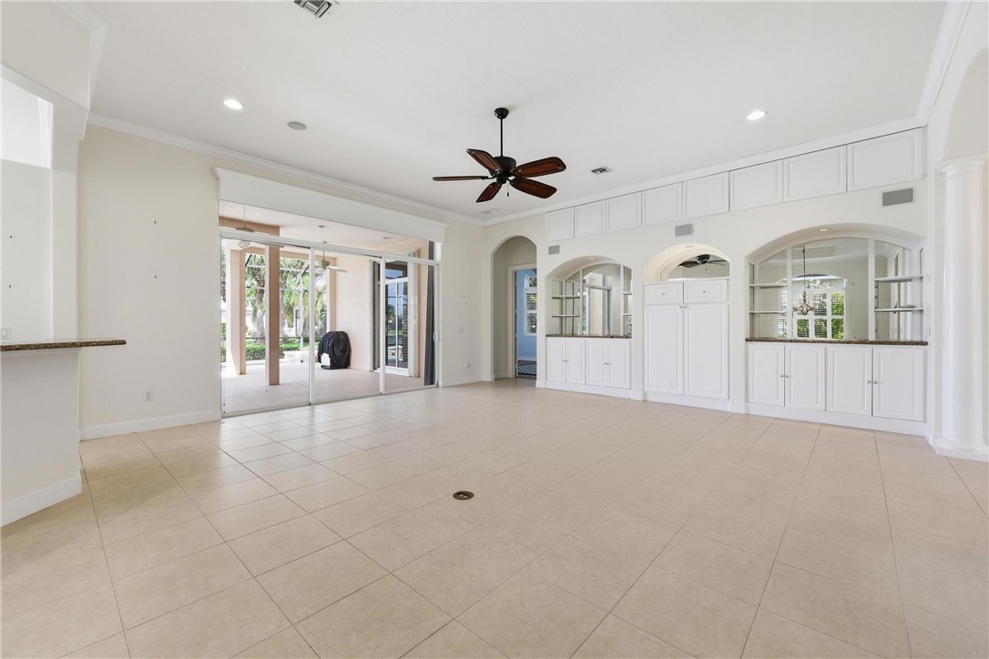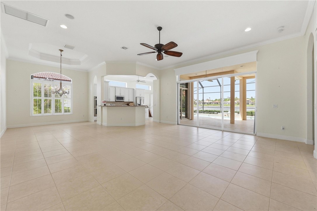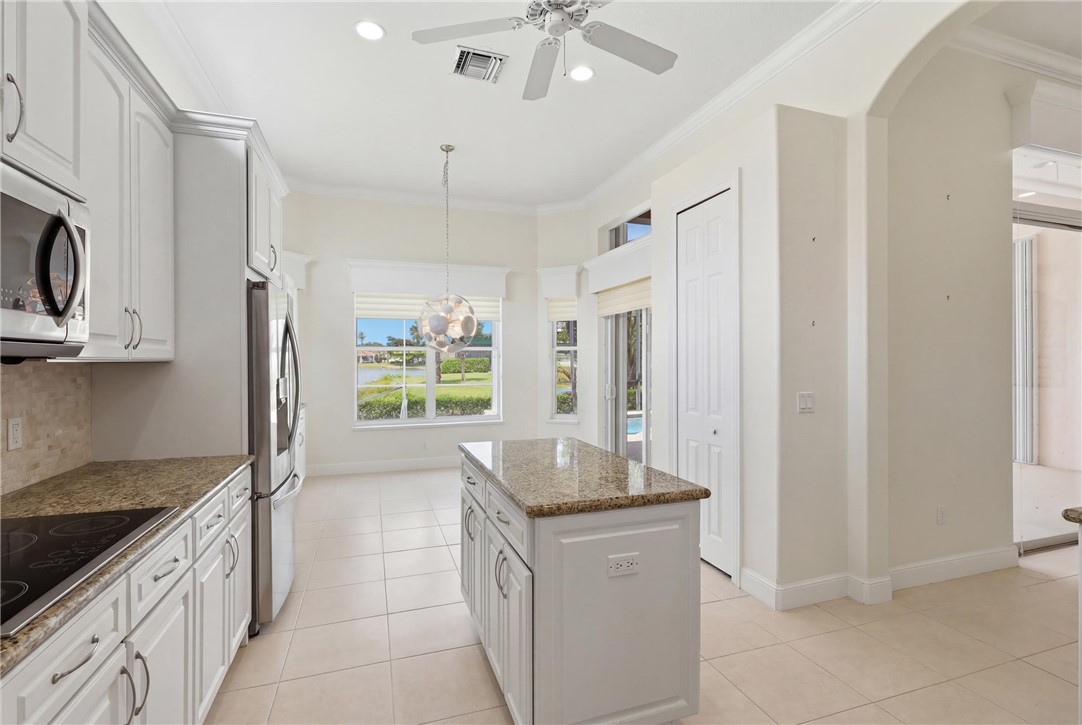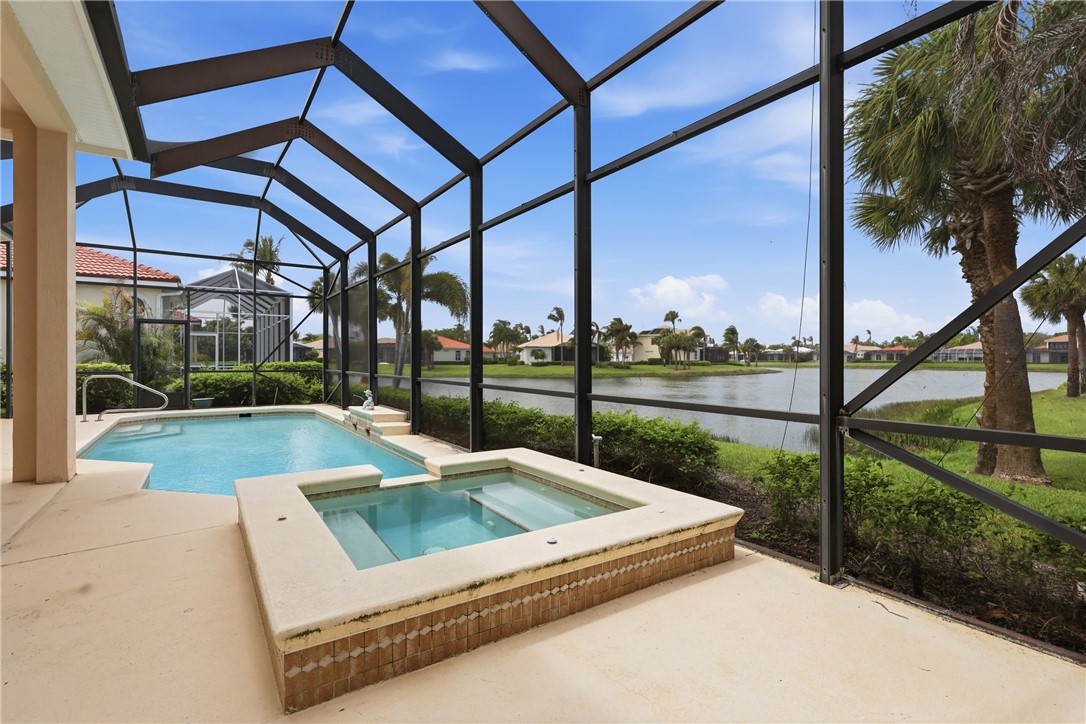 Lakefront beauty located in Island Club Riverside. This spacious 3-bedroom, 2 bath home w/ office, perfect for working from home or extra living space. Enjoy serene water views from your large, private screened patio complete with a pool and spa - ideal for relaxing or entertaining. Inside, the home boasts tile and wood flooring throughout, crown molding, and plantation shutters. The living room includes custom built-in wall units, adding both style and functionality. Island kitchen featuring granite countertops and a stylish tile backsplash. A perfect blend of comfort & elegance.