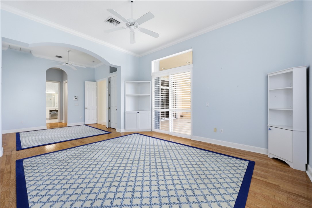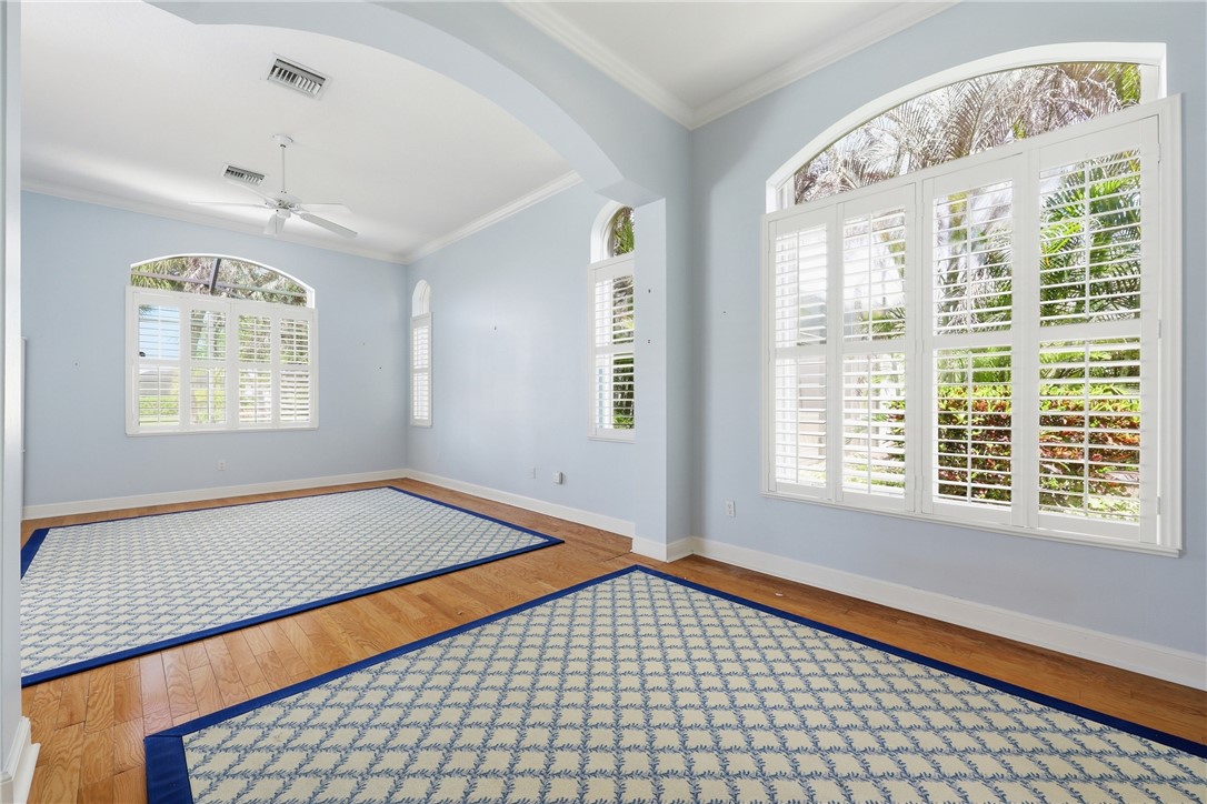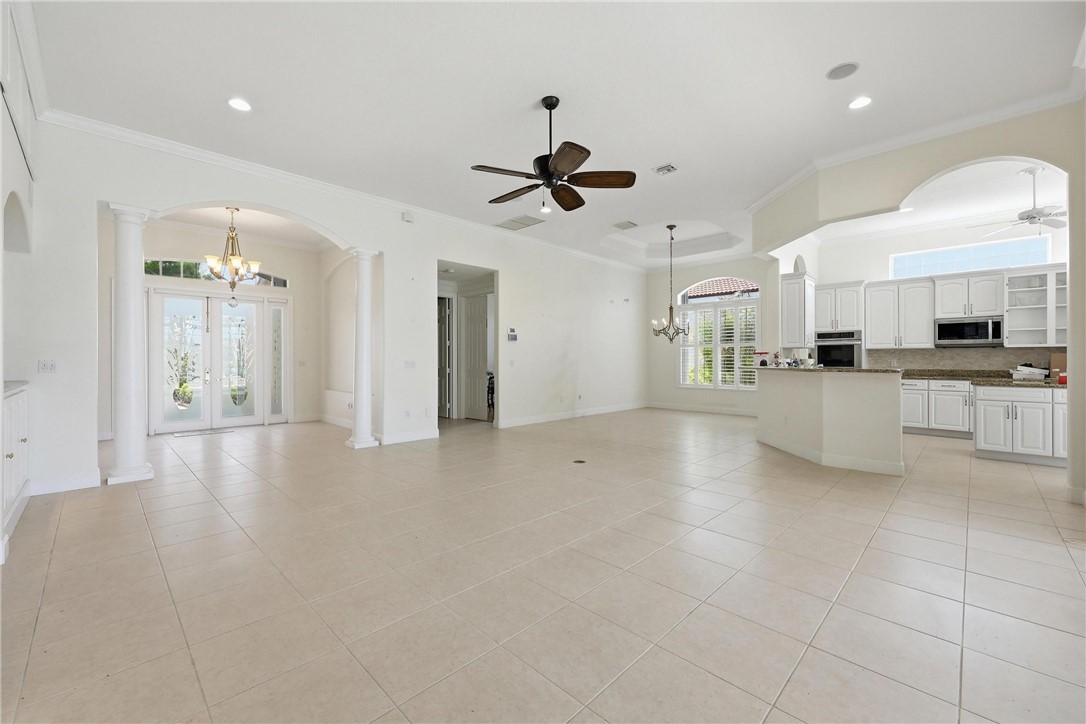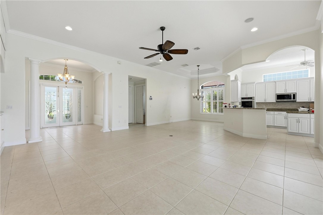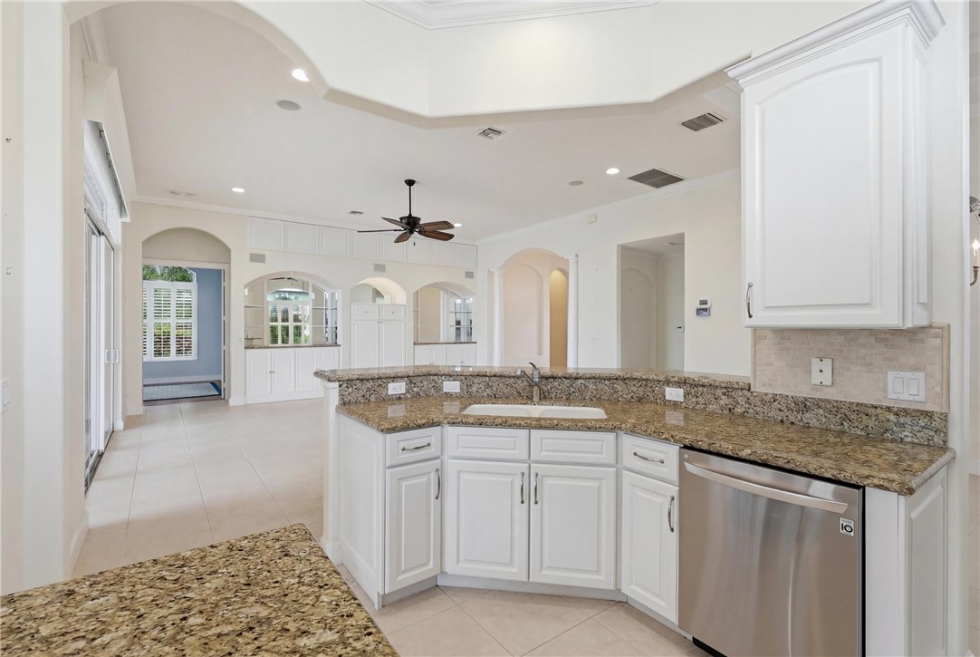 Lakefront beauty located in Island Club Riverside. This spacious 3-bedroom, 2 bath home w/ office, perfect for working from home or extra living space. Enjoy serene water views from your large, private screened patio complete with a pool and spa - ideal for relaxing or entertaining. Inside, the home boasts tile and wood flooring throughout, crown molding, and plantation shutters. The living room includes custom built-in wall units, adding both style and functionality. Island kitchen featuring granite countertops and a stylish tile backsplash. A perfect blend of comfort & elegance.