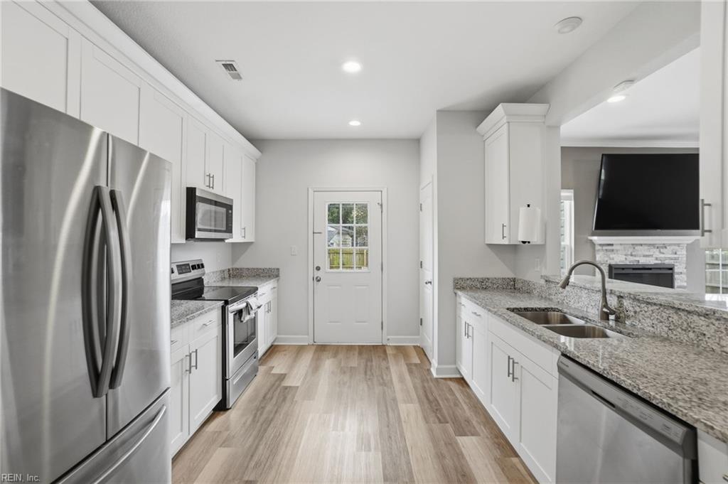 Built in 2023, this thoughtfully designed home offers modern style and low-maintenance living. The main level features a first-floor bedroom with a full ensuite bath, ideal for guests or flexible use. The kitchen includes granite countertops, soft-close cabinets, stainless steel appliances, and flows into a spacious living area and designated dining room. Durable LVP flooring runs throughout the main living spaces. With 5 generously sized bedrooms, 3 full baths, and approximately 2,300 square feet, there is ample space along with great closet storage. Enjoy a manageable backyard, a one-car garage, and additional driveway parking. Conveniently located in Norfolk near highways, military installations, shopping, dining, and more. Sellers are sad to leave, but duty calls!