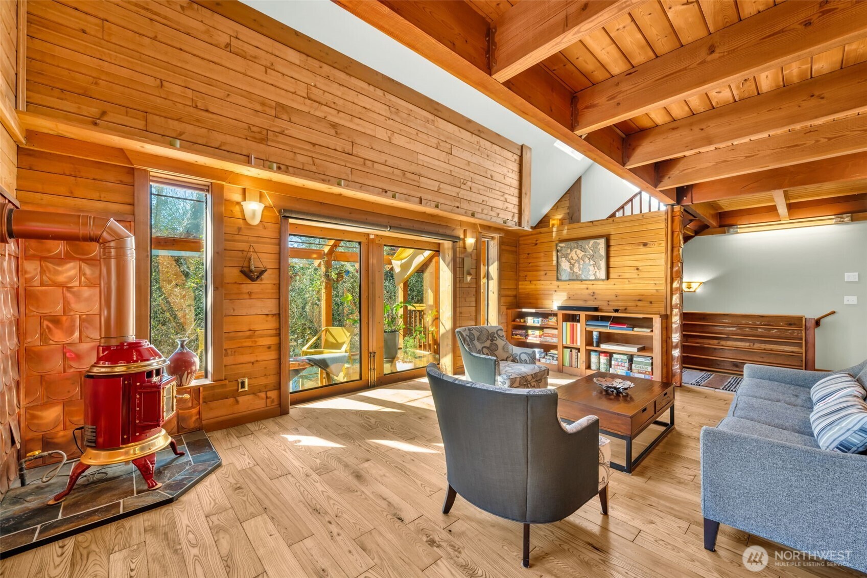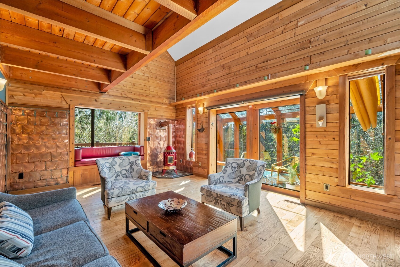 Tucked away on over five secluded, forested acres in N. Olympia, this nearly 4,000 sq ft custom home offers a rare blend of solitude, space, and lifestyle. A gated entry welcomes you into a peaceful setting surrounded by mature trees, curated gardens, and productive fruit plantings. Designed for both comfort and flexibility, the home features 3 bedrooms and 3 bathrooms (one one each floor), 2 offices w/closets, with expansive living areas on both the main level and lower level. Also 2 freestanding stoves/fireplaces on main level. Two sun-filled solariums create year-round indoor/outdoor living, while the ample sauna and gym space offers an upscale retreat. Multiple covered exterior decks extend the living space into the surrounding landscape. Primary bedroom skylights let the gentle rain showers lull you to sleep. The third-floor studio with rooftop deck provides an inspiring setting for work, creativity, or quiet refuge. Spacious detached garage for cars and work. Outside, the property becomes your own edible garden and orchard. Front yard includes blueberries, strawberries, marionberries, grapes, thornless blackberries, black raspberries, and rhubarb. The backyard orchard features kiwiberries, akebia, pears, plums, and hazelnuts. Includes covered RV parking & room to expand or simply enjoy, this property delivers a lifestyle that is increasingly hard to find. Also, wired for generator. Minutes to Olympia amenities, yet worlds away. Adjoining lot also for sale - MLS #2500505