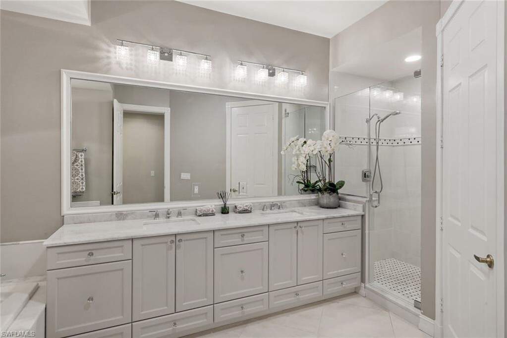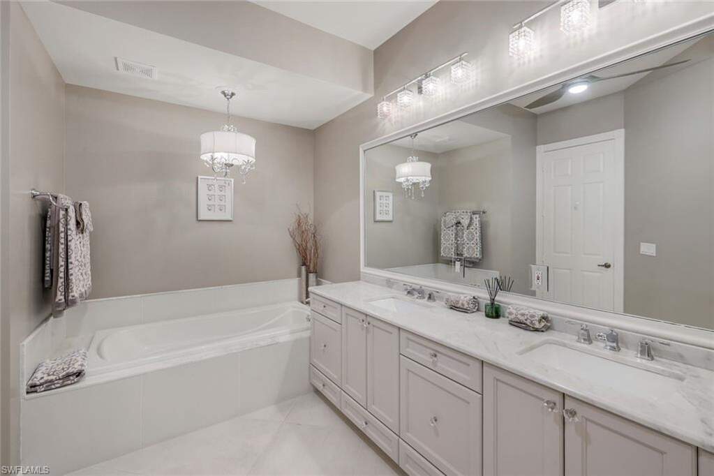 Elevated coastal luxury in the heart of North Naples-Welcome to Residence 4-201 at Les Chateaux, an exquisitely renovated second floor END UNIT nestled within the prestigious Pelican Marsh community. Offering the privacy of NO RESIDENCE ABOVE, A VIEW OF THE COMMUNITY FOUNTAIN and the convenience of a PRIVATE 2 CAR GARAGE WITH EPOXY FLOORING AND BUILT-IN STORAGE, this sophisticated home blends timeless elegance with modern comfort in one of Naples' most coveted locations. Refined interiors designed with both beauty and functionality in mind, this expansive 2216 square foot Versailles floor plan showcases 3 SPACIOUS BEDROOMS AND TWO AND ONE HALF BATHS, ELEGANT TRAVERTINE FLOORING complimented by RICH WOOD finishes and a LIGHT FILLED open layout ideal for entertaining. At the heart of the home, the designer kitchen impresses with sleek GRANITE COUNTERTOPS, CUSTOM MOSAIC TILE BACKSPLASH, UPGRADED APPLIANCES, SOFT CLOSE CABINETRY, NEW WASHER AND DRYER AND RECENTLY UPDATED LANAI ALSO WITH TRAVERTINE FLOORING AND NO-SEE-UM SCREENING. The luxurious primary suite and guest accommodations are enhanced by spa inspired bathrooms featuring MARBLE AND GRANITE DETAIL, WHITE PLANTATION SHUTTERS, while CUSTOM CLOSET SYSTEMS add a polished tailored feel throughout. Step into your private screened lanai where tranquil views of lush tropical landscaping create a backdrop for morning coffee or evening relaxation. This peaceful retreat captures the essence of Naples indoor-outdoor lifestyle. Additional exceptional details include solid concrete construction with classic tile roofing, all in a quiet low density enclave offering the ultimate in privacy and charm. The resort-inspired living at Pelican Marsh offers residents at Les Chateaux exclusive access to private pool and spa along with world class amenities which include state-of -the -art fitness center, tennis, pickleball, bocce courts, scenic walking and biking paths, elegant clubhouse and optional golf membership. Just minutes away, experience the best of Naples- pristine Gulf beaches, upscale shopping and fine dining at nearby Mercato and Waterside shops. Whether as a full-time residence or seasonal escape, this exceptional home offers luxury, privacy and effortless living in one of North Naples' premier gated communities. Truly a distinguished Naples retreat!!