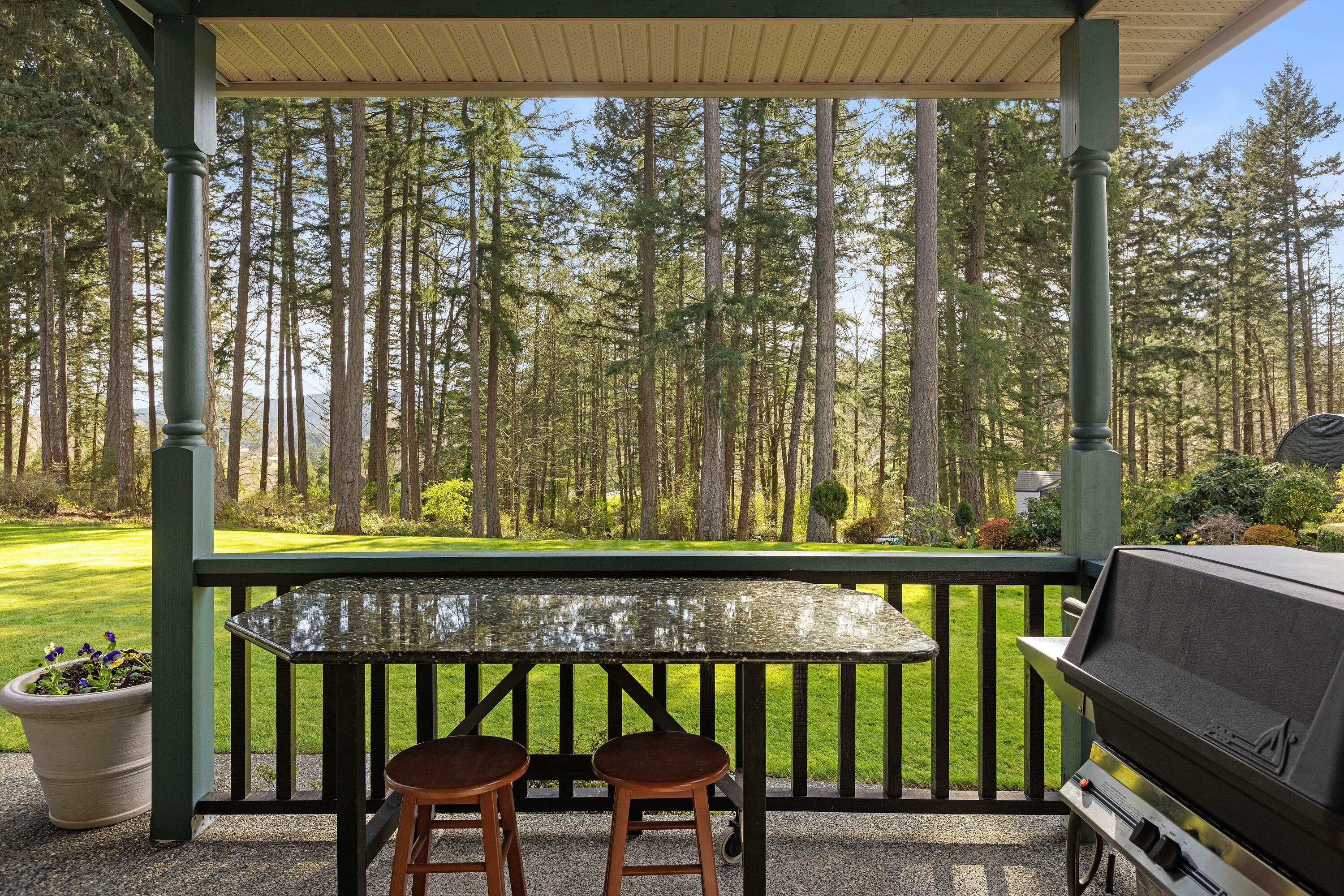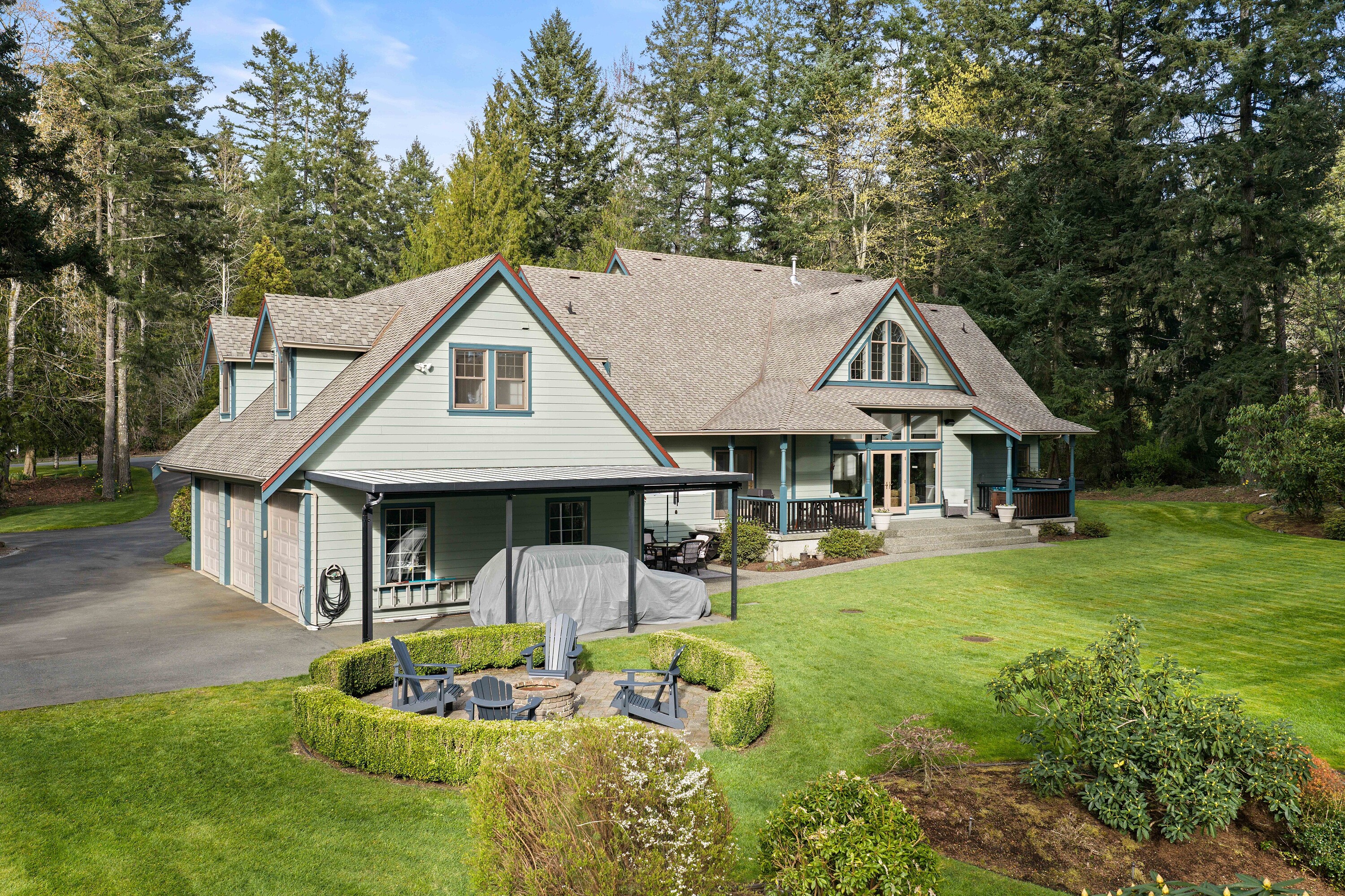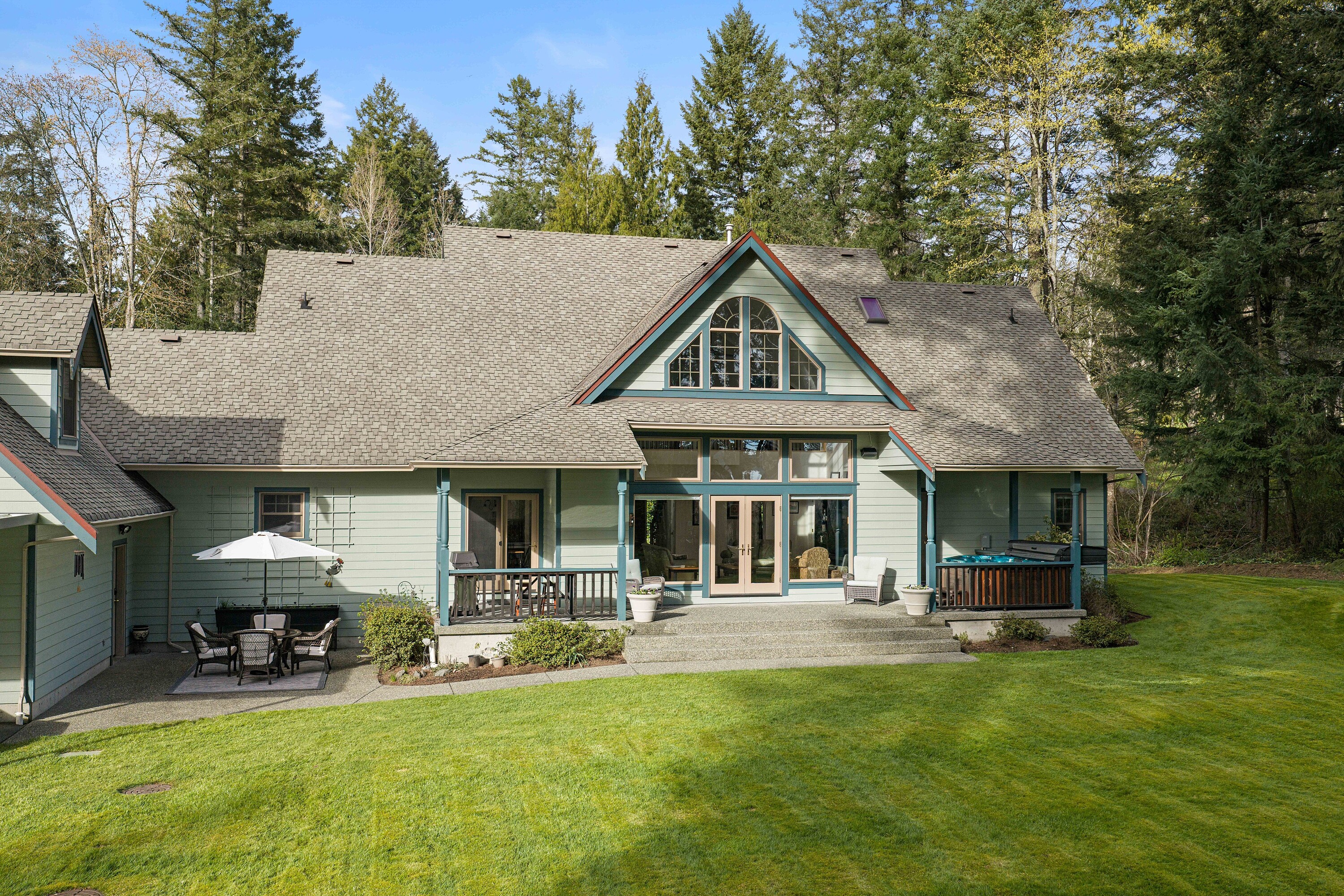 Pristine perfection. Set on nearly two acres of idyllic landscaped grounds, this immaculate estate residence offers over 4,000 square feet of refined living, thoughtfully updated for today’s family. The heart of the home is a stunning great room with vaulted ceiling and Vermont Casting gas fireplace, creating an inviting atmosphere. The crisp white kitchen, renovated in 2023, with large island and quartz countertops, flows seamlessly to the main living spaces. Main floor primary suite offers a retreat with updated ensuite and direct access to a covered porch with secluded hot tub. Two generous bedrooms upstairs and a large bathroom plus versatile exercise room. Extensive updates include refinished maple floors, renovated family and laundry rooms, new window coverings and updated guest suite. Quality craftsmanship is evident throughout, with high-end Loewen windows, natural gas furnace and HRV system plus triple car garage. A gently sloping property with peaceful views toward Gowlland Tod Provincial Park.