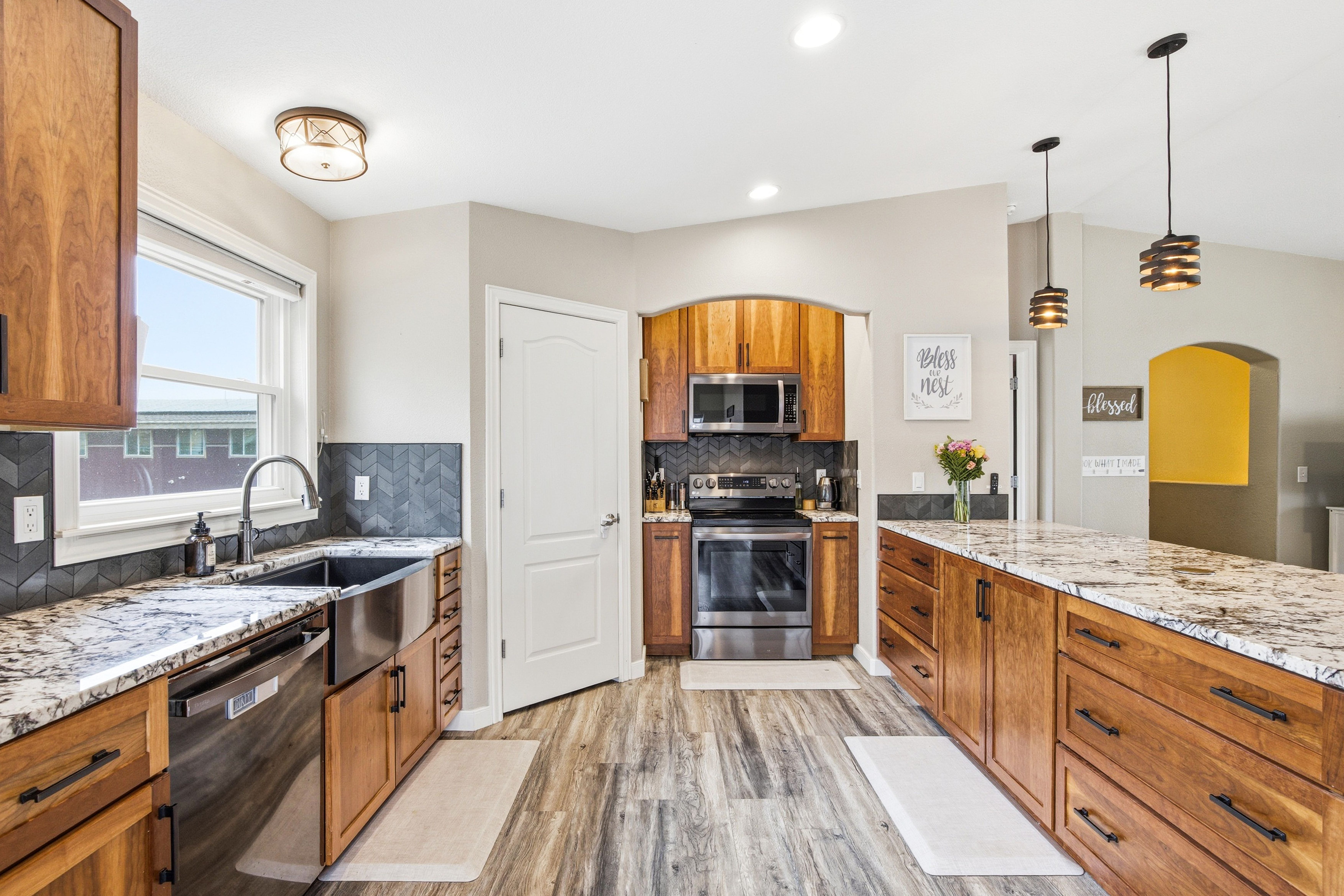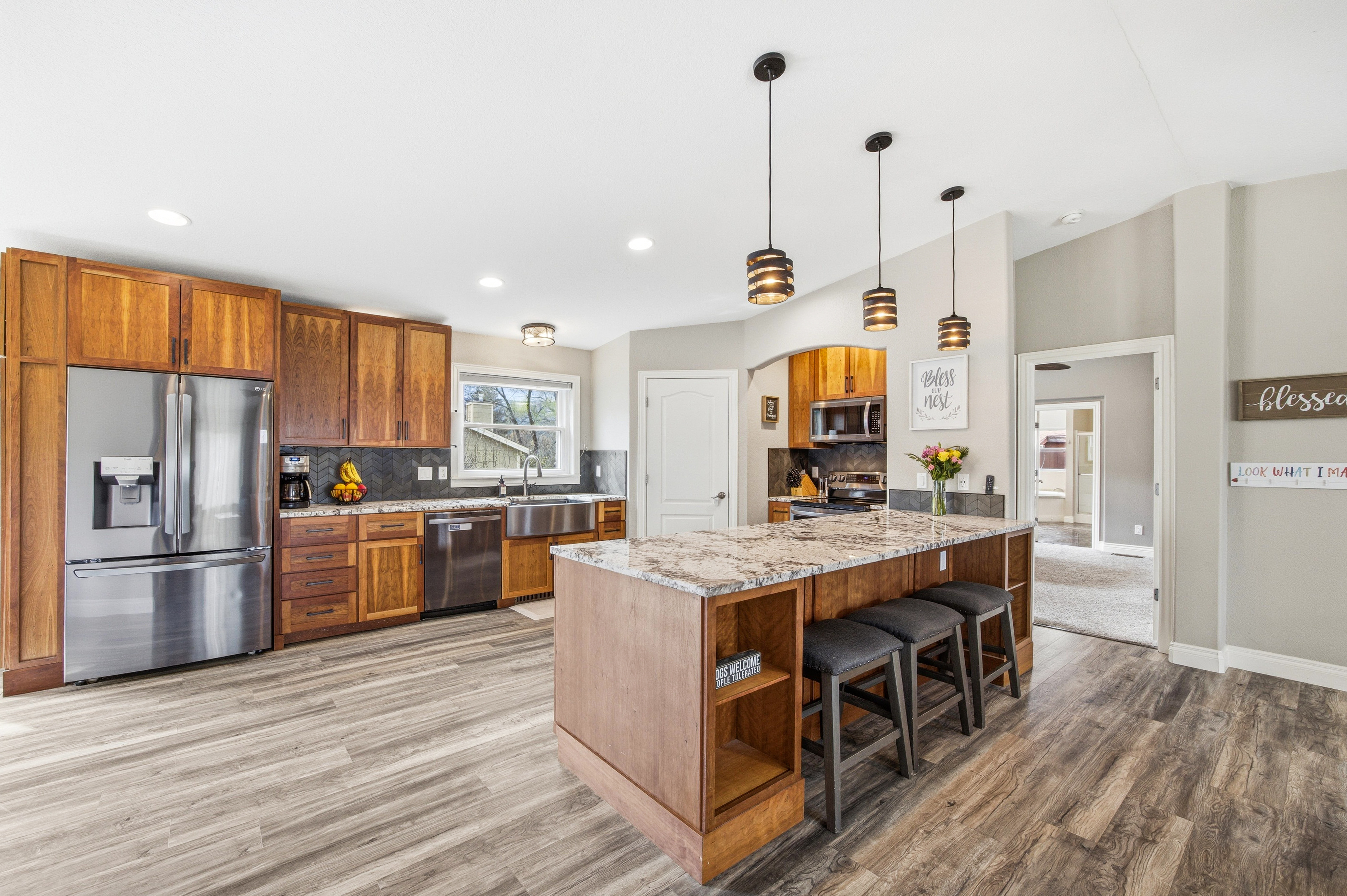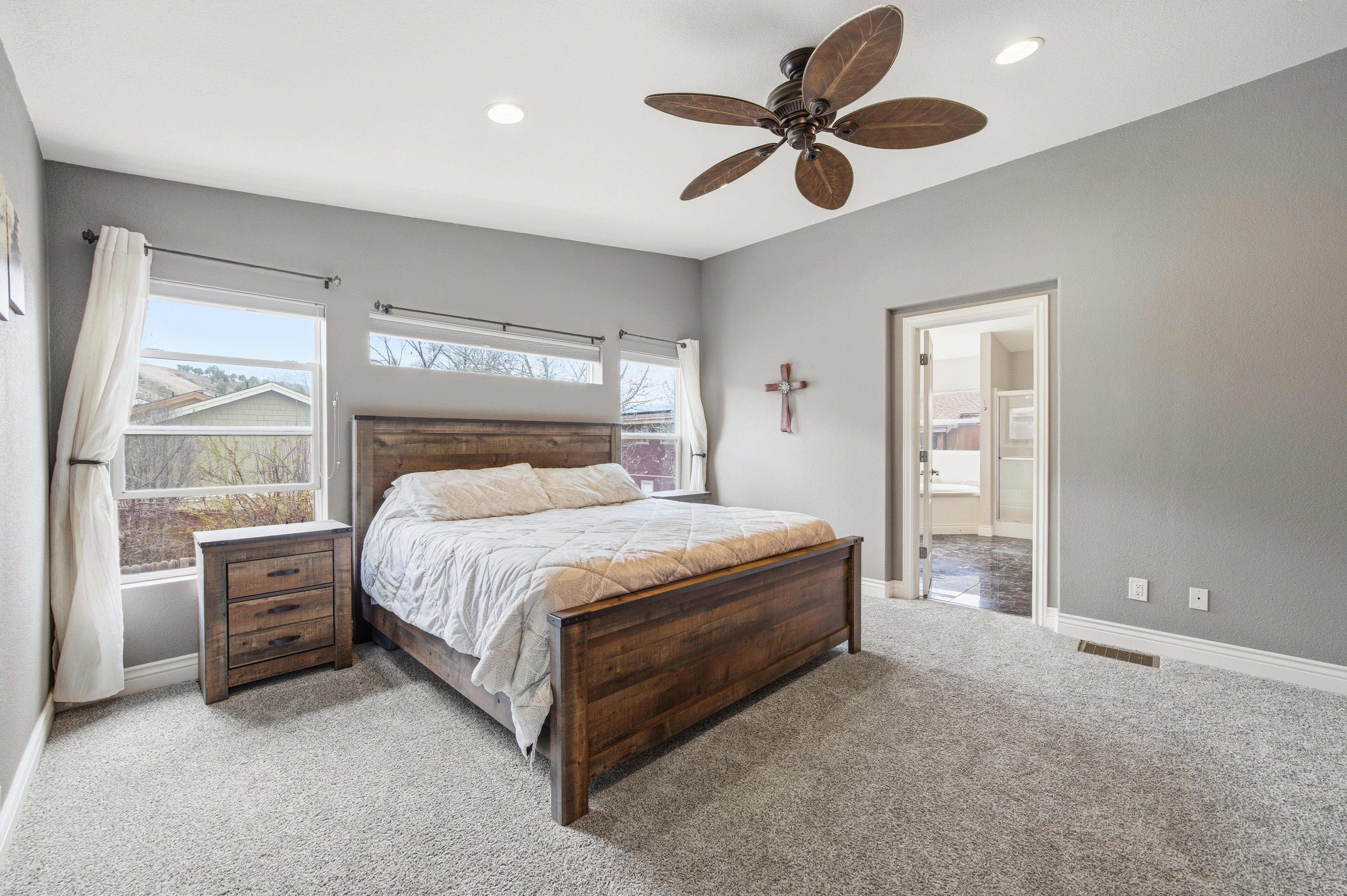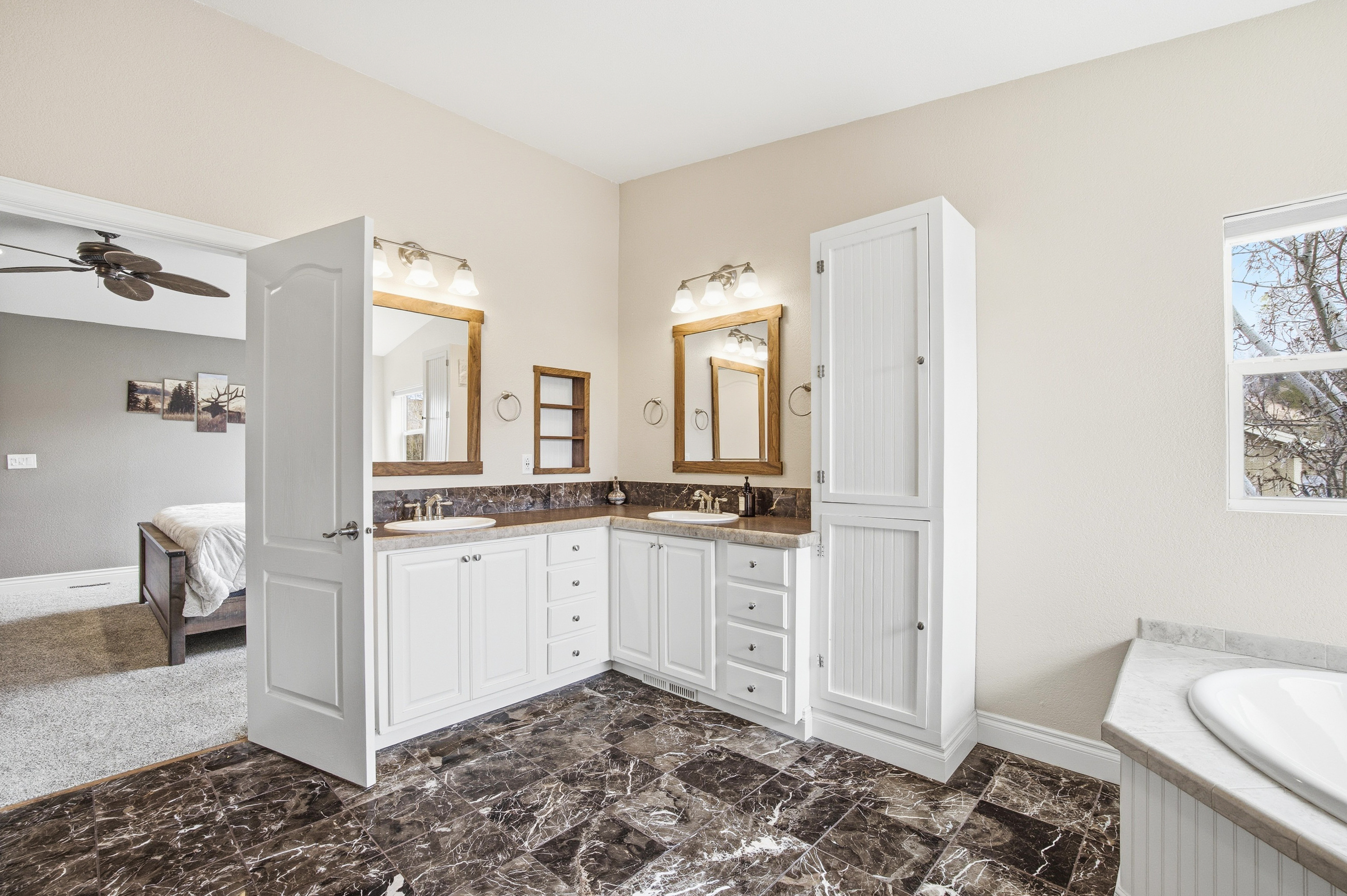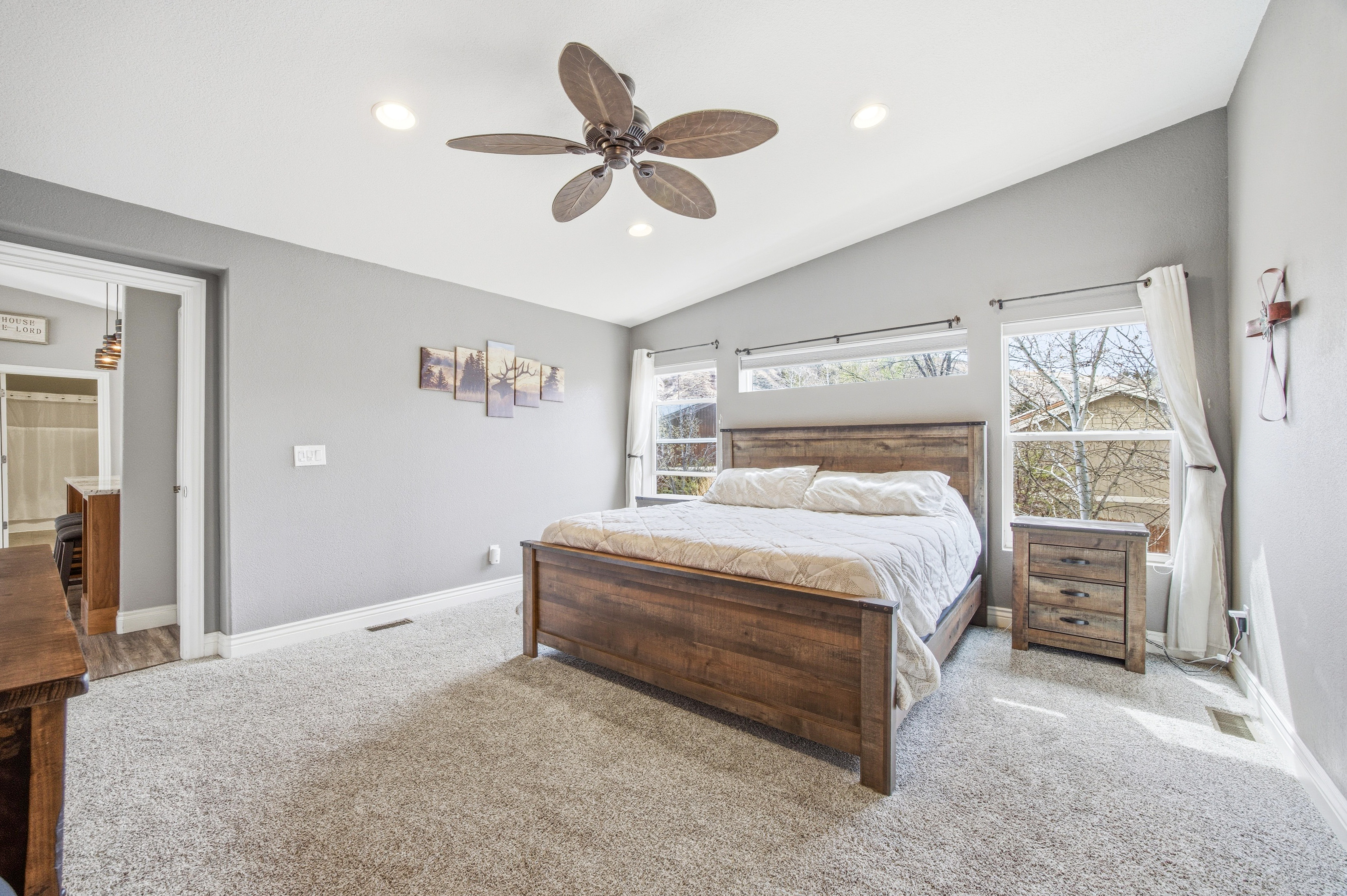 Set on a private cul-de-sac in one of Old Eagle's most desirable locations, this move-in ready home offers an exceptional blend of space, comfort, and everyday livability with no HOA. A thoughtfully designed floor plan features 4 bedrooms, a spacious recreation room, and a versatile flex space ideal for a home office, fitness studio, or potential fifth bedroom.The main-level primary suite creates a true retreat, complete with a jetted soaking tub, walk-in closet, double sinks, and private water closet. A secondary main-floor bedroom offers ideal flexibility for family, guests, or a home office. The great room is anchored by an inviting, open-concept kitchen with slab granite countertops, custom cherry cabinetry, an complete LG suite of Energy Star stainless steel appliances, and a generous walk-in pantry.The lower level is designed for entertaining with a recreation room enhanced by surround sound, perfect for movie nights or gatherings. Recent improvements include a new roof, new carpet in 2024 and a garage heater for year-round convenience.Outdoor living is equally appealing, with a fully fenced and landscaped yard featuring a new greenhouse and storage shed, along with deck and patio spaces for seamless indoor-outdoor living and backyard entertaining. An oversized two-car garage and a 40-foot concrete parking pad provide abundant space for vehicles, gear, or recreational toys. With no HOA and close proximity to schools, dining, shopping, and trail systems, this home offers an exceptional blend of lifestyle, location, and livability.