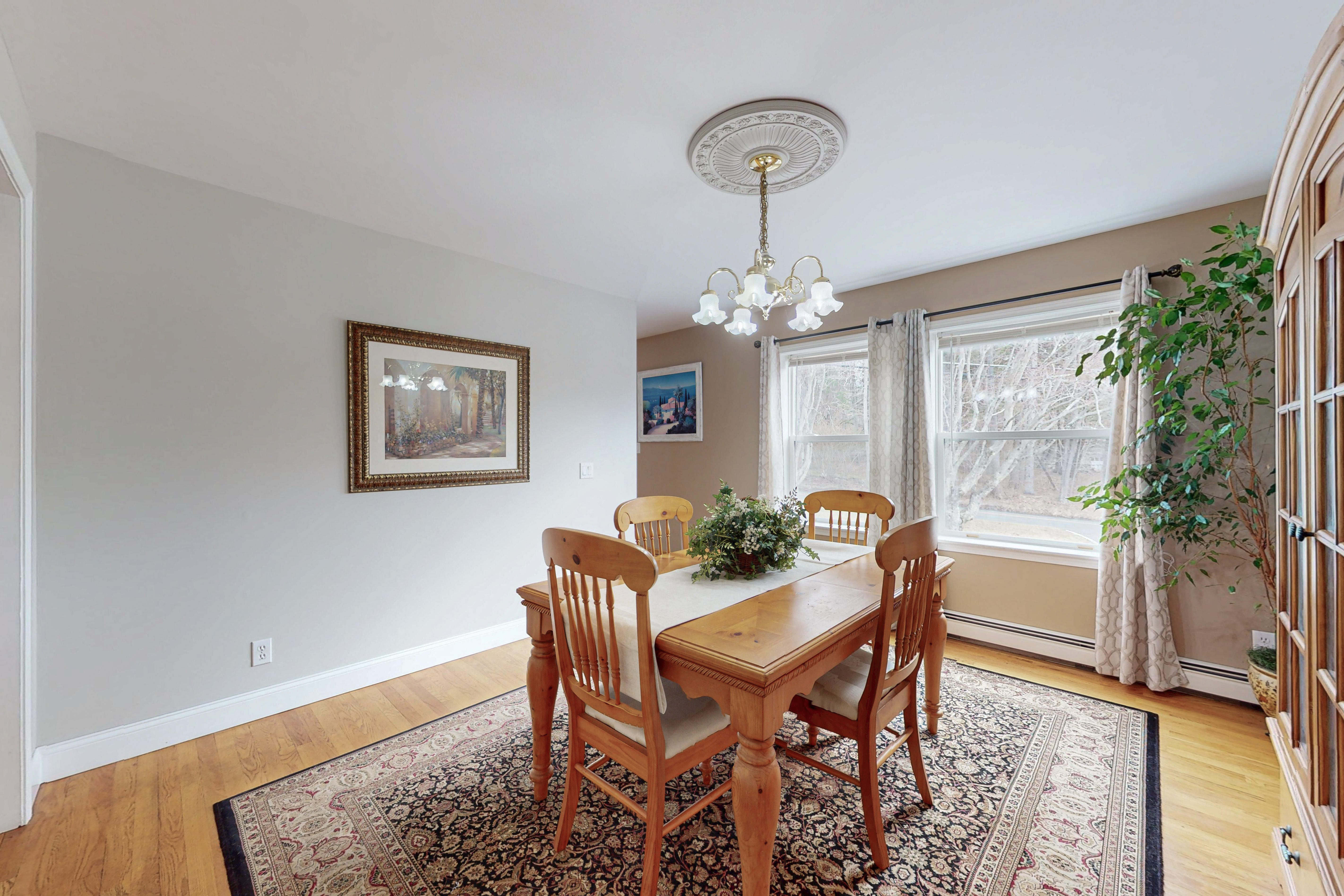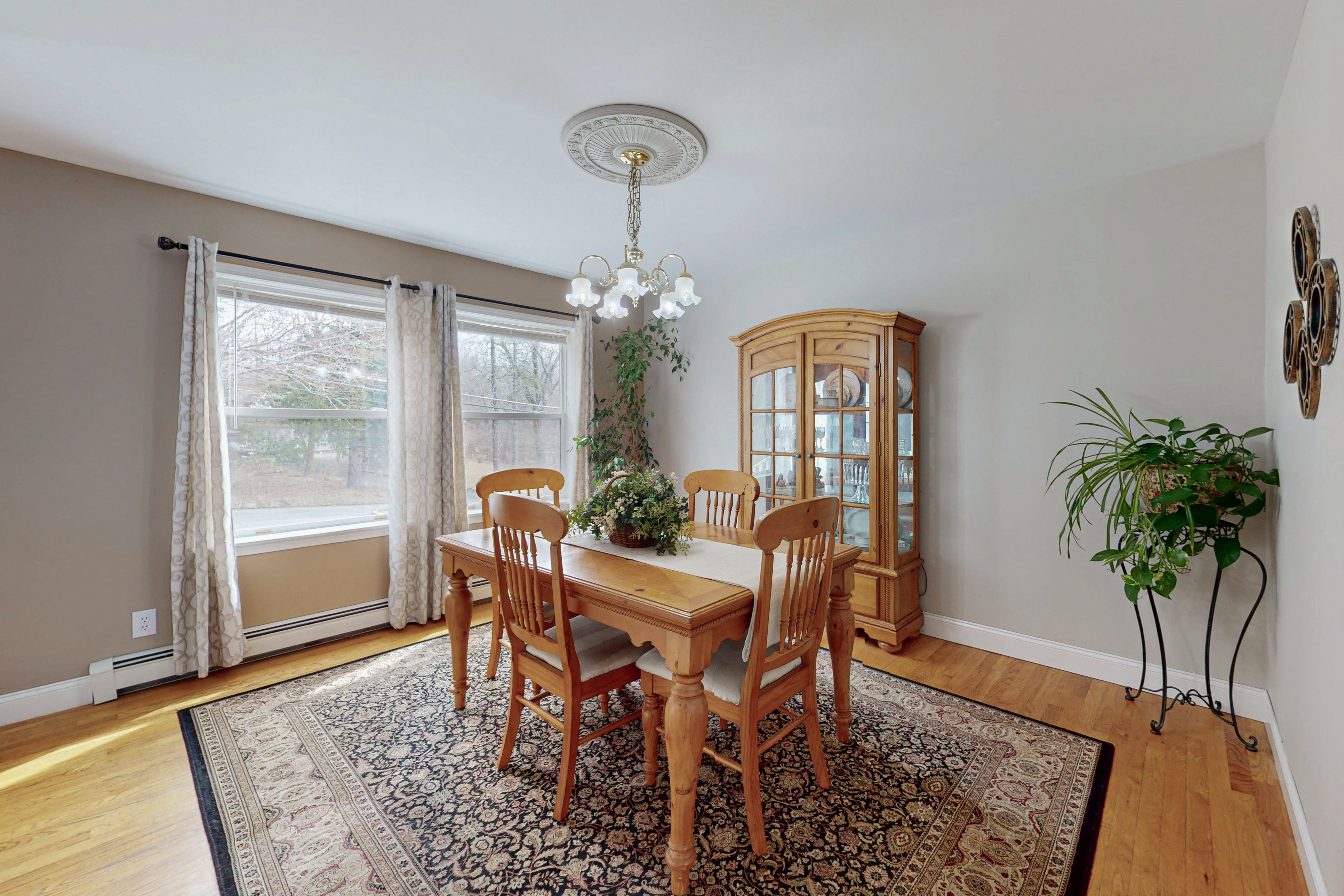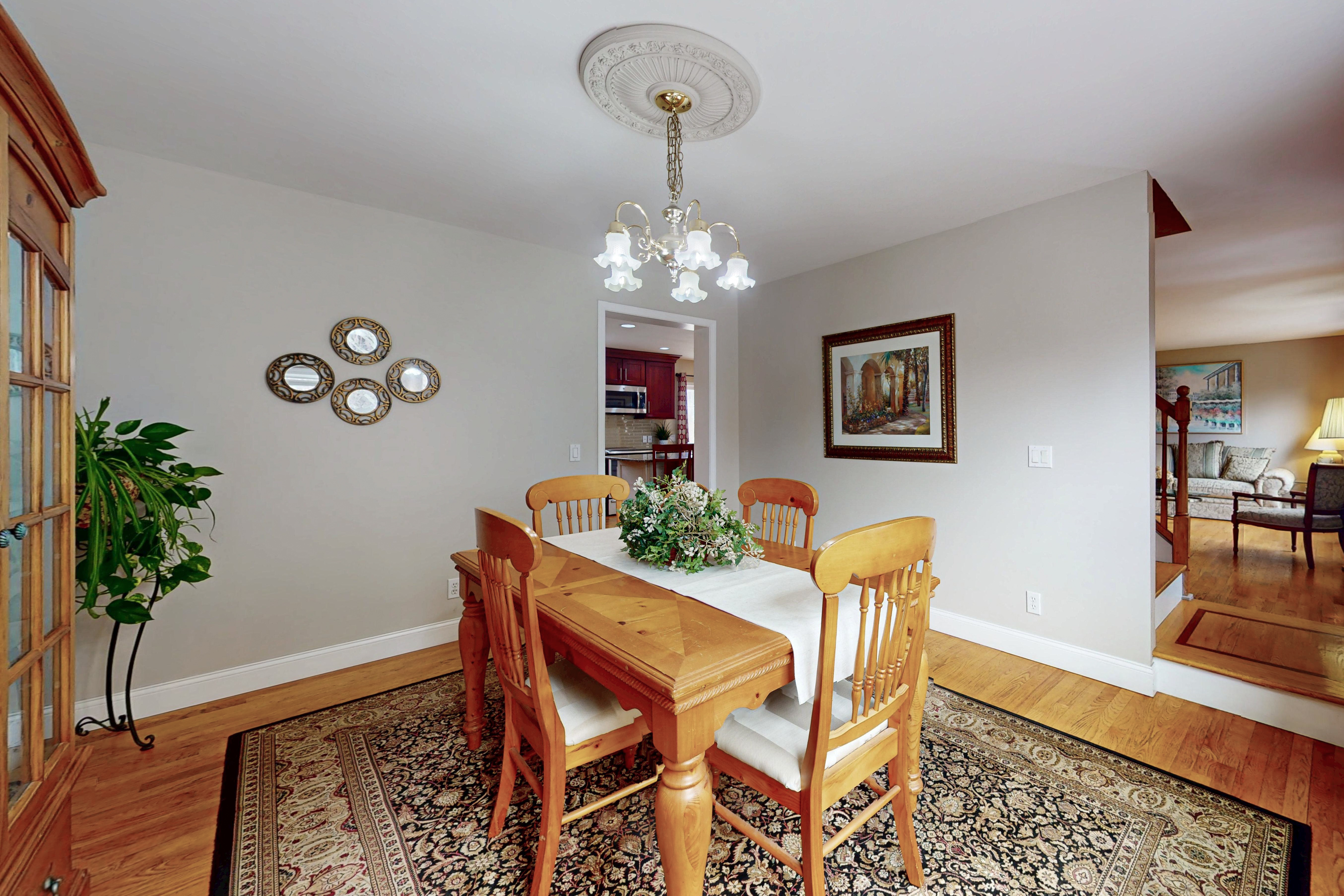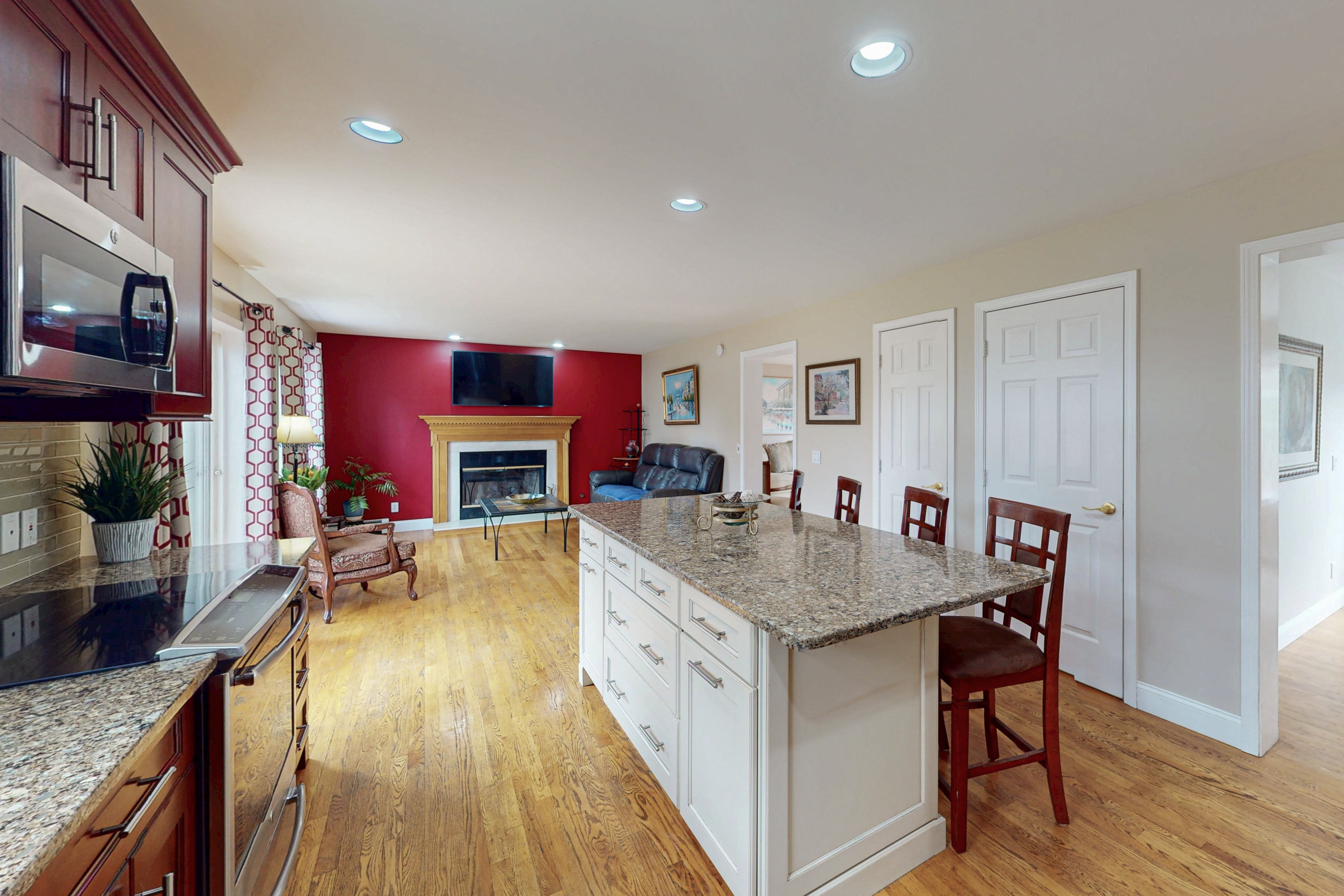This home is a true gem in Danbury, CT, offering a seamless blend of modern updates and classic charm. The exterior boasts a white color palette, vinyl siding, and a shed for additional storage. The interior is filled with natural light, highlighting the open floor plan, hardwood floors, and a gas fireplace in the family room. The kitchen is a chef's dream with cherry cabinetry, quartz countertops, stainless steel appliances, and a center island for extra prep space. The primary bedroom is a luxurious retreat with double walk-in closets and a spa-like ensuite bath with double sinks. Two guest bedrooms share a well-appointed full bath. The lower level provides flexible space for a home gym, office, or recreation room. The deck overlooks a private backyard with mature trees, perfect for outdoor entertaining.