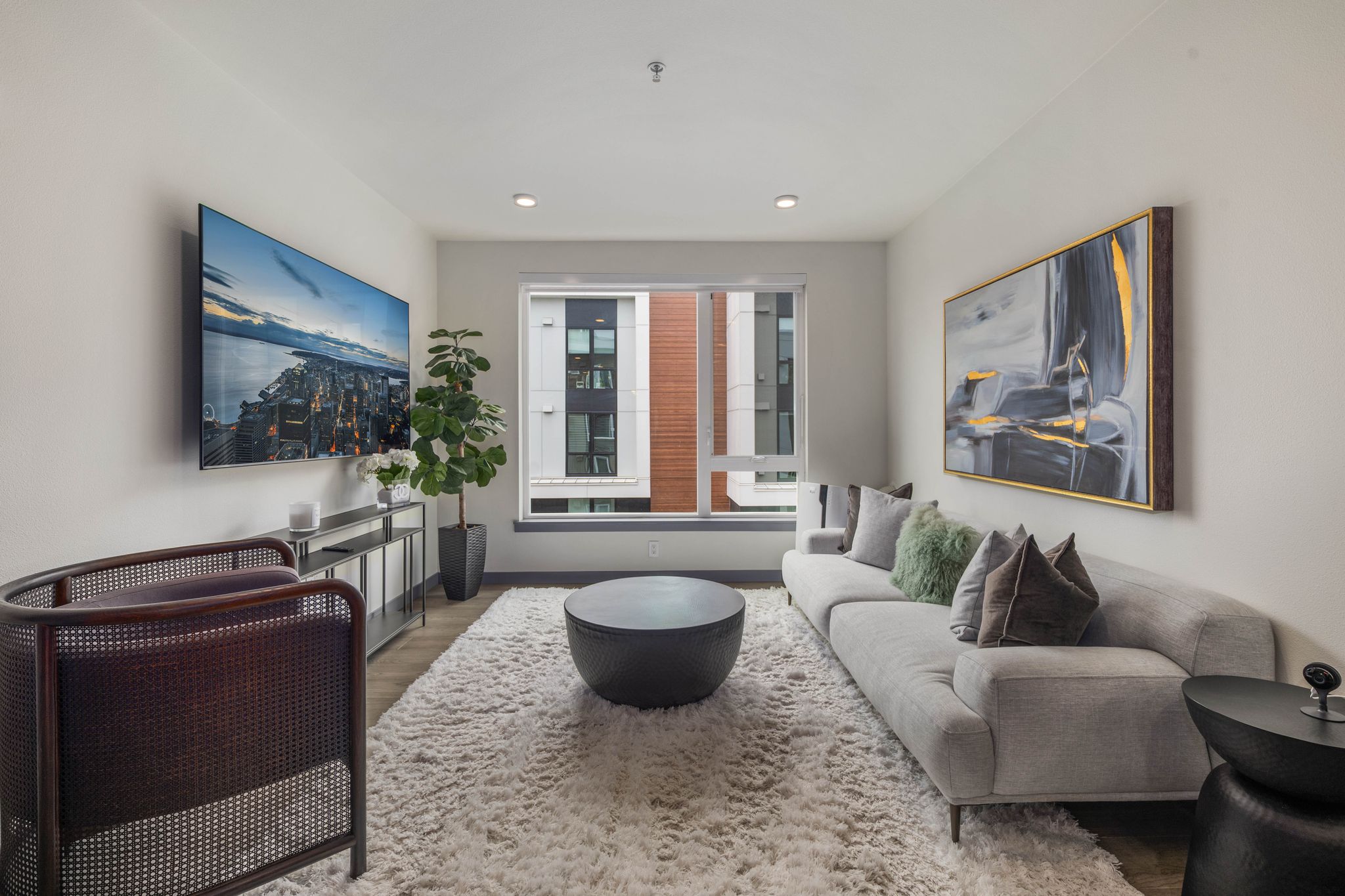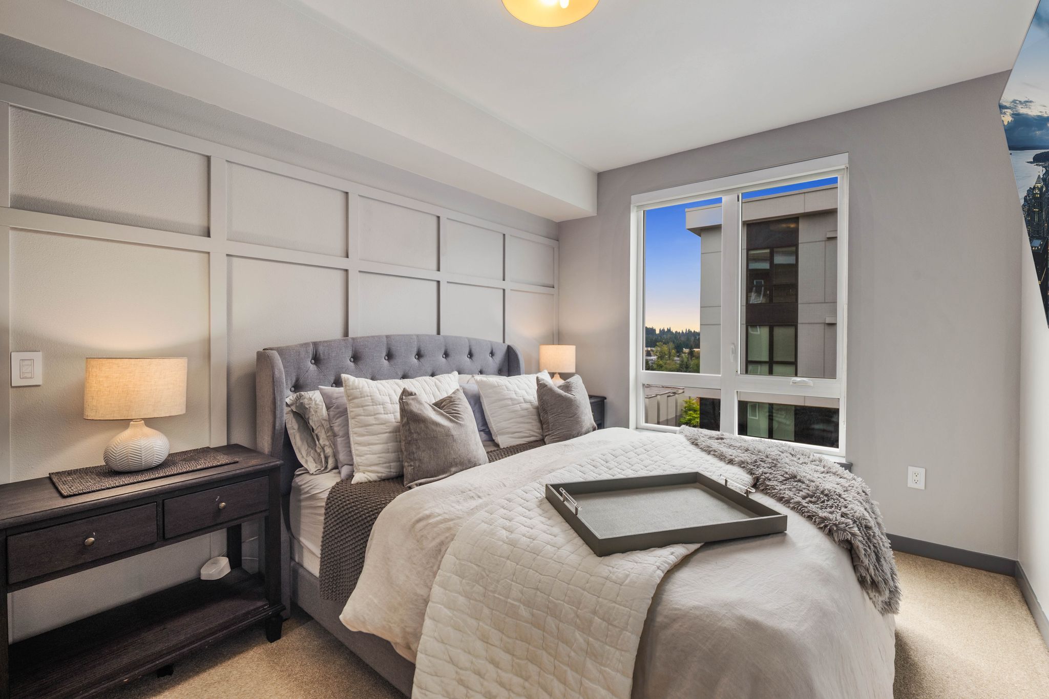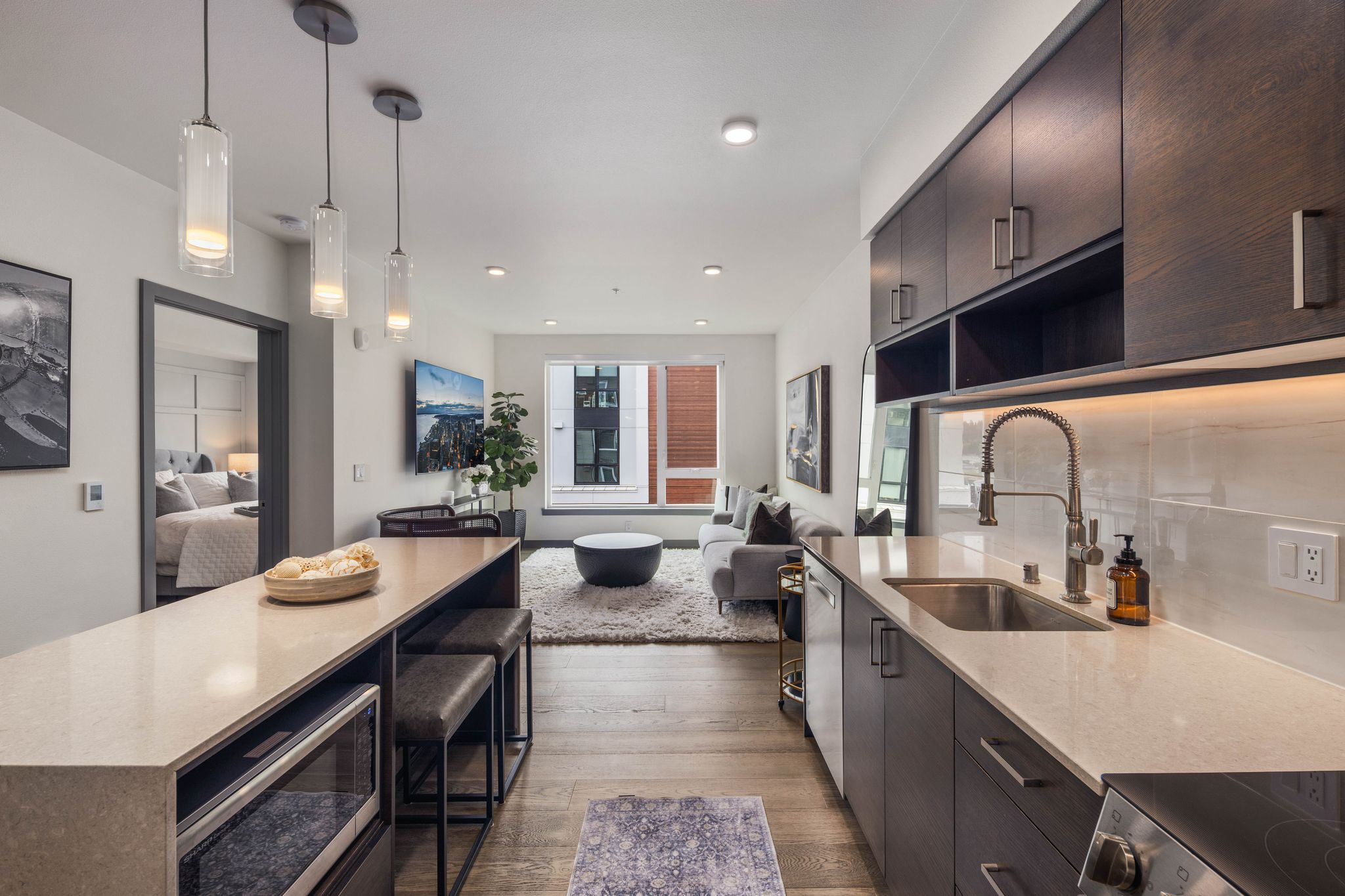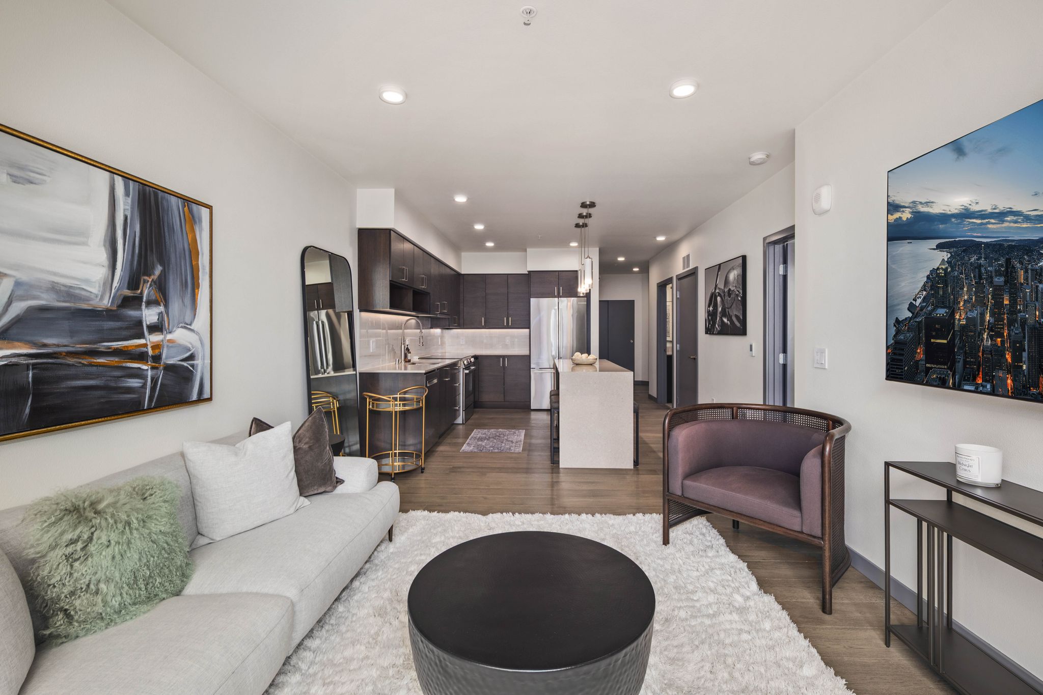 Live luxuriously in this FULLY FURNISHED 1-bedroom + den on the 5th floor, featuring smart lighting, a custom walk-in closet, and a flexible den for a home office or guest retreat. The open-concept kitchen boasts a quartz waterfall island, stainless steel appliances, and ample storage. In-unit washer/dryer and 1 premium parking stall included. Enjoy resort-style amenities: concierge, fitness center, club lounge, and rooftop deck with fire feature and BBQ. Minutes from The Village at Totem Lake, downtown Kirkland, top-rated schools, parks, dining, and shopping. Utilities included. Tenant occupied, please allow 24 hour notice. Available May 15, 2026 for move in.
