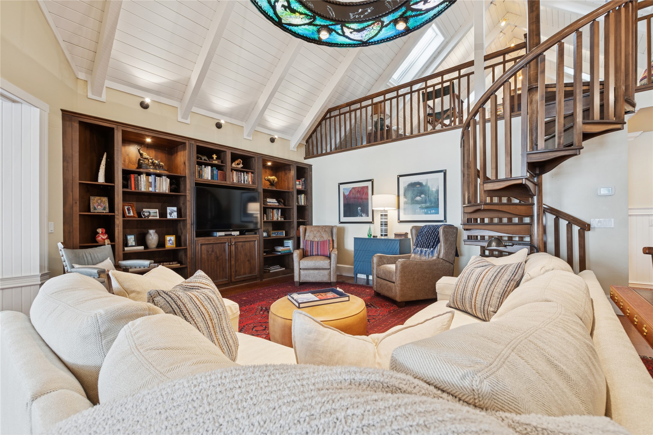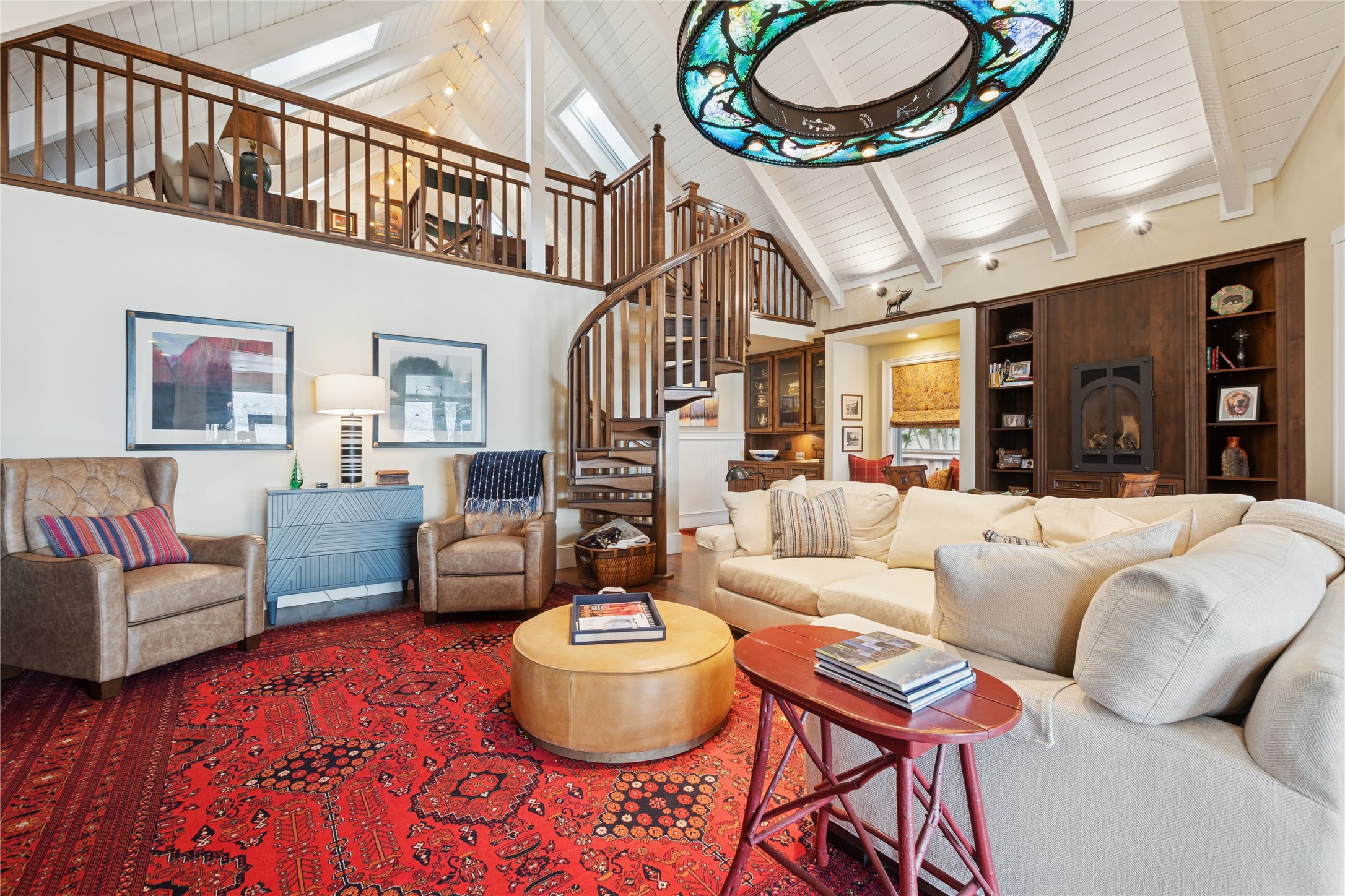 The great room includes a double-height ceiling, exposed structural elements, and an interior overlook. A wood spiral staircase provides vertical access to the upper level. Built-in cabinetry and shelving are integrated throughout multiple rooms, offering additional storage and functional workspace areas.