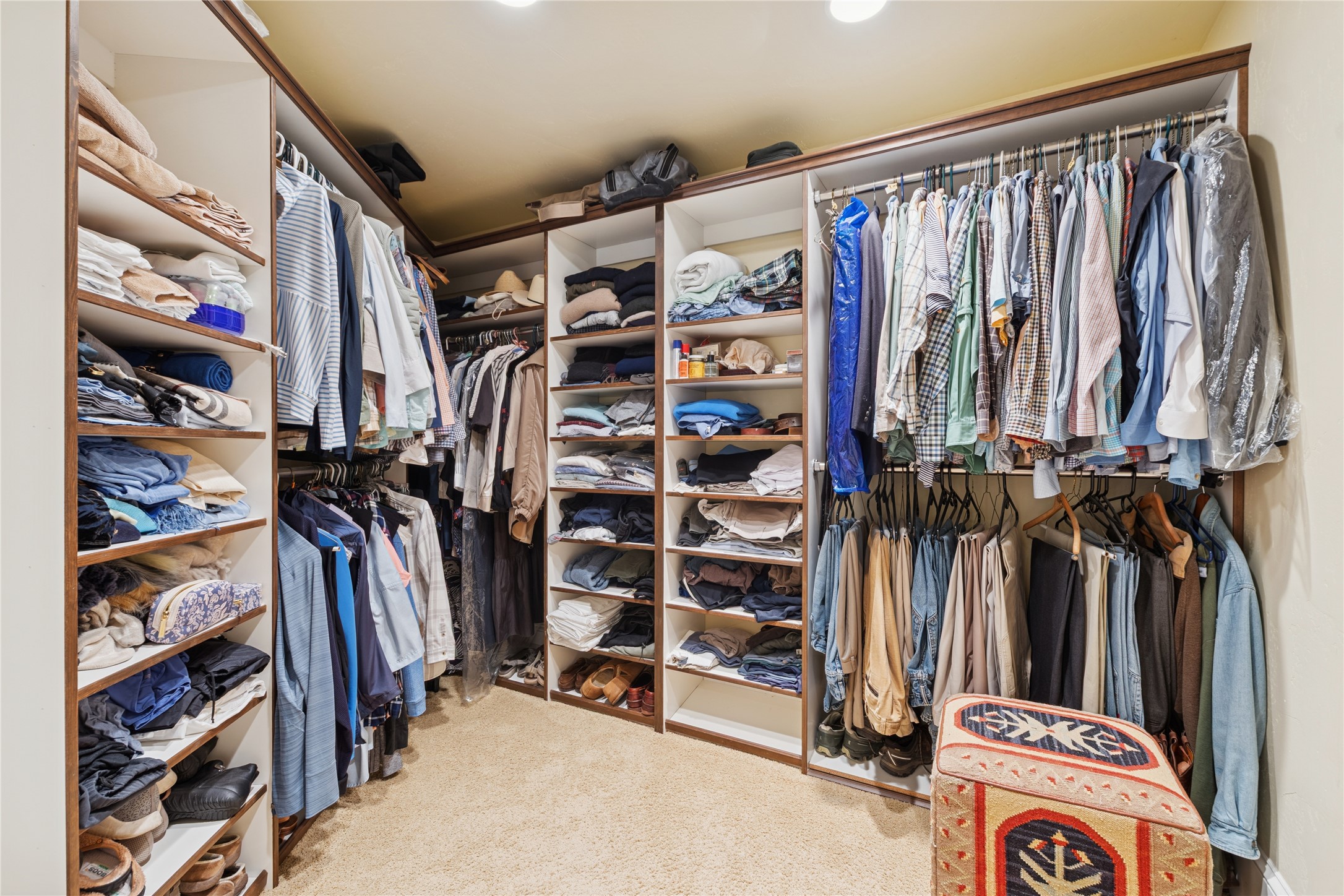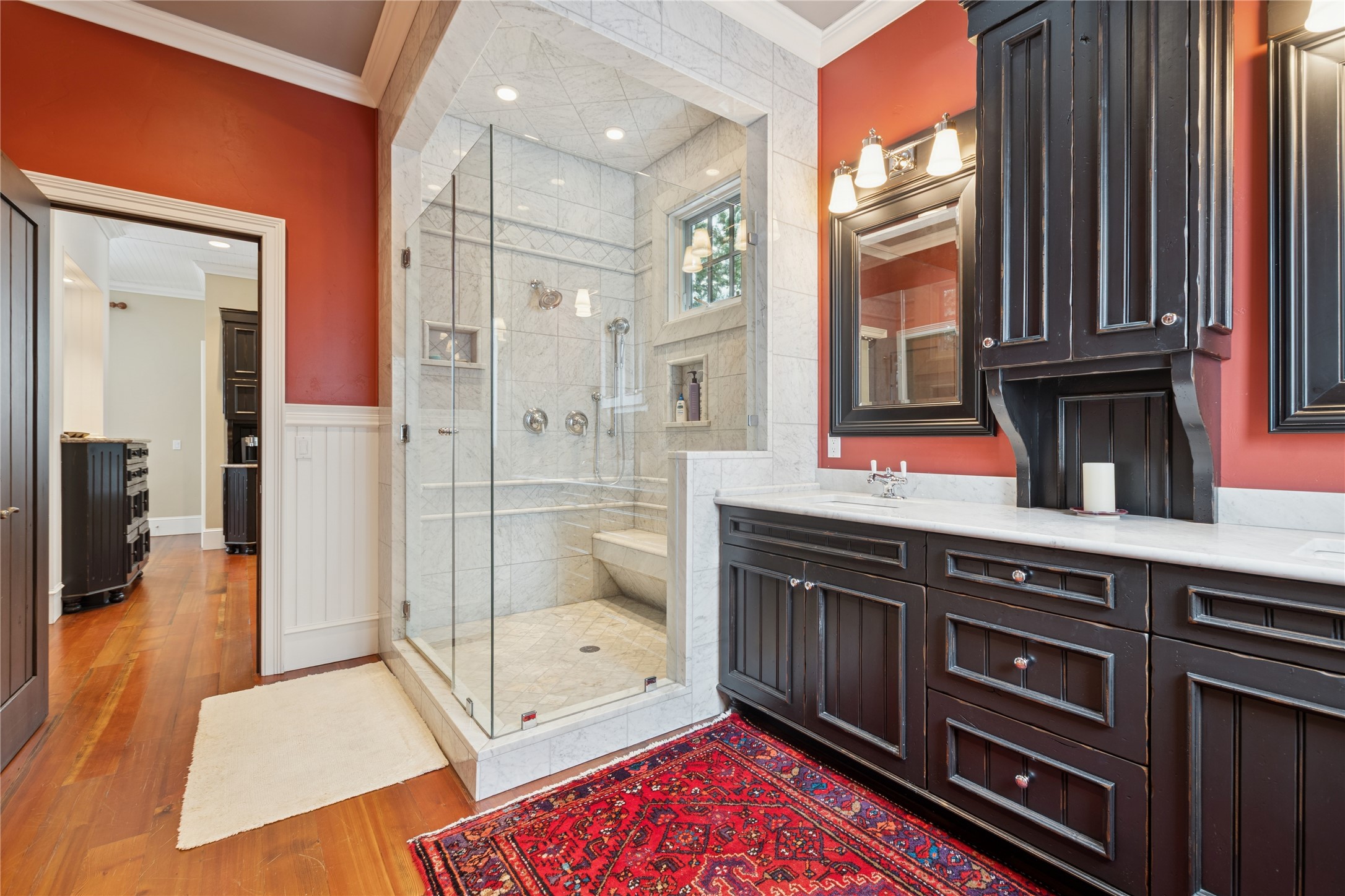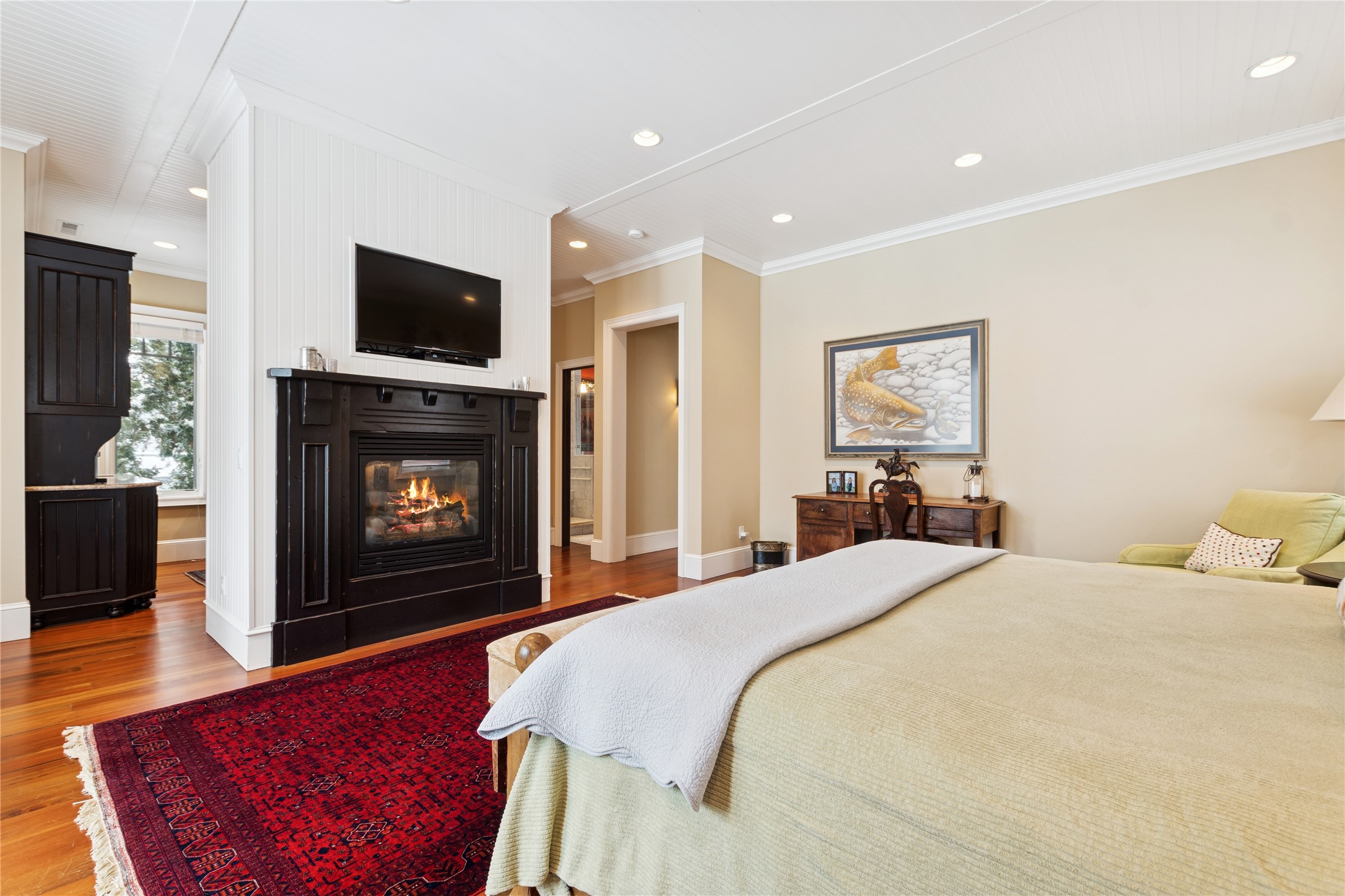 The primary suite is positioned to maximize water views and includes a fireplace, large windows, and an adjacent sitting area. The suite also features a walk-in closet with built-in organization and a bathroom with a soaking tub, and a full tile and glass shower enclosure.