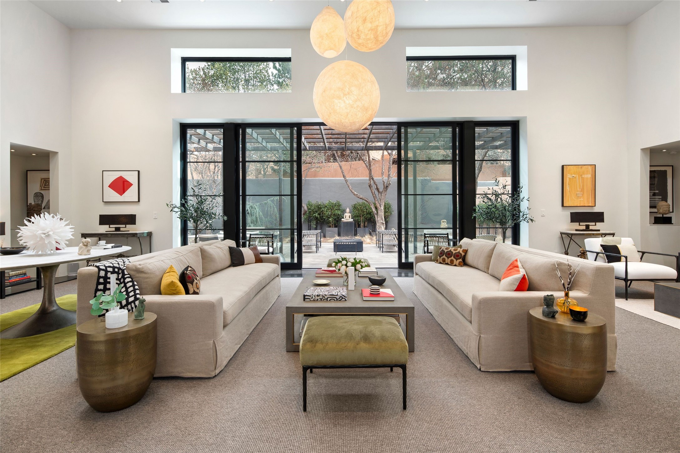 Exquisite Los Miradores 4-bedroom, 4.5-bath condo, where modern elegance meets artistic finesse. This stunning residence was reimagined and remodeled in 2020-2021, showcasing a balanced blend of wood, steel, glass, and stone that appeals to the most discerning tastes. As you enter, you'll be greeted by an impressive entry gallery with a clerestory window that bathes the space in natural light. The formal dining room, complemented by a wet bar, invites you to host dinner parties and soirees. Two-story grand living room includes sliding glass doors flanked by sidelights connecting to an entertainment patio complete with a gas fire pit and a contemporary steel pergola, ideal for alfresco dining under the New Mexican skies. Deluxe gourmet kitchen, featuring custom cabinetry, elegant quartz countertops, and top-of-the-line appliances, including a Wolf six-burner cooktop with griddle, Wolf wall oven, and Sub-Zero side-by-side refrigerator/freezer. Expansive center island and large breakfast area make this kitchen a culinary gathering area. The luxurious owner's suite, designed as a private sanctuary with a spa-like bath promises relaxation and tranquility. A guest suite is conveniently located on the ground floor, alongside a dedicated office and media room. Upper level, with two additional suites, each with en-suite baths, provide privacy for family or guests. High-walled patios and beautifully landscaped gardens. An oversized two-car garage ensures ample space for your vehicles and storage needs. The gated community of Los Miradores offers many amenities, including a seasonal pool, workout facility, tennis court and security patrol.