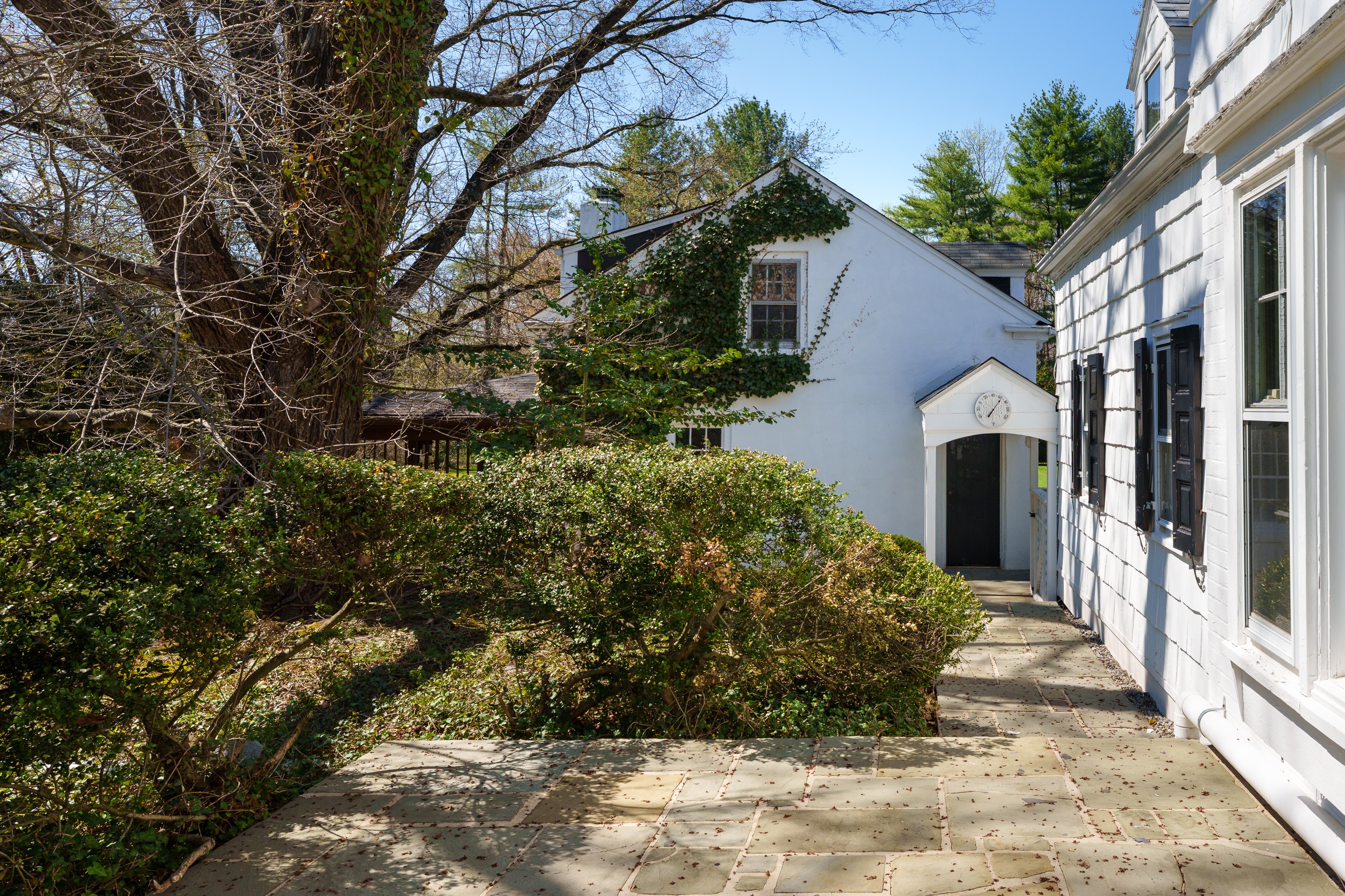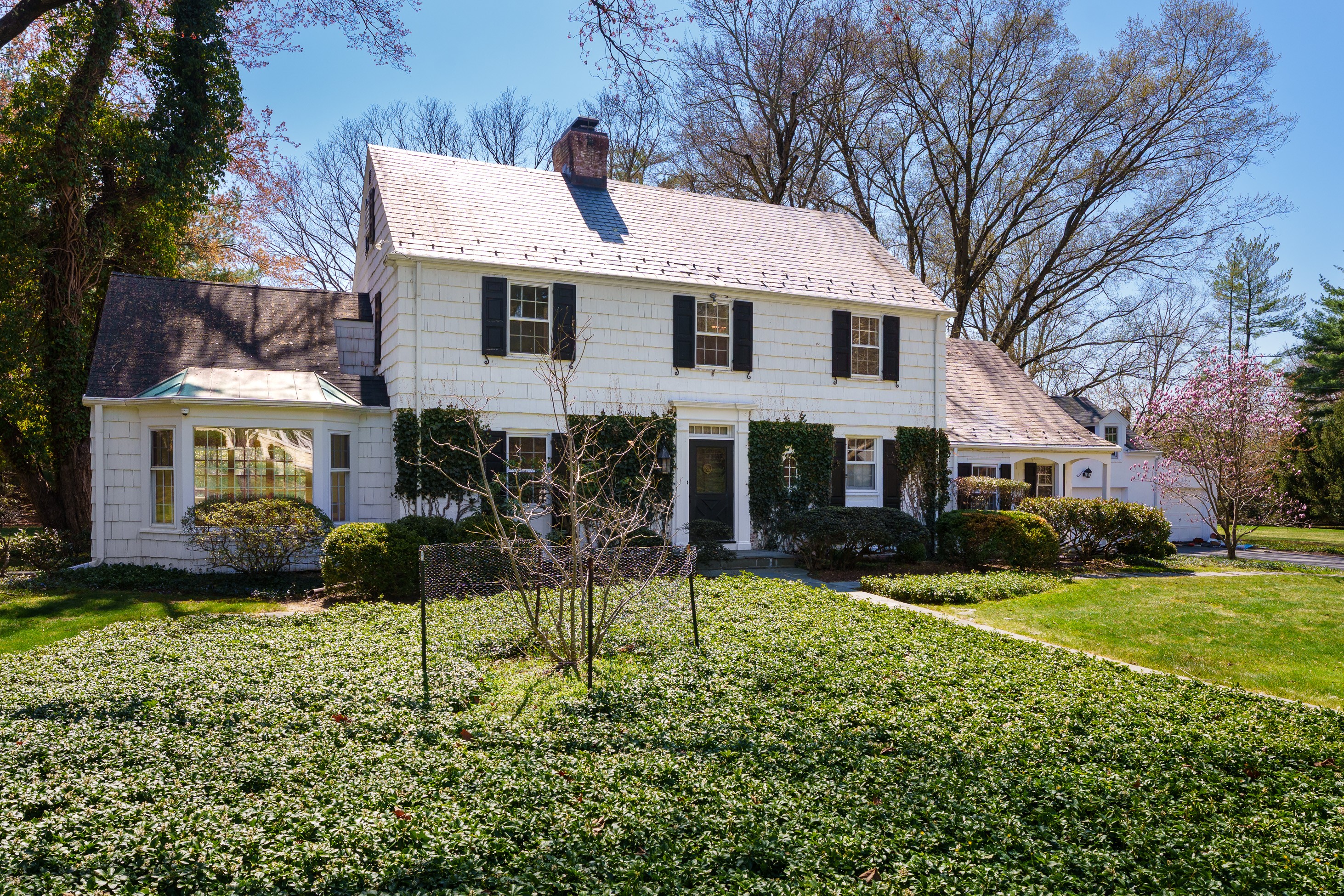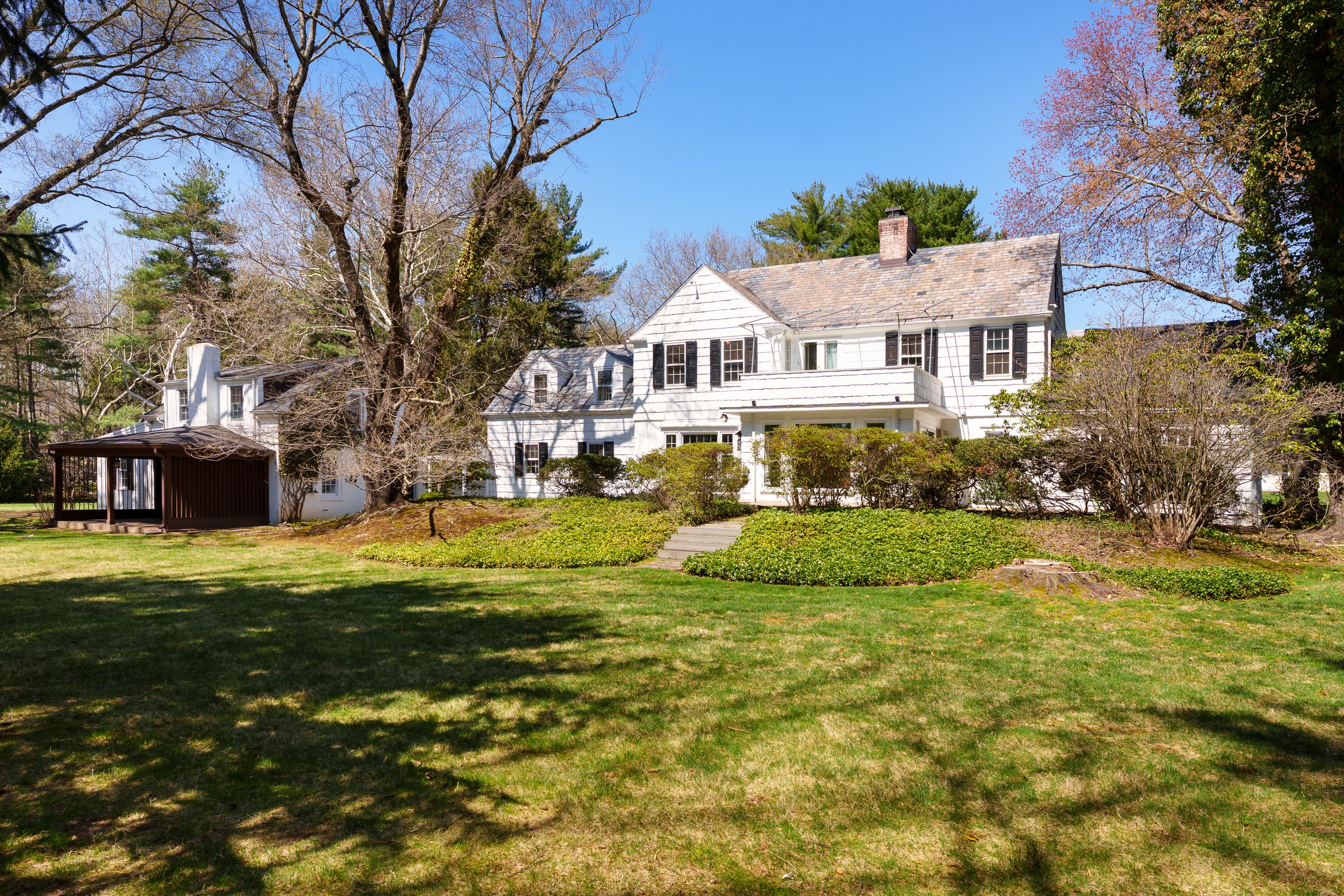 Set within the beloved Long Acres neighborhood, just a mile from The Lawrenceville School’s rolling campus and the shops and dining of Main Street, this charming shingled Colonial pairs a peaceful tree-lined setting with immediate access to I-295. Boasting an extra-wide lot, the property offers space, flexibility and exceptional potential. Inside, features like hardwood flooring, generously proportioned gathering spaces and a first floor suite provide a strong foundation for a cosmetic refresh. The open living and dining areas flow together, allowing both to enjoy the wood-paneled fireplace and hidden wet bar, while tucked-away storage keeps entertaining essentials ready to go. Merge the kitchen and breakfast room to create an expansive chef-approved workspace overlooking the sweeping backyard. A stone-floor sunroom invites relaxed afternoons in the cool shade, while above, a balcony soaks up sunset views. Two staircases lead up to four bedrooms, three with cedar closets, served by two full baths. The primary suite even includes a dedicated dressing room lined with storage. A first-floor wing with a private entrance offers ideal guest or au pair accommodations with convenient access to the laundry. A cozy family room with a second fireplace makes the lower level a destination for play and recreation, while a loft above the three-car garage presents additional space that can be customized for work or exercise. After being cherished by a single family for decades, this special home awaits the stylish touches of your choosing, resulting in an interior tailor-made for your contemporary lifestyle!