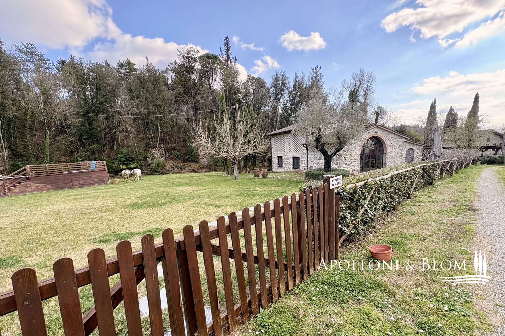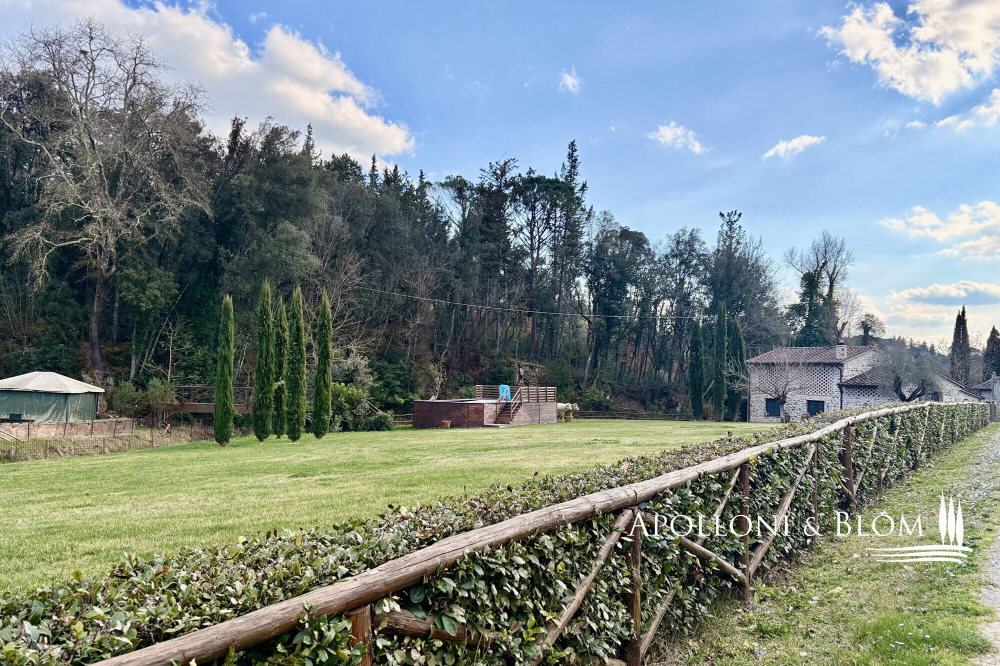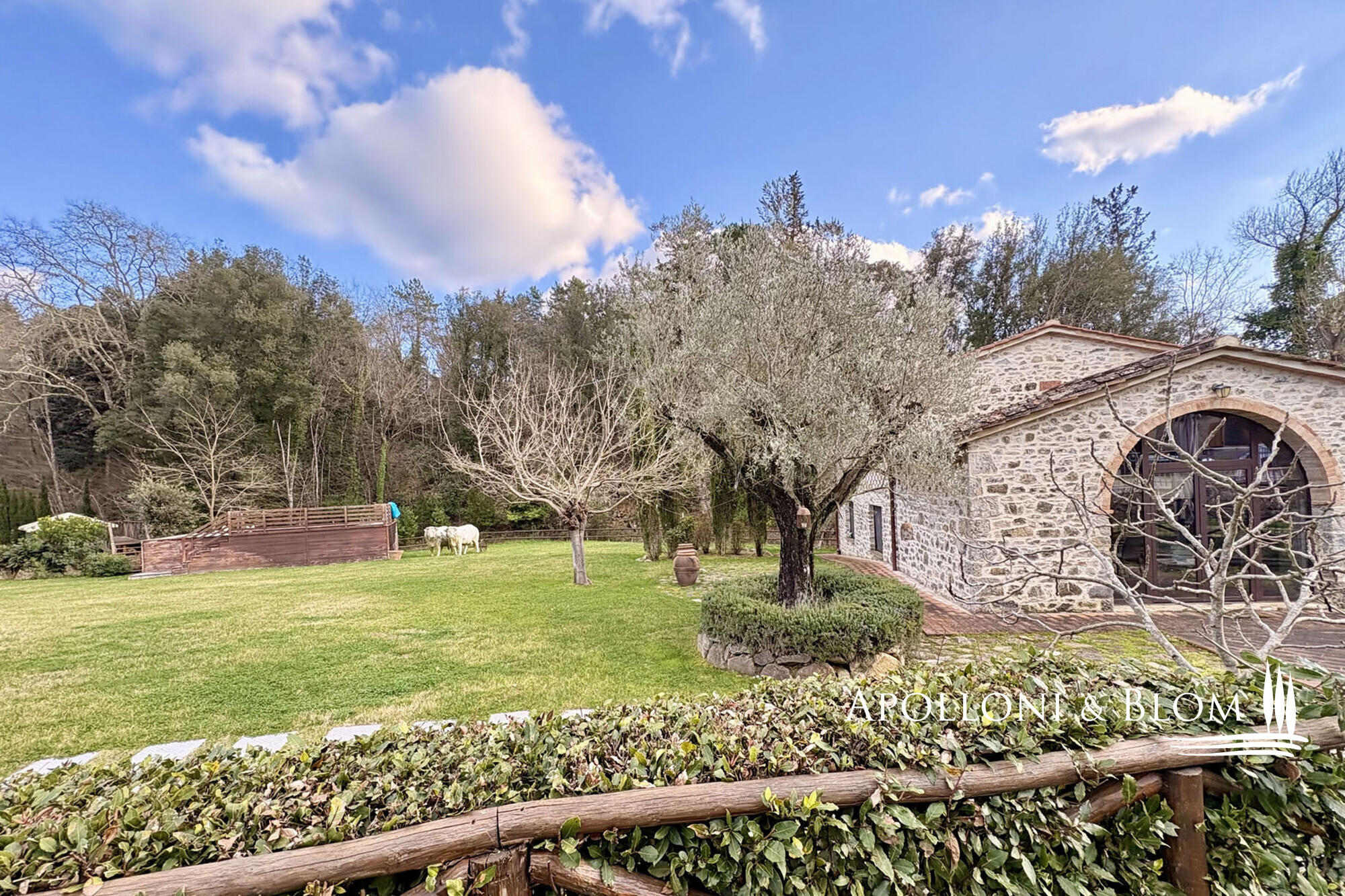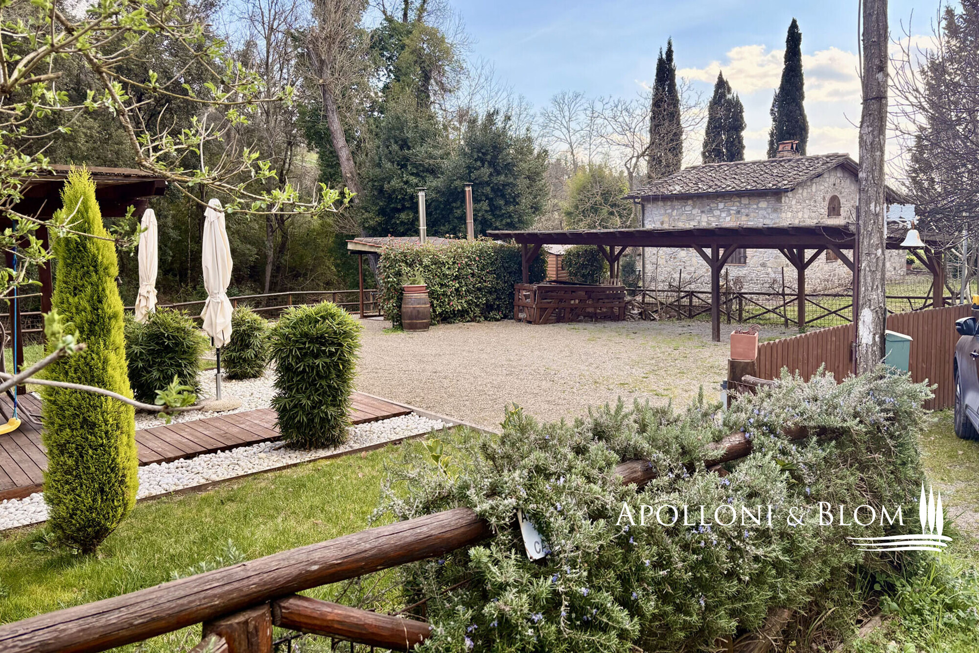 Restored rustic country house with one hectare of parkland, stream, private swimming pool and timber outbuildings for sale in Castellina in Chianti. Nestled in a valley carved by a picturesque stream, we are pleased to offer for sale a magnificent Tuscan stone barn of approximately 200 sq m/2,153 sq ft, expertly restored to the highest standards with outstanding energy efficiency (Energy Class A4). The exterior is distinguished by elegant exposed stone facades, enhanced by generous arched openings that flood the interiors with natural light, and decorative brick grilles in perfect keeping with local architectural tradition. The property is surrounded by a private park of approximately one hectare/2.47 acres, immaculately maintained, comprising woodland and an olive grove that extends beyond the stream, ensuring complete privacy. Outdoor amenities include a private above-ground swimming pool, a dining terrace with a wood-fired oven and barbecue, and a covered parking area with a timber canopy. The interiors offer a well-considered layout. On the ground floor, a loggia leads into the living and dining area, connected to a fully fitted masonry kitchen. Two steps down, an impressive sitting room opens up, featuring an open fireplace, polished resin floors, and exposed timber-beamed ceilings. A utility room and a bathroom with bath complete this level. The first floor, accessed via a staircase of contemporary design, houses the sleeping accommodation: two bedrooms and a second bathroom with shower. All rooms are finished in wood-effect porcelain stoneware and fitted with high-quality aluminium triple-glazed windows with mosquito screens. This property is ideal for those wishing to live immersed in nature without sacrificing modern comfort ,perfectly suited as a principal residence or as an exceptional holiday rental investment. PROPERTY Ref: CNT3575Location: Castellina in Chianti, Province: Siena, Region: TuscanyType: restored stone barn of approx. 200 sq m/2,153 sq ft, arranged over two floors, with garden, loggia and swimming poolEnergy Efficiency Rating: A4Annex: timber shed for firewood and garden equipYear of construction: 1700Year of restoration: 2010Conditions: excellentLand/Garden: 1 hectare/2.47 acres divided between parkland, woodland and olive groveTerrace/Balcony: external loggia and paved terrace with wood-fired oven and barbecueSwimming pool: private, above-ground, 5 x 3 mParking: covered canopy for 3 cars + open parking (4 spaces total)Utilities:Fixed telephone network: availableInternet: available (ADSL, cable, satellite TV, mobile network)Heating: pellet hydro-stove and hot/cold air-conditioning systemWater: mains city supply + natural spring well + rainwater collection well (electric boilers for summer use)Electricity: availableWater waste: Imhoff tankDistance from services: 7 km/4.3 miles (Castellina in Chianti and Poggibonsi)Distance from main airports: Florence 59 km/37 miles, Pisa 98 km/61 miles, Perugia 147 km / 91 milesGravel road: 1 km/0.6 milesLayout:Ground Floor: loggia, entrance into sitting/dining room, masonry kitchen, sitting room with open fireplace, 1 bathroom with bath, utility roomFirst Floor: 2 bedrooms, landing, 1 large bathroom with shower