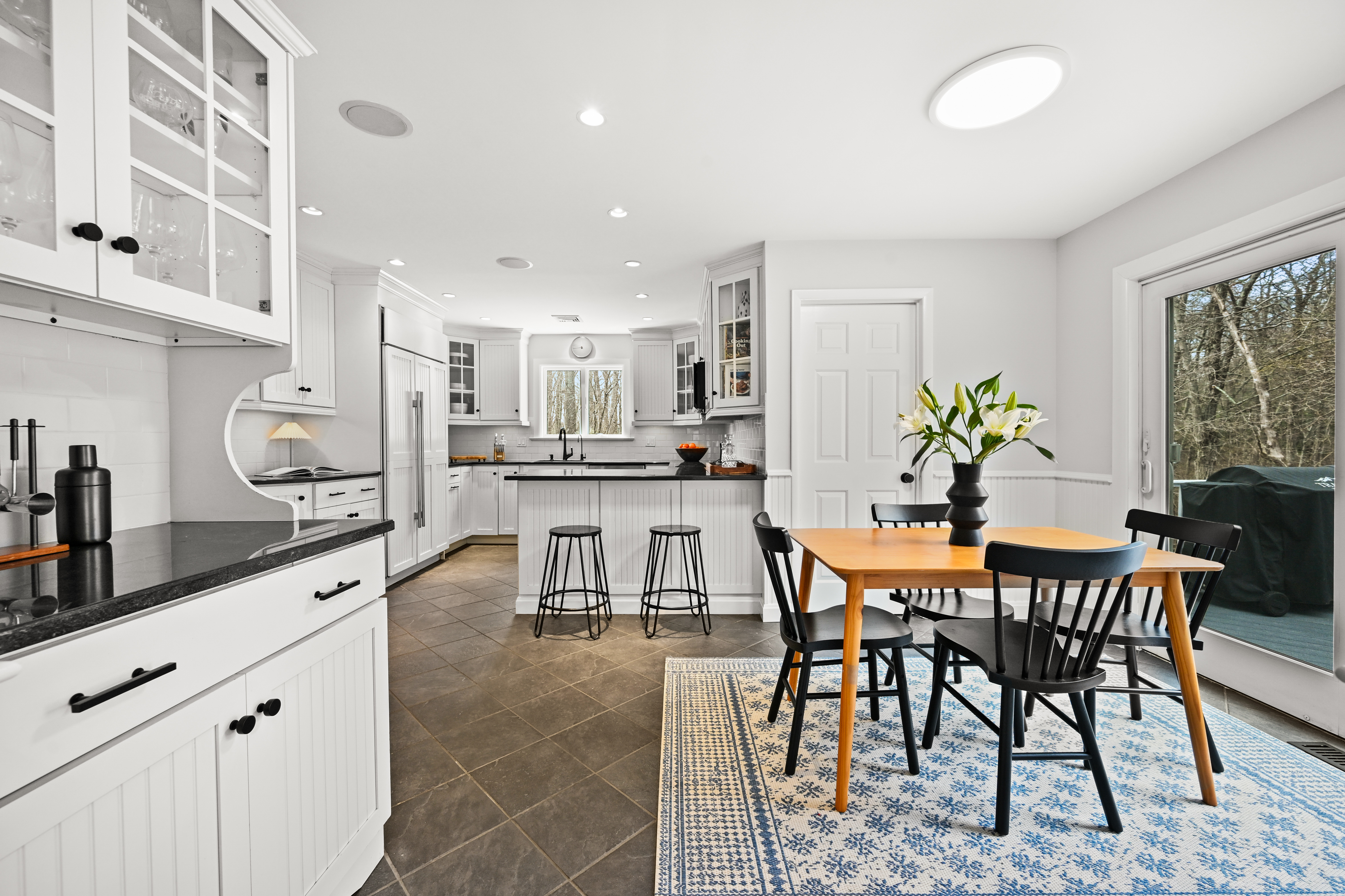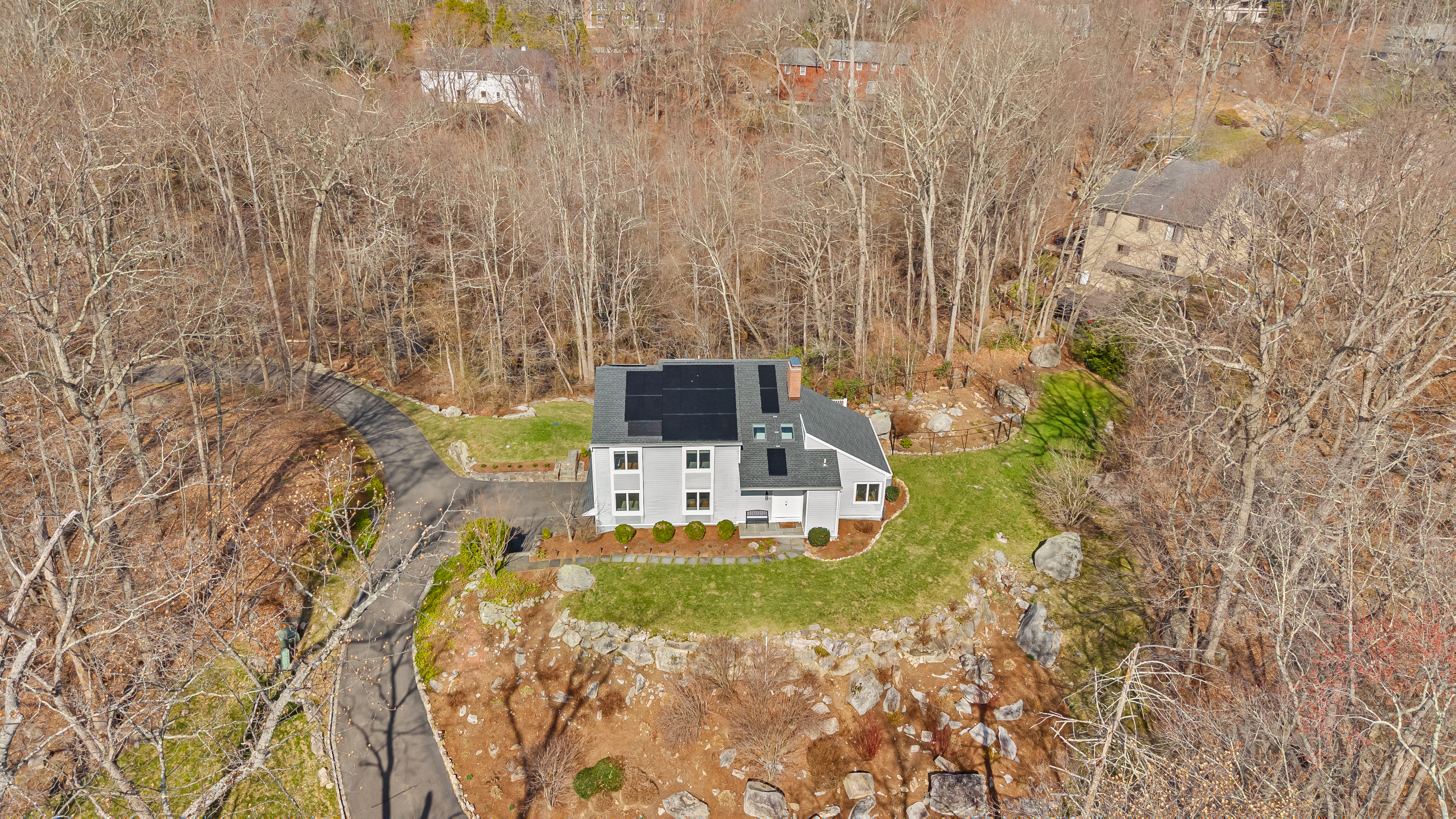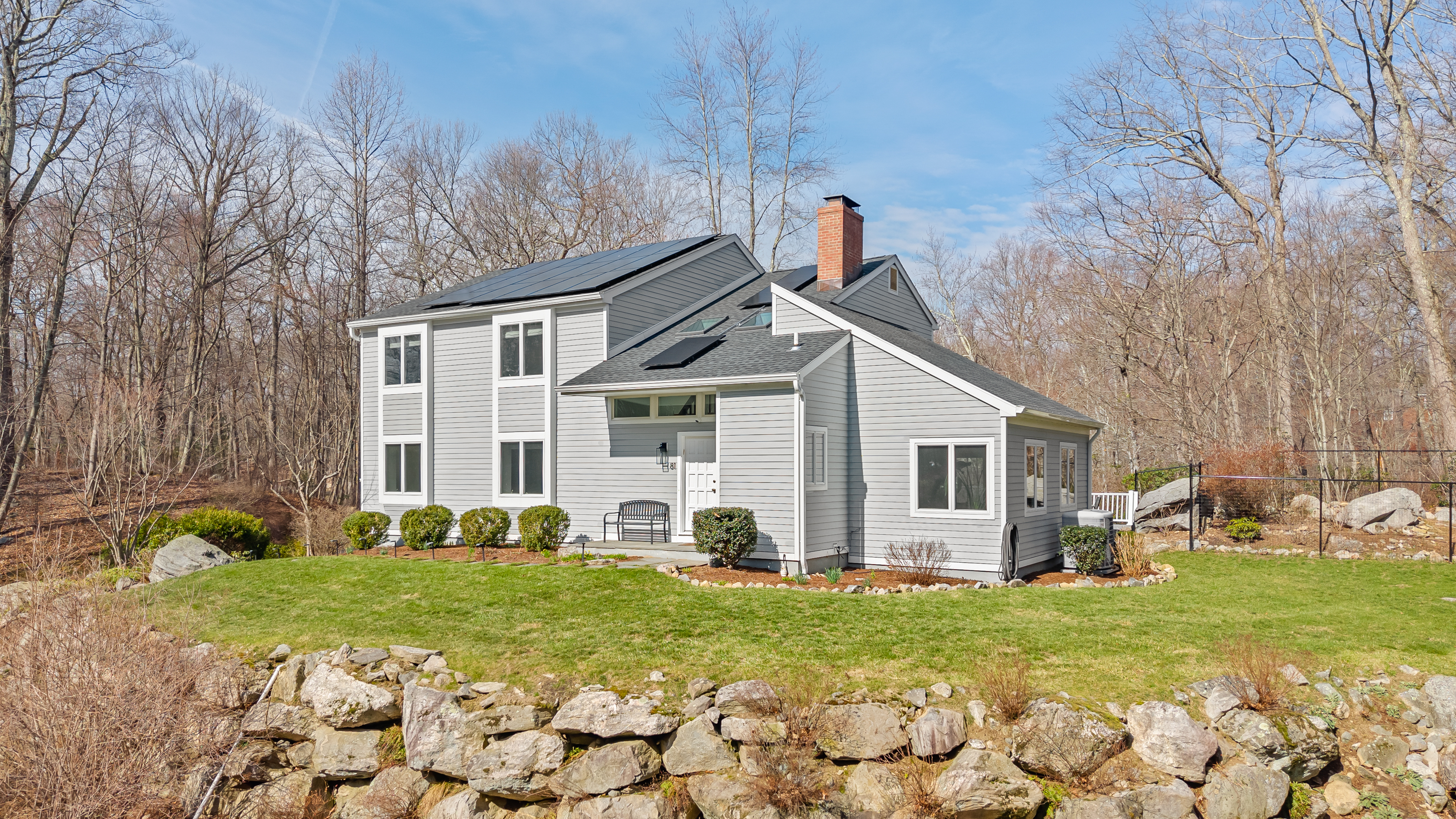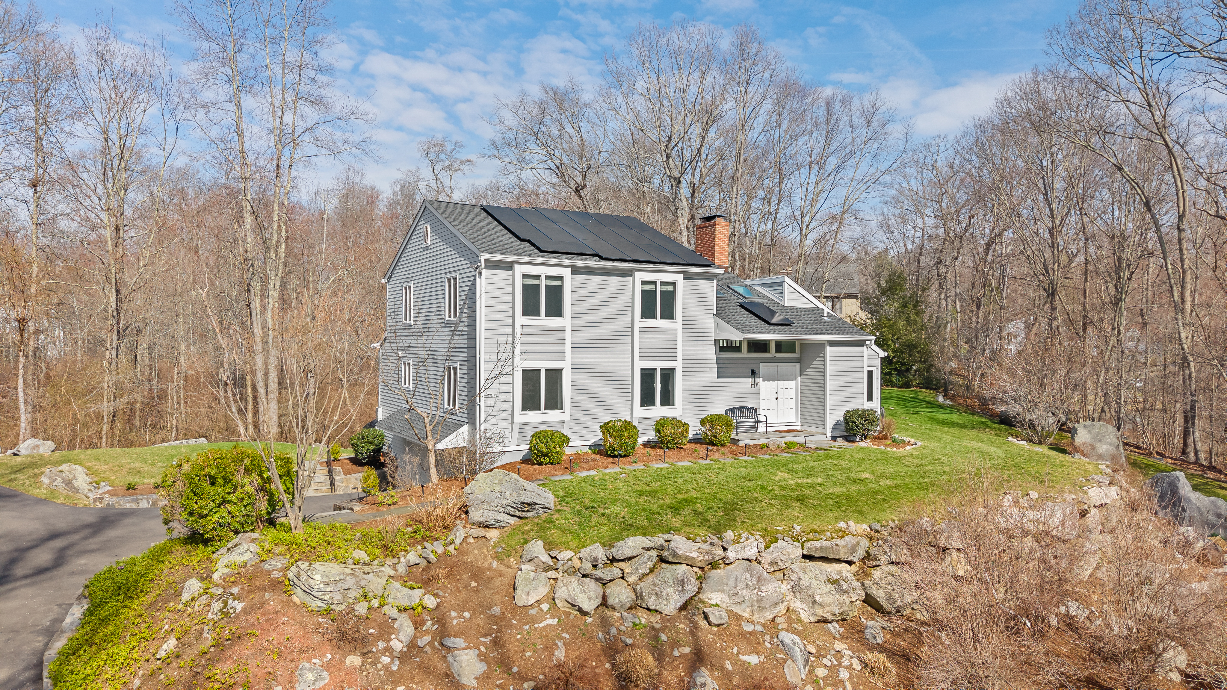 Set along a quiet private drive in North Stamford, this thoughtfully updated home offers a rare sense of calm, privacy, and effortless living. Positioned atop a gentle rise and backing to protected wetlands, the setting is both peaceful and enduring-surrounded by private, untouched land. Recent improvements enhance both longevity and ease, including Hardie Board siding, Trex decking, and a new roof, skylights, gutters, and guards. Fully paid solar panels support an energy-conscious lifestyle. Inside, the home is defined by light and openness. Skylights and expansive windows fill the space with soft natural brightness, while vaulted ceilings in the sitting room and primary bedroom add volume and airiness. Two working fireplaces, one a wood-burning stove, create warmth and character throughout. Radiant heated floors in the kitchen and advanced water filtration systems elevate everyday comfort. An oversized two-car garage offers added functionality, while the surrounding landscape provides a lasting sense of stillness and privacy-all just minutes from the Merritt Parkway and downtown Stamford.