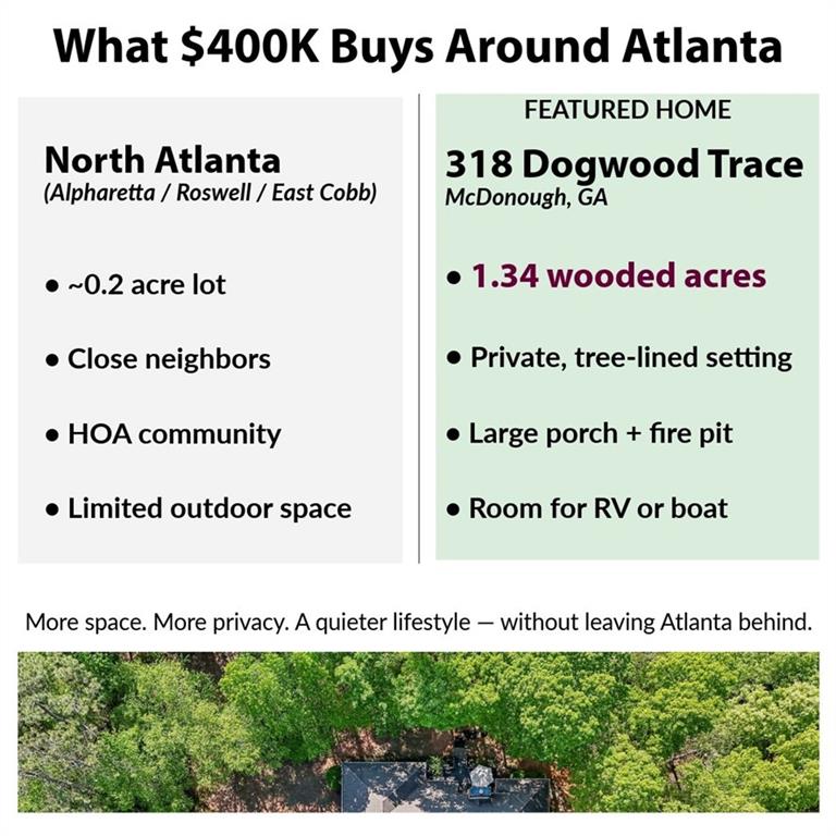 What if home didn't just check the boxes - but actually felt like a place to exhale? Tucked away on 1.34 wooded acres in McDonough, this well-maintained single-story home offers the kind of private, peaceful setting many buyers are craving right now - but rarely find at this price point. Surrounded by mature trees and natural privacy, the property creates a true sense of escape - while still being within a convenient drive to Downtown Atlanta and Hartsfield-Jackson Airport. Inside, the home features a spacious single-level layout with a desirable split-bedroom floor plan, offering both comfort and functionality for everyday living. Main-level living provides ease and simplicity, without the need for stairs. Step outside, and the lifestyle this property offers really begins to shine. A welcoming front porch invites you to slow down, while the backyard opens to a private, tree-lined retreat. The fire pit area creates a natural gathering space - perfect for quiet evenings or time with family and friends under the trees. There's also the kind of flexibility that's becoming harder to find, with space for an RV, boat, or outdoor equipment - giving you the freedom to fully enjoy both the property and your time at home. Located in the sought-after Kelleytown area within the Union Grove School District in Henry County, you'll still have convenient access to shopping, dining, parks, and a year-round farmers market - without giving up the space and privacy that make this home feel like a getaway. For buyers comparing options closer to Atlanta, this property offers something different - more land, more privacy, and a lifestyle that feels removed from the noise, without losing connection. Homes offering this combination of acreage, single-level living, and everyday escape are becoming increasingly rare.