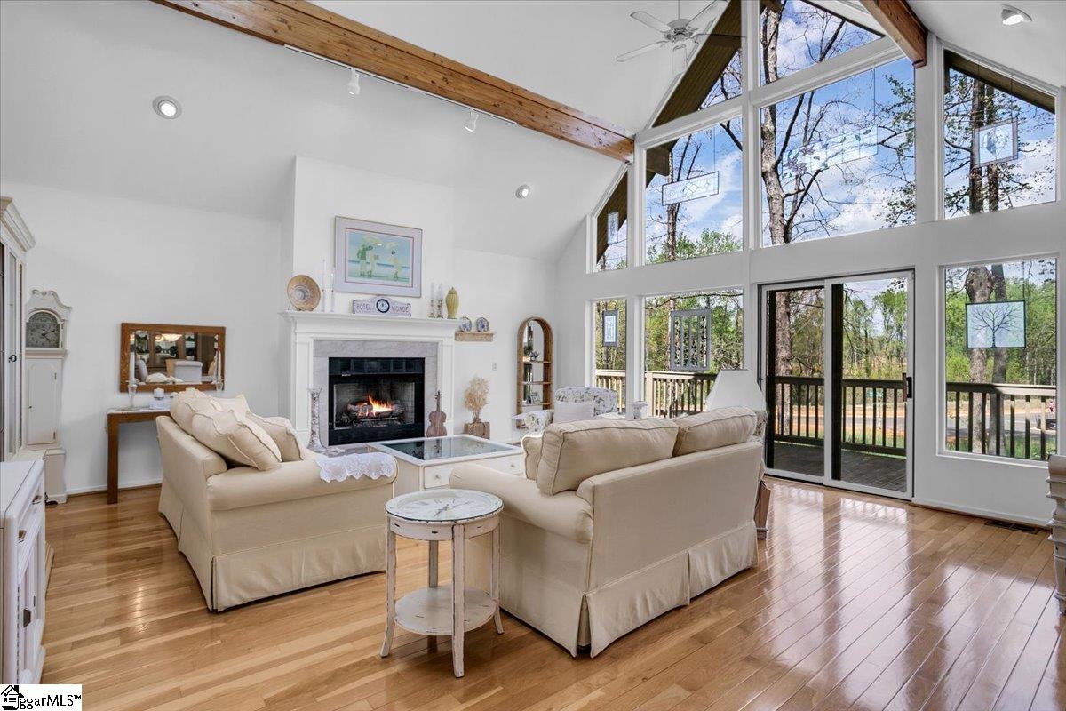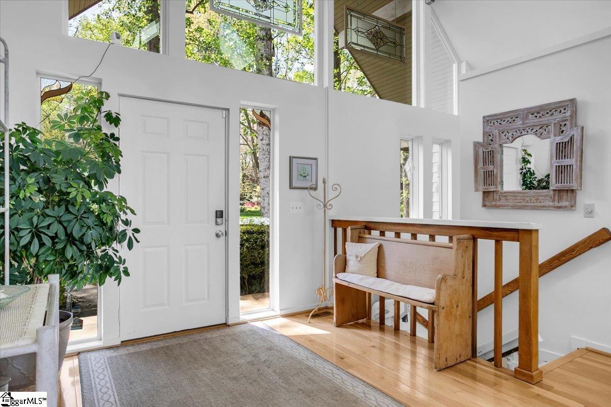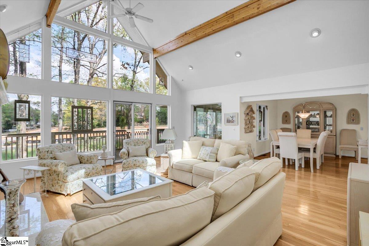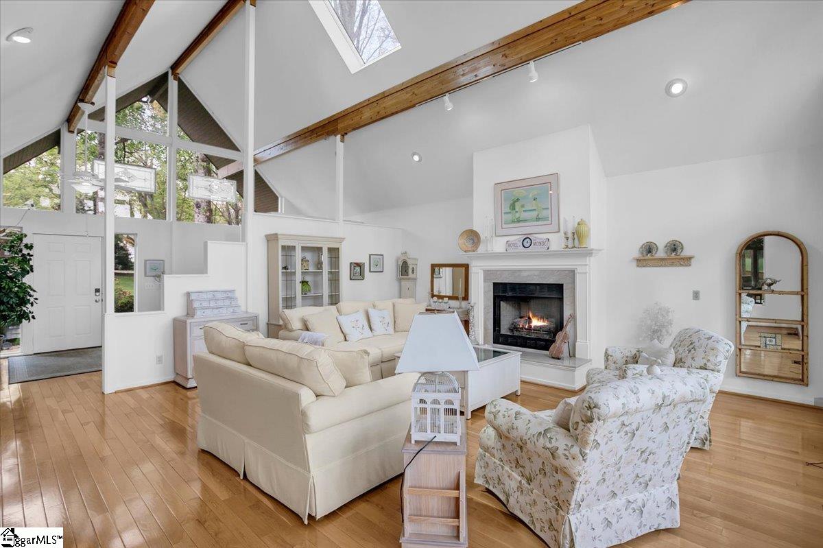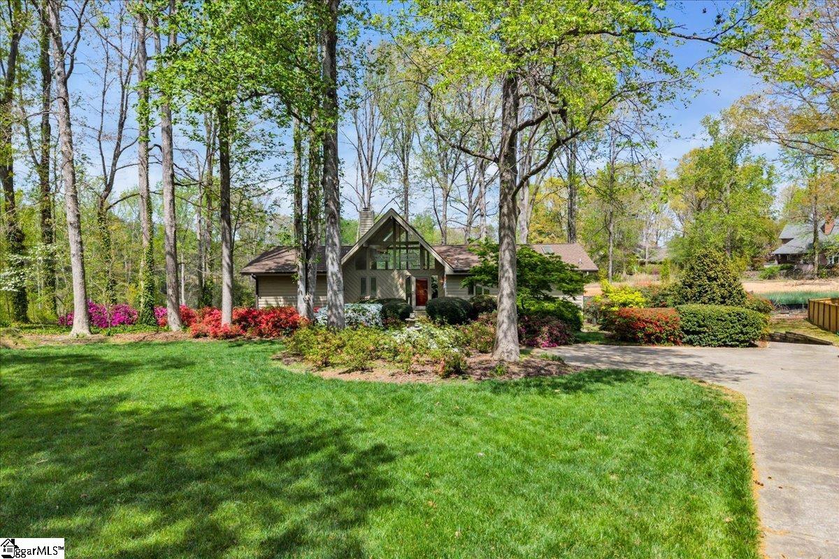 If you're looking for a bright, sunny place to "light," this is the house for you. Located in popular Pebble Creek in the Linkside subdivision, this home has plenty of curb appeal. From the minute you drive in, azaleas and beautiful, shady trees greet you. The contemporary designed Lindal house is perfectly situated on the cul de sac lot. Enter the house and be immediately uplifted by the open, airy feel of the house. Banks of windows bring in light and view of the beautiful surroundings. There are gleaming hardwoods throughout much of the house. Vaulted ceilings and a handsome fireplace star in the living room. The dining room, just off the living area, is cozy and just one of the many great places to entertain. The kitchen (with a den off to the side) is an inviting place to gather and cook with family and friends. A breakfast nook, with built in cabinetry, provides a spot for informal meals. Enjoy a cup of coffee or tea in the sun room that overlooks a grilling deck and the backyard retreat beyond. The primary bedroom has cathedral ceilings, glass doors leading out to the deck, and a private bathroom and walk in closet. There is a half bath on this level for guests. Downstairs (walk out/daylight basement) are two additional bedrooms with ensuite bathrooms. The laundry is generously sized and there is an office space, as well. The oversized garage has a back entry and plenty of parking space. I don't think that categorizing this house as a "fairy tale" house is too much of a stretch, considering the feeling that the home evokes. The location near downtown Greenville and all it has to offer, from restaurants and entertainment venues to world class healthcare facilities, is an added bonus. Other destinations, such as Greer, Travelers Rest, the mountains of NC and the beaches of SC, are within easy driving distance. The Greenville Spartanburg International Airport and interstate highways are moments away. Come see what this Southern living gem of a home has to offer. Roof replaced 2022; HVAC replaced 2024; water heater replaced 2022; dishwasher and disposal replace 2026.