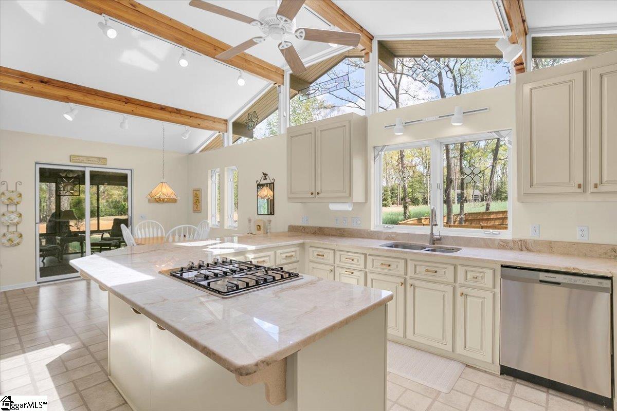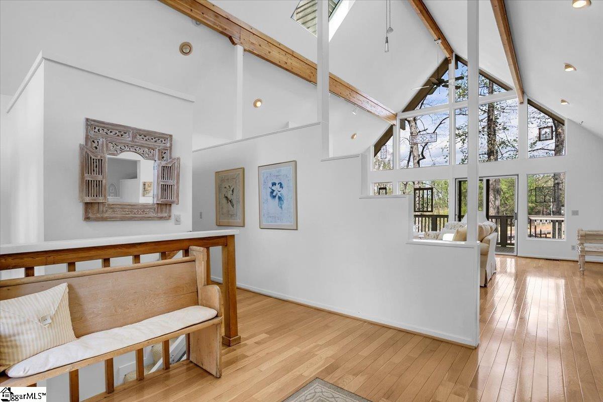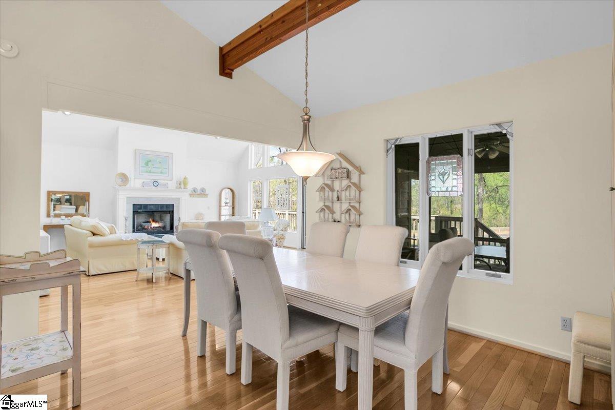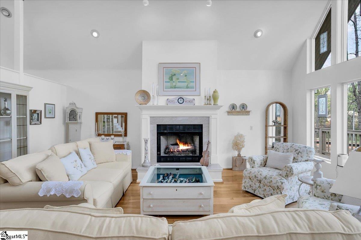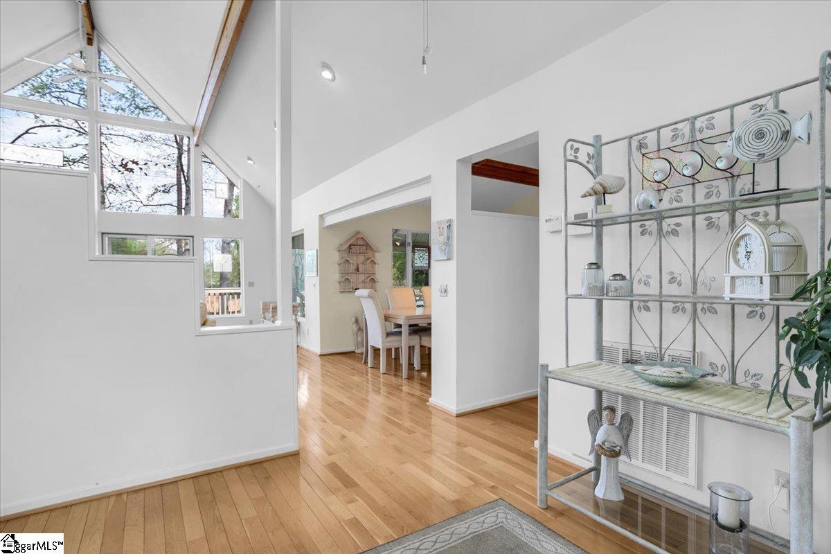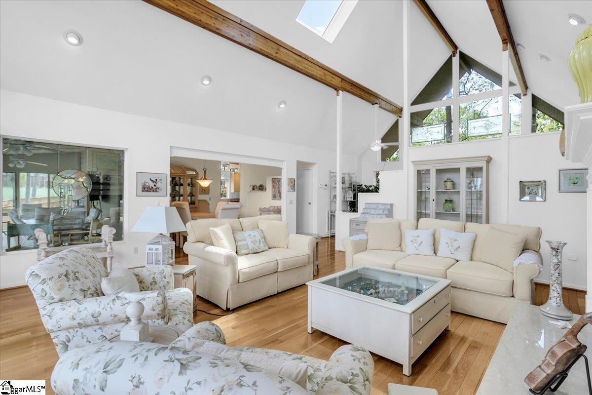 If you're looking for a bright, sunny place to "light," this is the house for you. Located in popular Pebble Creek in the Linkside subdivision, this home has plenty of curb appeal. From the minute you drive in, azaleas and beautiful, shady trees greet you. The contemporary designed Lindal house is perfectly situated on the cul de sac lot. Enter the house and be immediately uplifted by the open, airy feel of the house. Banks of windows bring in light and view of the beautiful surroundings. There are gleaming hardwoods throughout much of the house. Vaulted ceilings and a handsome fireplace star in the living room. The dining room, just off the living area, is cozy and just one of the many great places to entertain. The kitchen (with a den off to the side) is an inviting place to gather and cook with family and friends. A breakfast nook, with built in cabinetry, provides a spot for informal meals. Enjoy a cup of coffee or tea in the sun room that overlooks a grilling deck and the backyard retreat beyond. The primary bedroom has cathedral ceilings, glass doors leading out to the deck, and a private bathroom and walk in closet. There is a half bath on this level for guests. Downstairs (walk out/daylight basement) are two additional bedrooms with ensuite bathrooms. The laundry is generously sized and there is an office space, as well. The oversized garage has a back entry and plenty of parking space. I don't think that categorizing this house as a "fairy tale" house is too much of a stretch, considering the feeling that the home evokes. The location near downtown Greenville and all it has to offer, from restaurants and entertainment venues to world class healthcare facilities, is an added bonus. Other destinations, such as Greer, Travelers Rest, the mountains of NC and the beaches of SC, are within easy driving distance. The Greenville Spartanburg International Airport and interstate highways are moments away. Come see what this Southern living gem of a home has to offer. Roof replaced 2022; HVAC replaced 2024; water heater replaced 2022; dishwasher and disposal replace 2026.