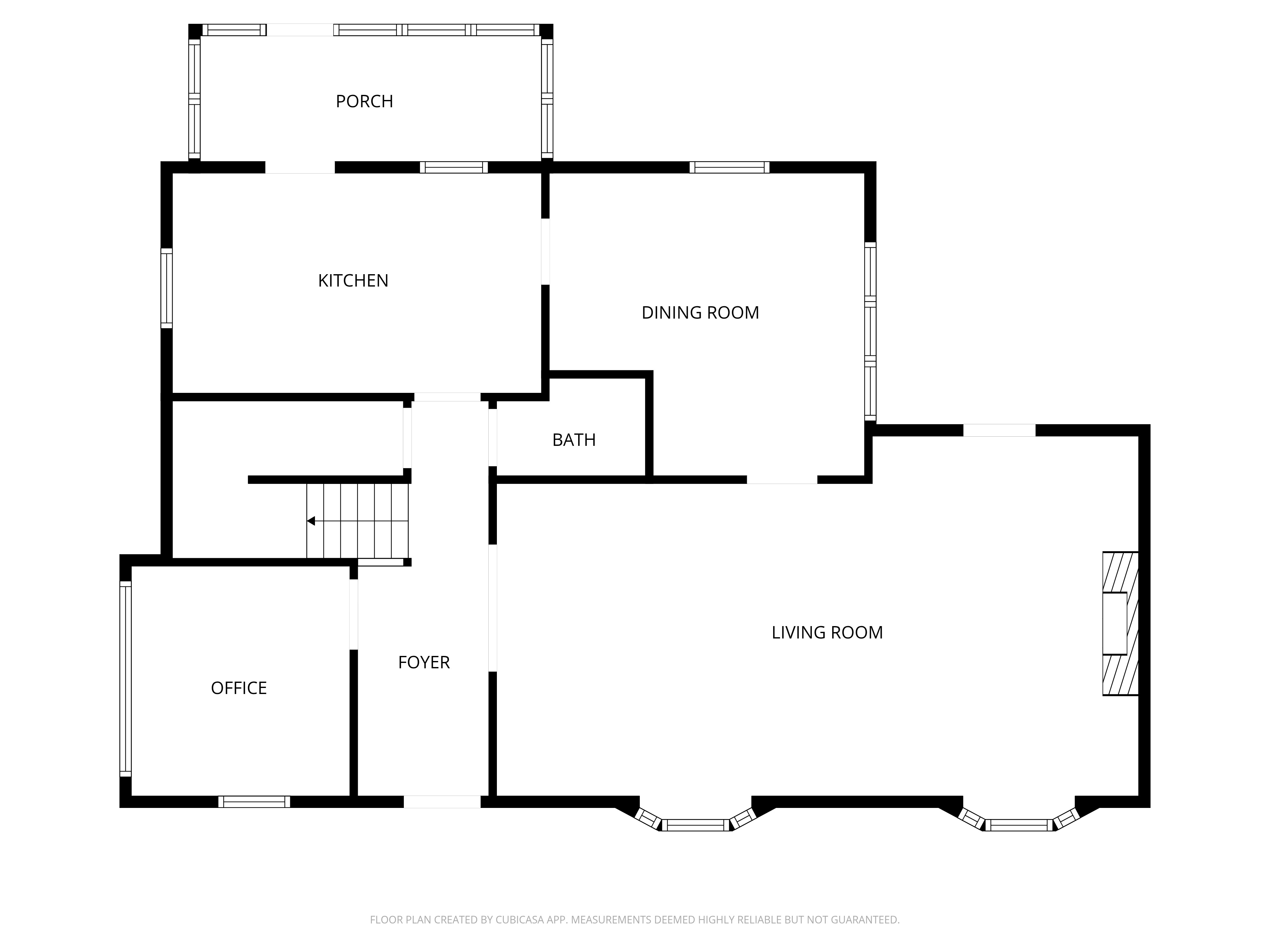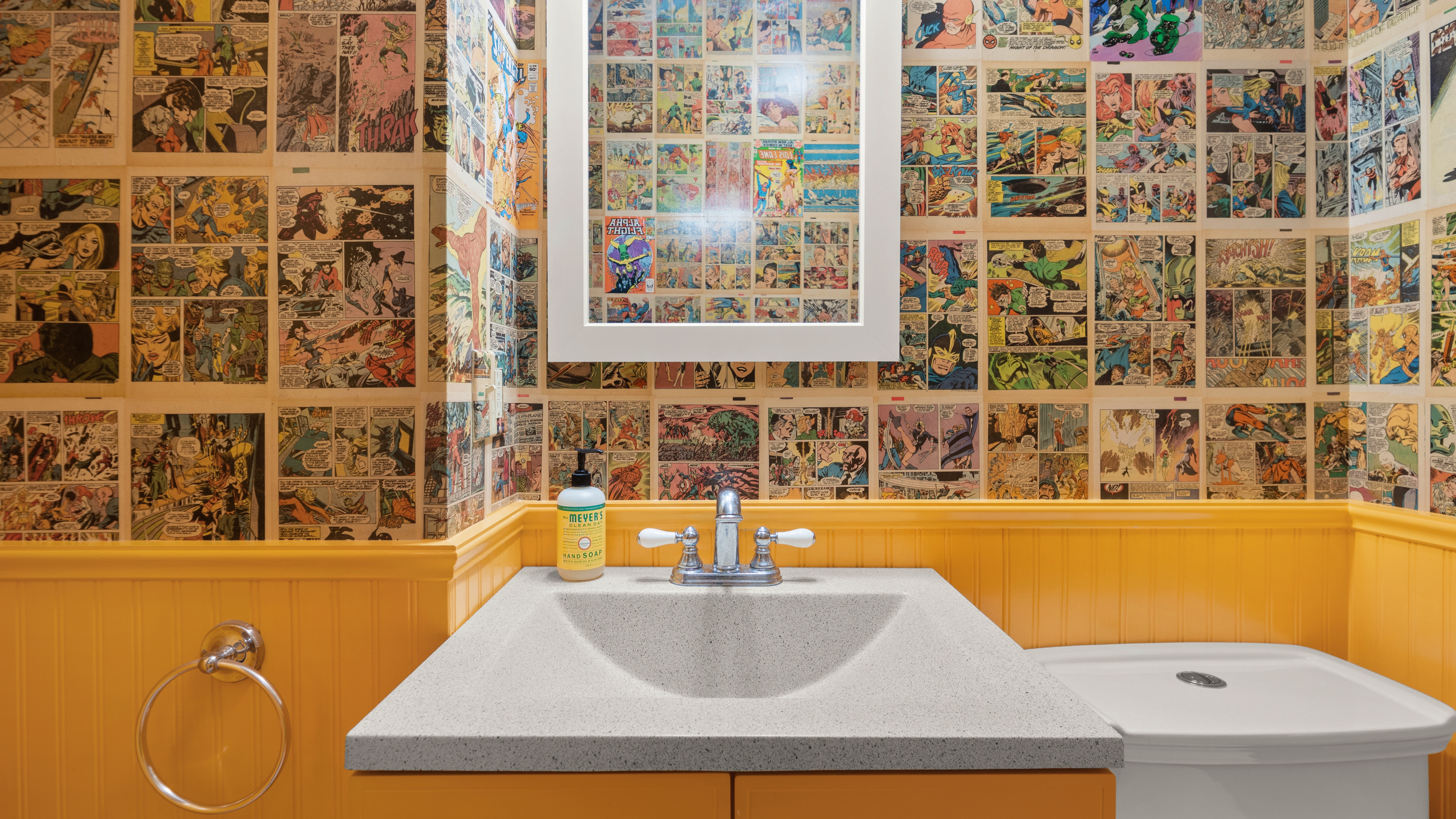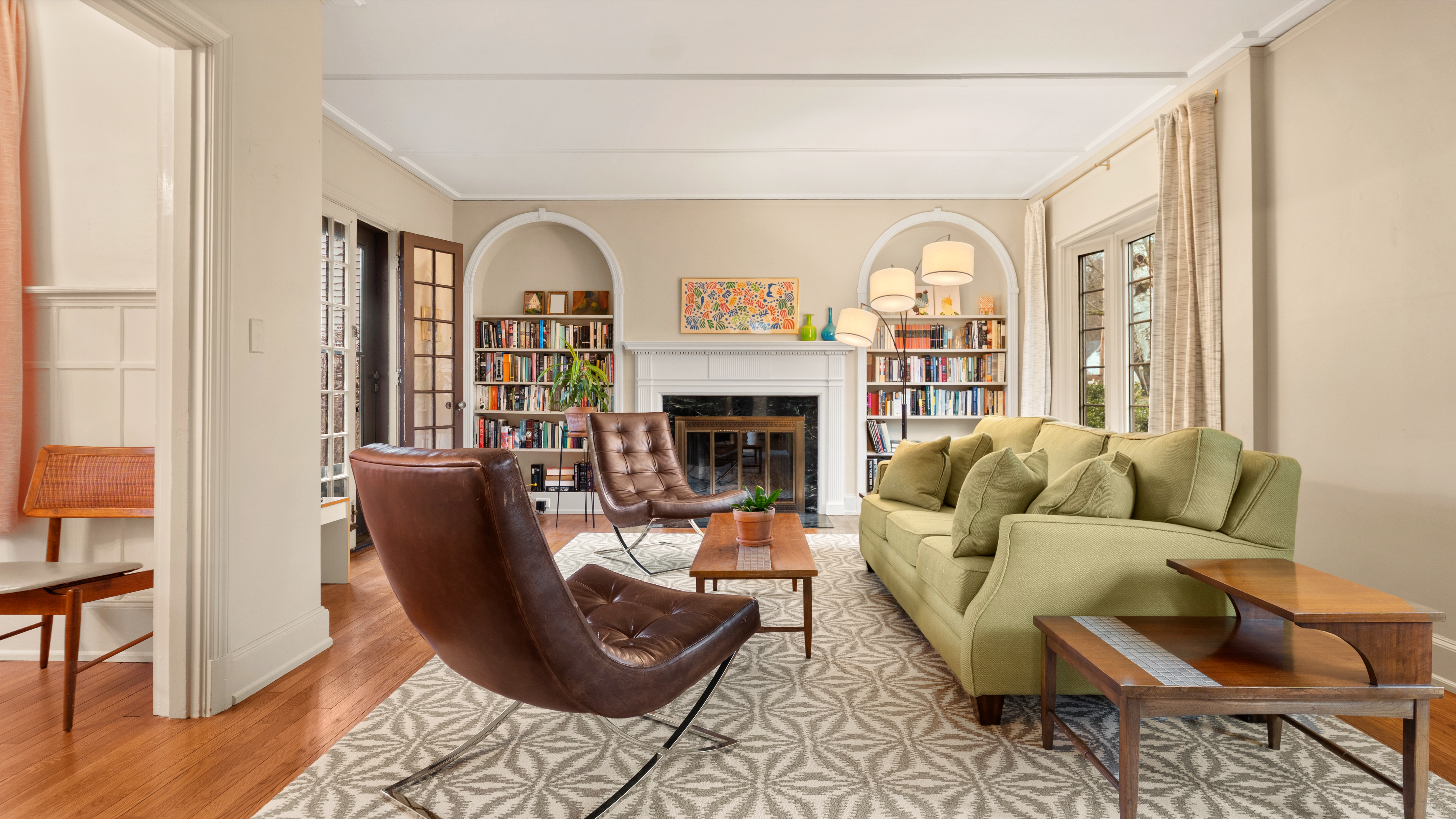 A versatile first-floor room, currently used as an office, offers flexibility for a fourth bedroom. A well-appointed half bath adds a touch of personality with its distinctive, design-forward wallpaper.