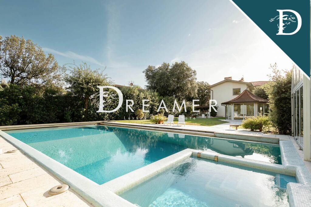 Exclusive villa with swimming pool for sale on the Forte dei Marmi seafront. The property, approximately 600 square meters, is spread over three levels and comprises 6 bedrooms and 6 bathrooms, surrounded by a lush 2,300 square meter garden. The property is characterized by its unique seafront location.