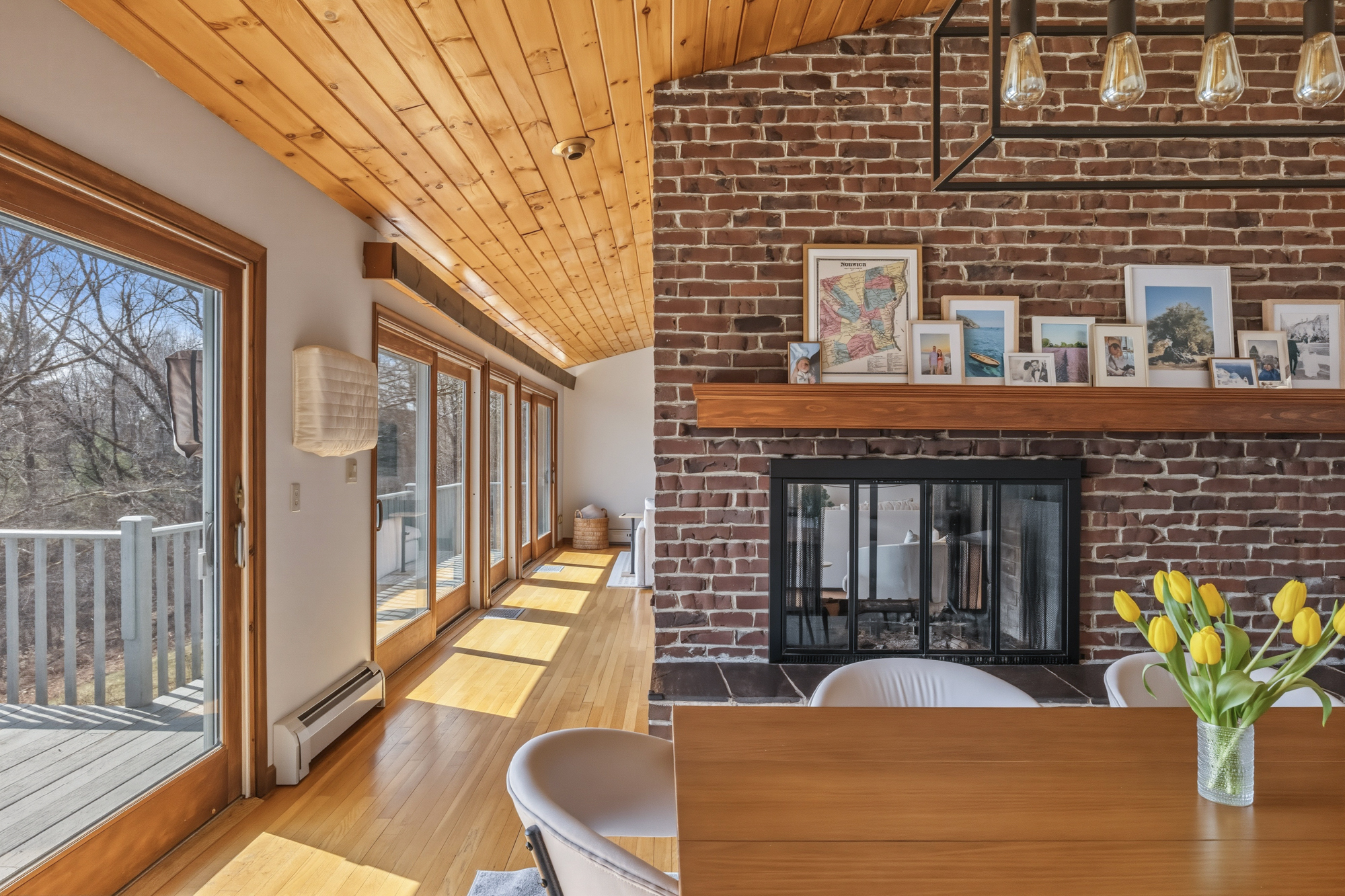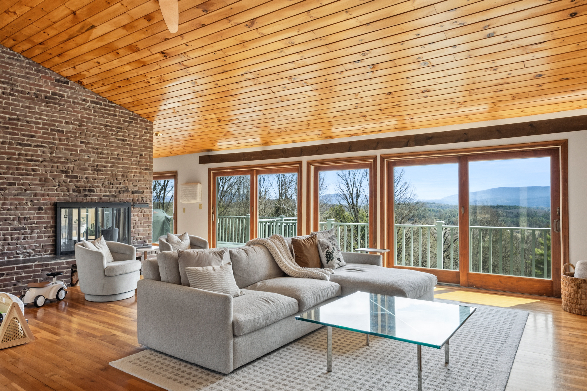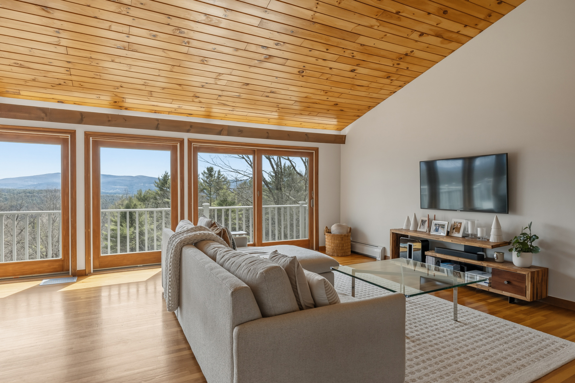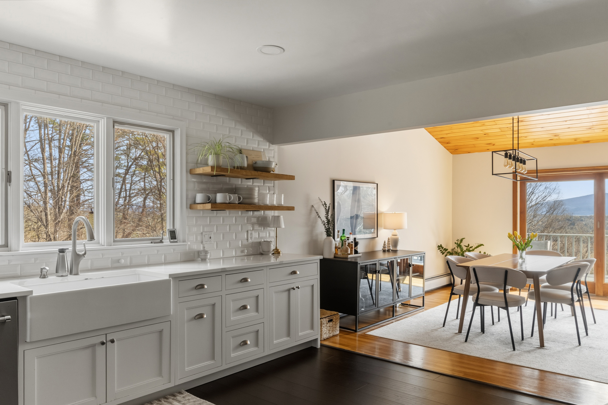 Perched on a quiet hillside road in Norwich, this mid-century gem offers something unique - extraordinary easterly views and a home that's been thoughtfully updated to enjoy them. The main level sets the tone. A newly redesigned mudroom and laundry room greets you at the door, with radiant floors and plenty of space to shed coats, boots, and gear before stepping into a stunning kitchen remodel that opens seamlessly to the dining room. The result is a space that feels bright, airy, and genuinely welcoming. A two-sided wood-burning fireplace anchors the heart of the home, dividing the dining and living rooms while drawing them together - and a wall of windows frames the views beyond while sunlight pours inside. A deck off the dining room is the perfect spot to catch the sunrise over a cup of coffee. Three bedrooms round out the main level, including a primary suite with an ensuite bath, plus a full hallway bath serving the other two rooms. Downstairs, the finished lower level is equally inviting. A generous recreation room with oversized windows stays bright and opens directly to the outdoors - step out to the lower deck and screened porch and the yard feels like a natural extension of the living space. A flexible bonus room with built-in bookshelves works beautifully as a guest room, home office, or exercise space, and a newly updated 3/4 bath adds real functionality to the level. Two storage rooms handle the storage overflow, and an additional partially finished room is currently in use as a home office. Outside, a detached two-car garage keeps cars clear of winter snow and offers room for all the gear that comes with Vermont living. The lot has been recently cleared to open up the views, and there's plenty of yard left for gardens and play. All of this on a peaceful dirt road with easy access to Route 132 - and Sweetland Farm stand just around the corner for a stop on the way home. Open House Saturday, April 11th 10am-12pm.