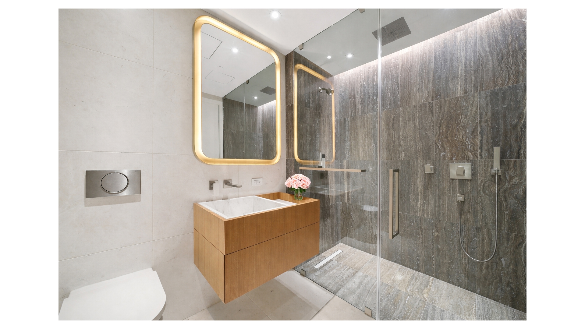 The bathroom boasts a frameless glass enclosed shower, custom floating elm vanity with Bianco drama marble countertop and sink with brushed-nickel fixtures, and a dramatic custom backlit satin bronze and nickel framed mirror create a sleek retreat finished with French vanilla marble and titanium Travertine walls.