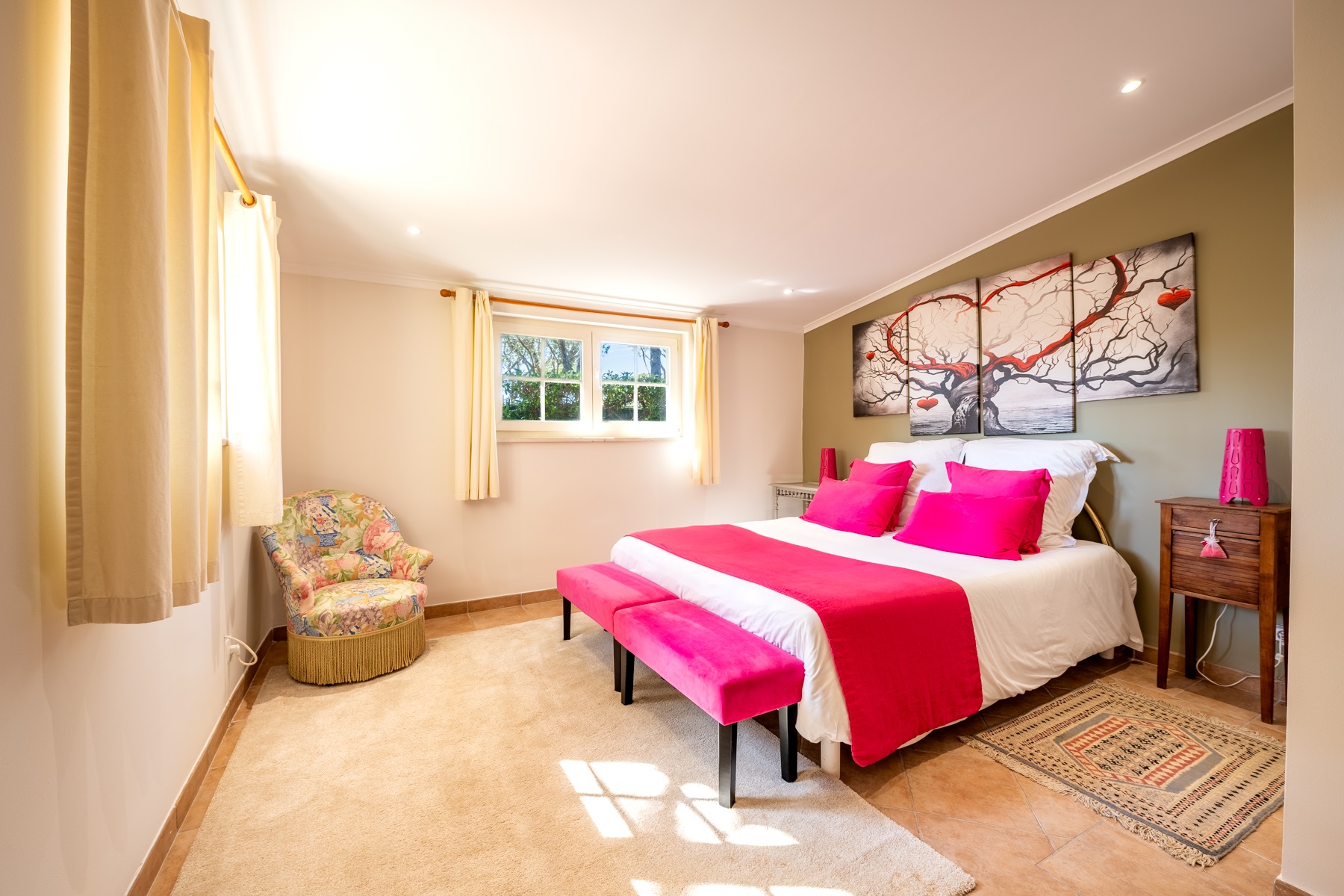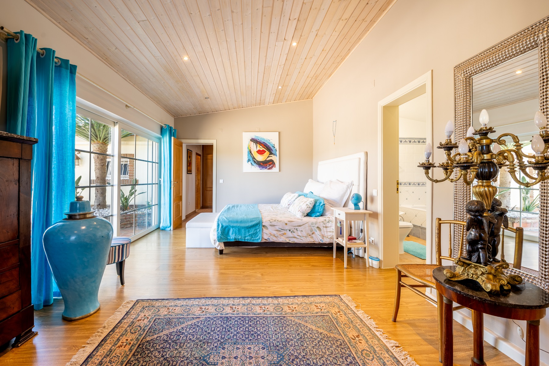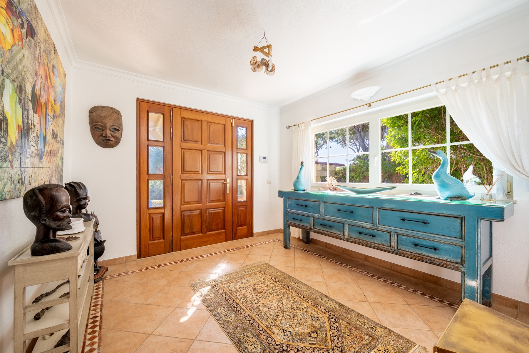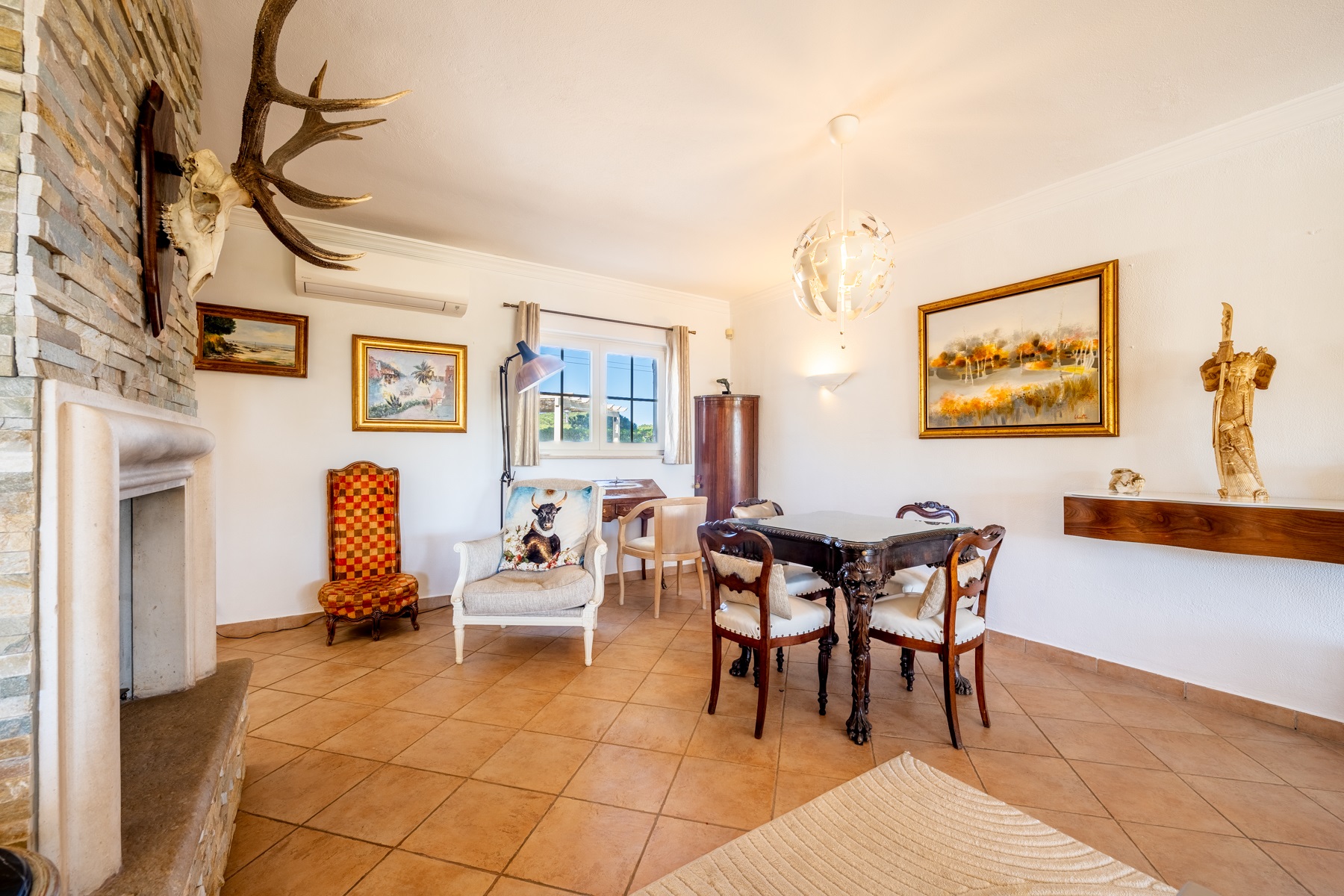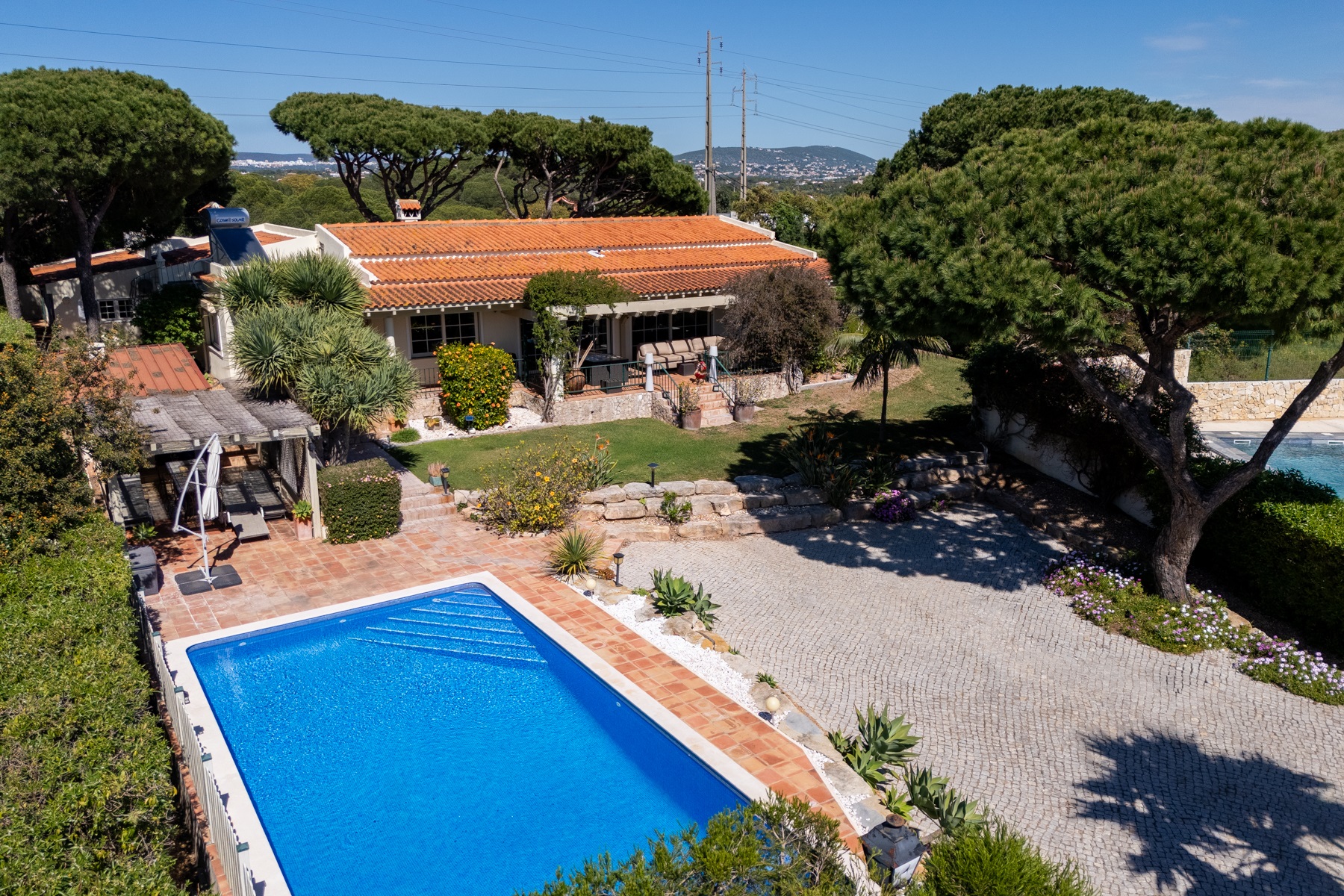 Between the countryside and the sea lies a property that redefines living in the Algarve. It is a true retreat where light, privacy and tranquility coexist in perfect harmony. Just minutes from Quarteira and its golden beaches, this villa stands out for its unique presence and seamless integration into the surrounding landscape. Nestled in a carefully designed garden and embraced by nature, it offers a rare sense of serenity without sacrificing proximity to essential amenities. Its excellent south-facing orientation ensures natural light throughout. Inside, the architecture blends contemporary lines with rustic touches full of character such as the striking schist stone wall and elegant double fireplace, creating a sophisticated yet welcoming atmosphere. The generous living areas flow effortlessly to the outdoors, fostering a continuous connection between interior and garden. The private quarters feature spacious suites and elegantly arranged bathrooms, offering comfort, functionality and total privacy for family and guests. Outside, the villa reveals its full charm with an inviting swimming pool, relaxing seating areas, a dining area with barbecue and a special corner with a jacuzzi perfect for moments of pure leisure. The Mediterranean garden, dotted with palm trees and bougainvillea, enhances the serene and elegant ambiance. Equipped with new solar panels and a water well, the villa combines comfort and efficiency, ensuring a sustainable and autonomous lifestyle. More than just a home, this property has its own identity where every detail is designed to provide well-being, privacy and an authentic connection to the Algarve lifestyle.
