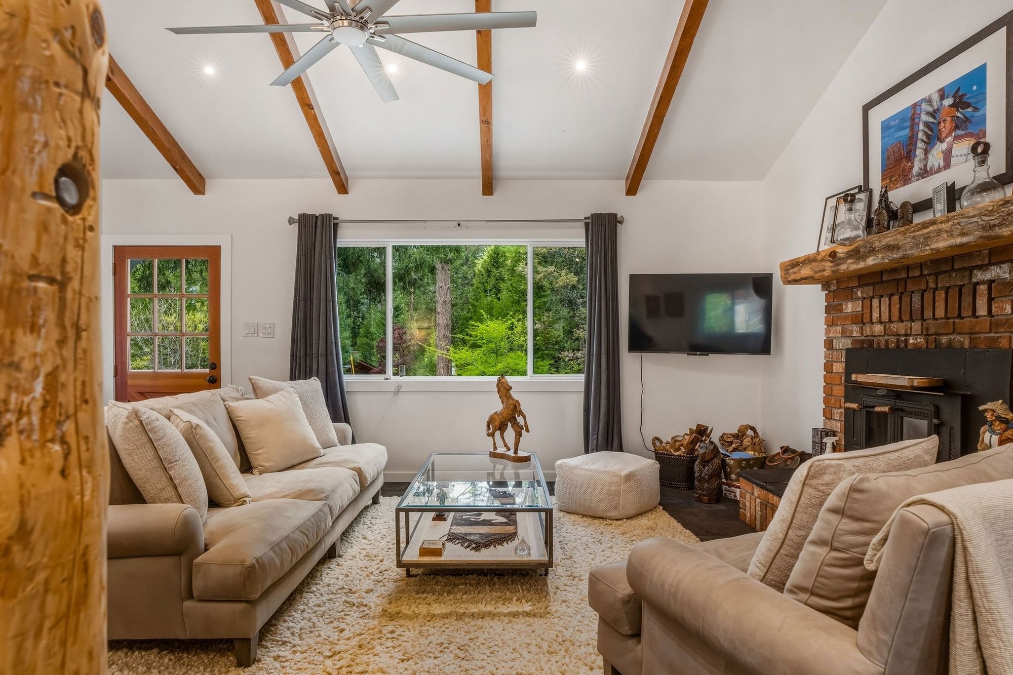 The primary residence is a stunning 3-bedroom, 1.75-bath cabin retreat defined by soaring vaulted and beamed ceilings, abundant natural light, and an open-concept design. The inviting living room centers around a classic brick fireplace, seamlessly connecting to the dining area and a beautifully upgraded chef's kitchen appointed with waterfall-edge countertops, custom cabinetry, and modern finishes. Each bedroom offers direct outdoor access, blending indoor comfort with the surrounding natural beauty.