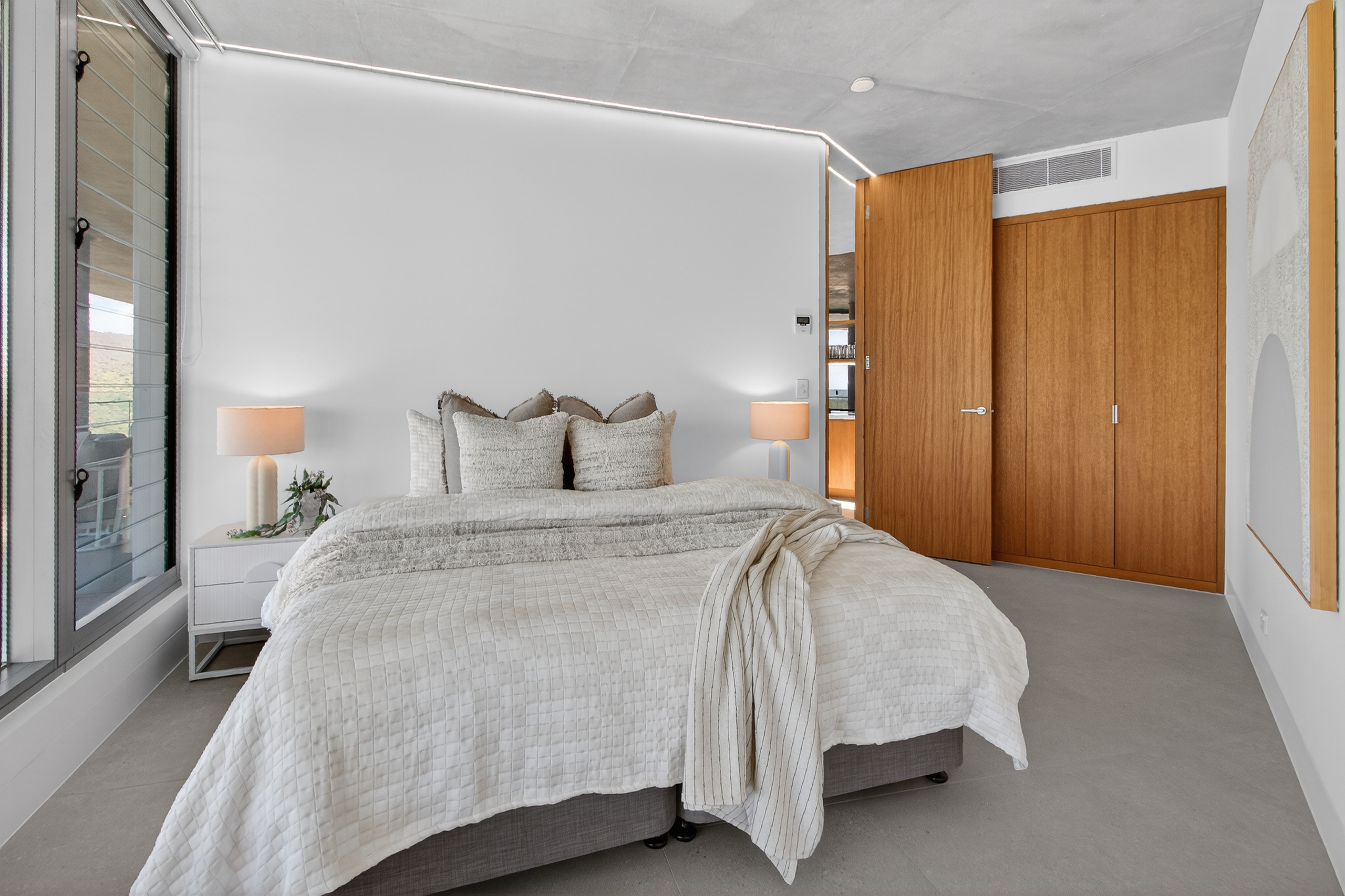 The master suite occupies this level as a private retreat, complete with a walk-in wardrobe and a beautifully appointed ensuite where the shower captures uninterrupted sea views.