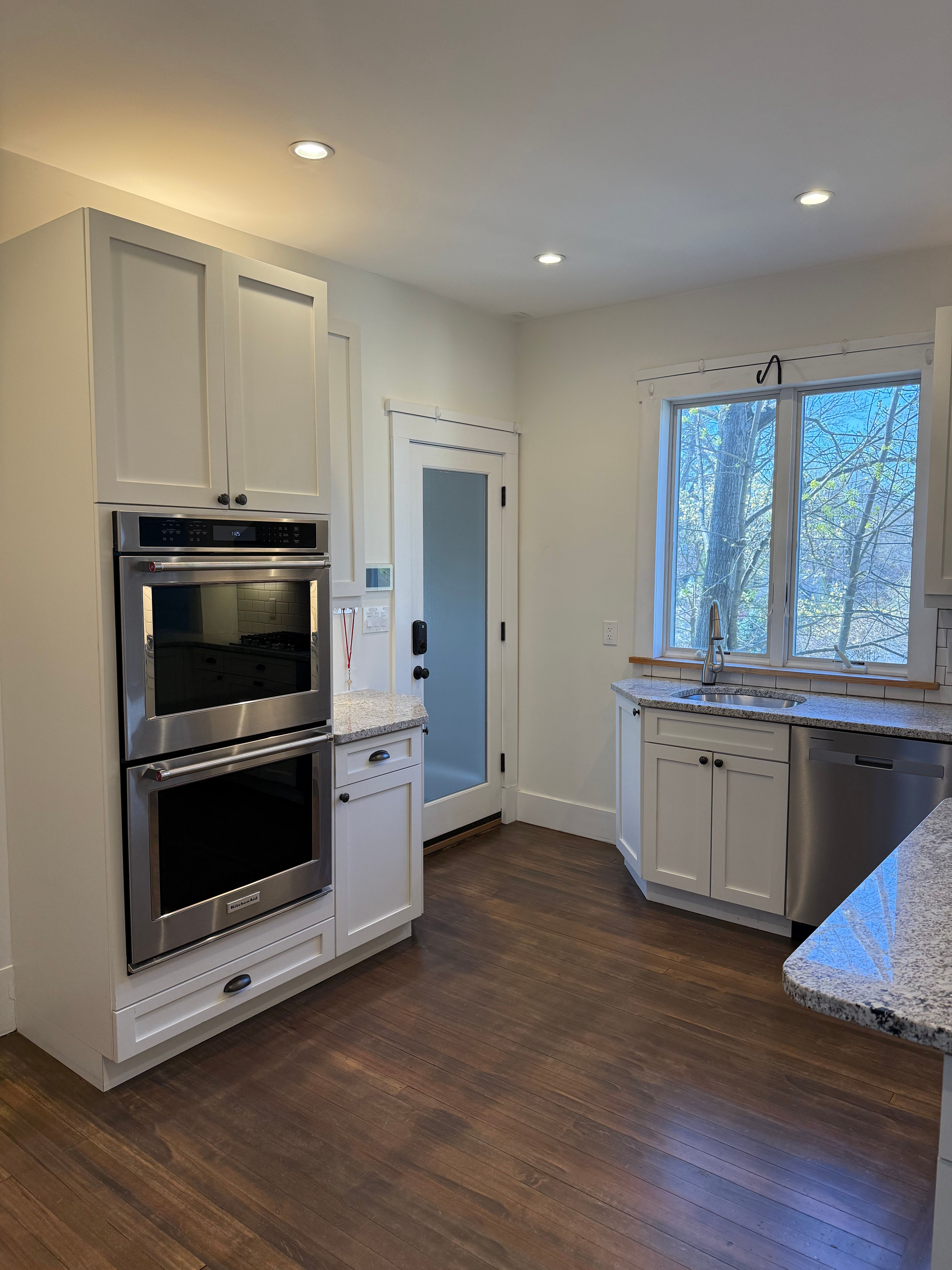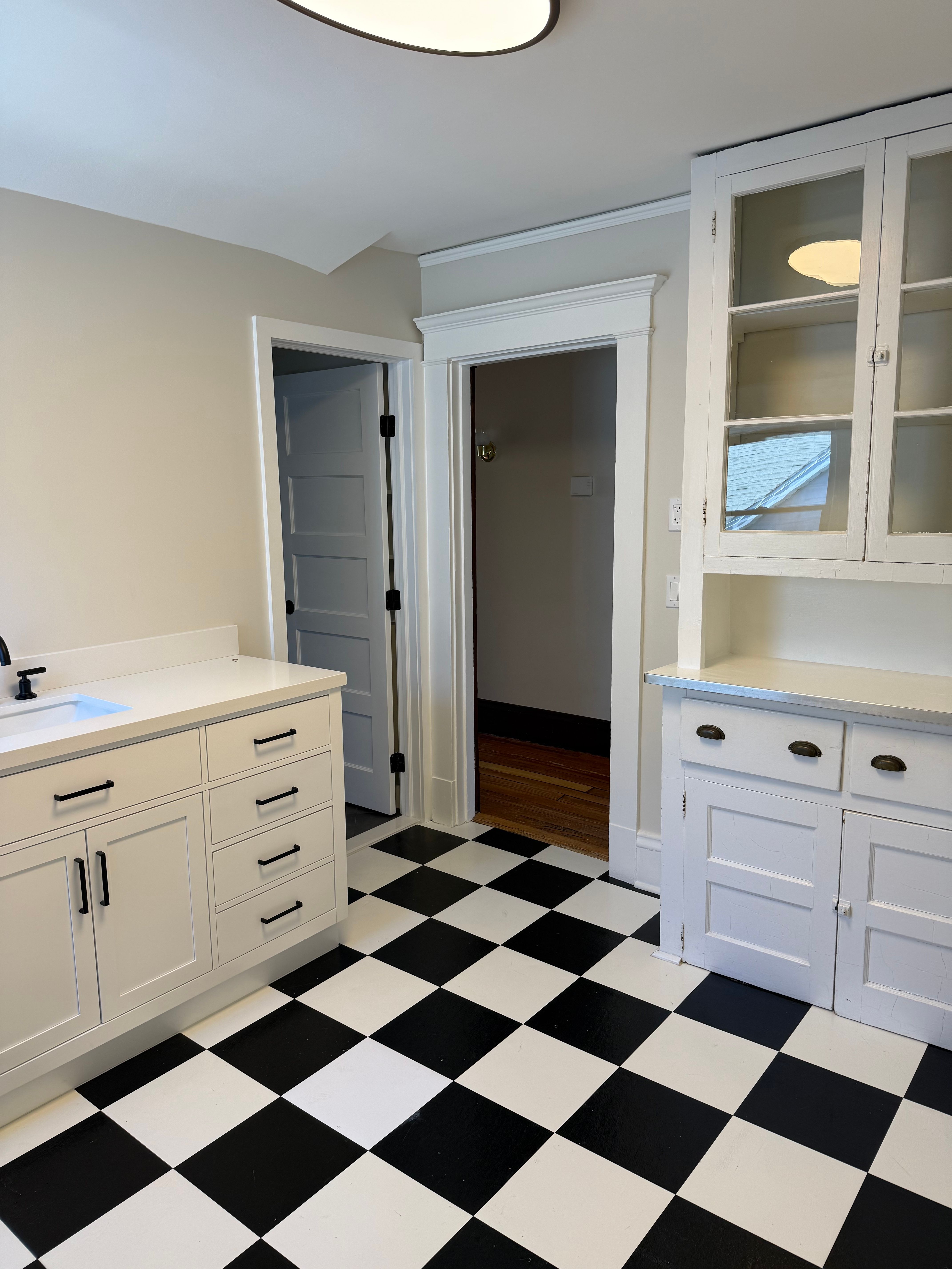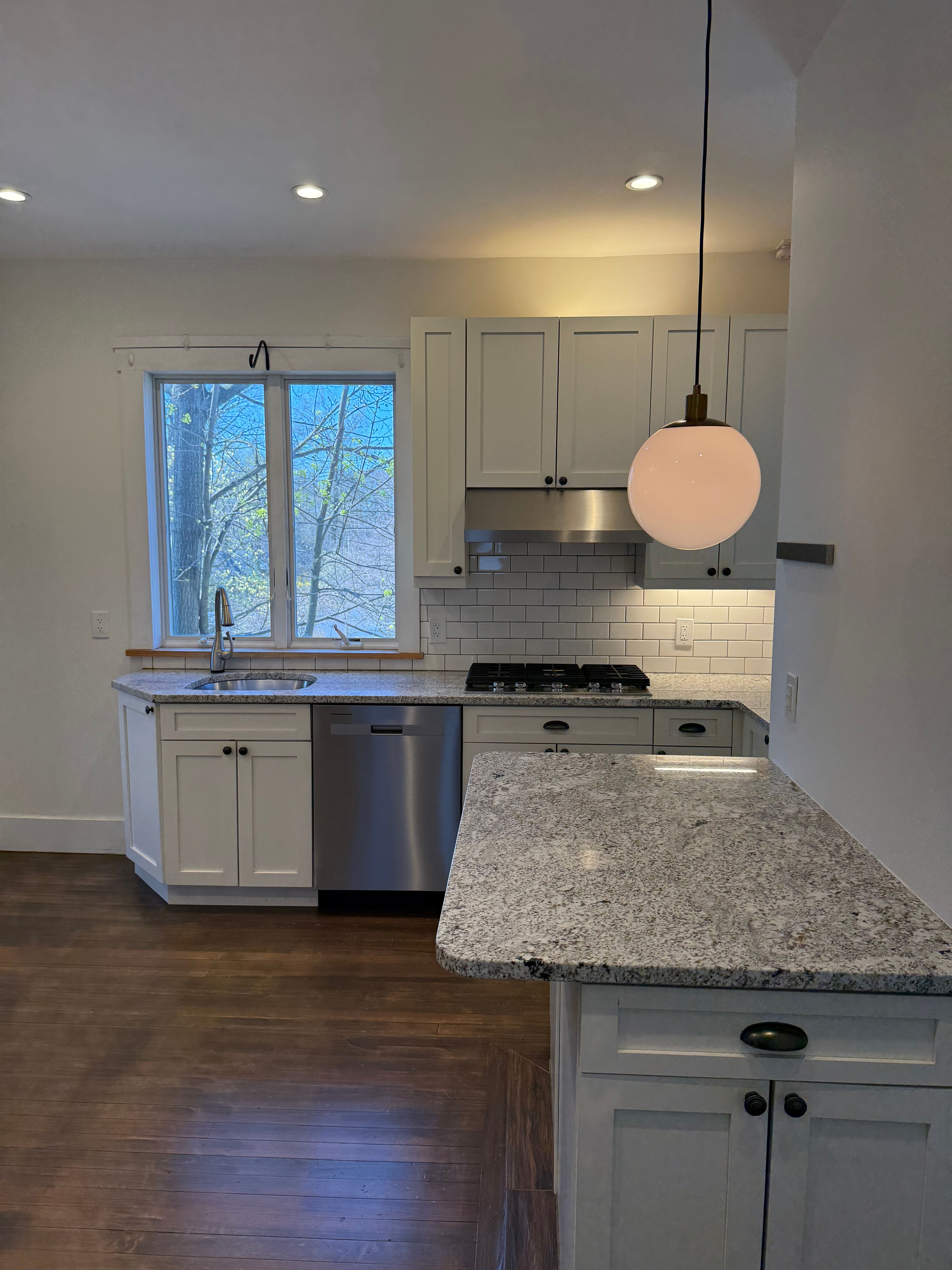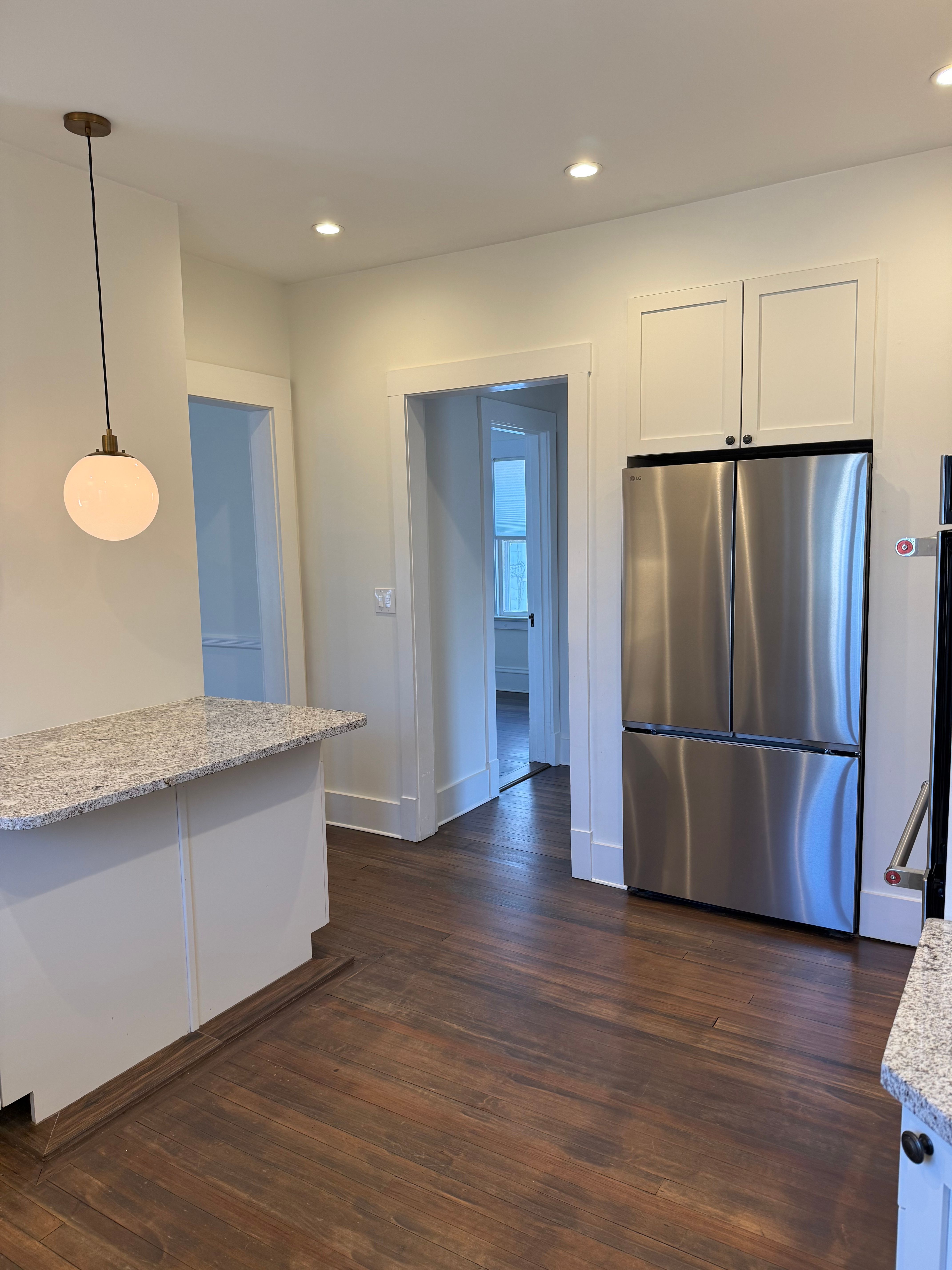 Super spacious, second and third floor, four to five-bedroom apartment one block from Walnut St train station. Comfortable front entry hall with roomy closet. The large Living Room is flooded with light. The Living Room opens to a huge Dining Room with a modern light fixture and recessed lighting. Stylish kitchen with pass-through to the dining room, stone countertops, double wall ovens, stainless steel appliances, dishwasher, large pantry, recessed lighting. Still on main level, two large and bright bedrooms (or bedroom and office) flank a hall bath with shower, gorgeous tile, chic lighting, and a heated floor. The third floor boasts two-three more bedrooms or two bedrooms plus a den, and another beautiful full bath with glass shower and heated floor. Hardwood floors throughout. Dedicated basement laundry and storage. Rear hallway closet. Airy covered front porch. Off-street parking for two cars. One block from Walnut St Midtown direct train, restaurants, shops, and farmers market. Pets allowed with some restrictions and LL approval.