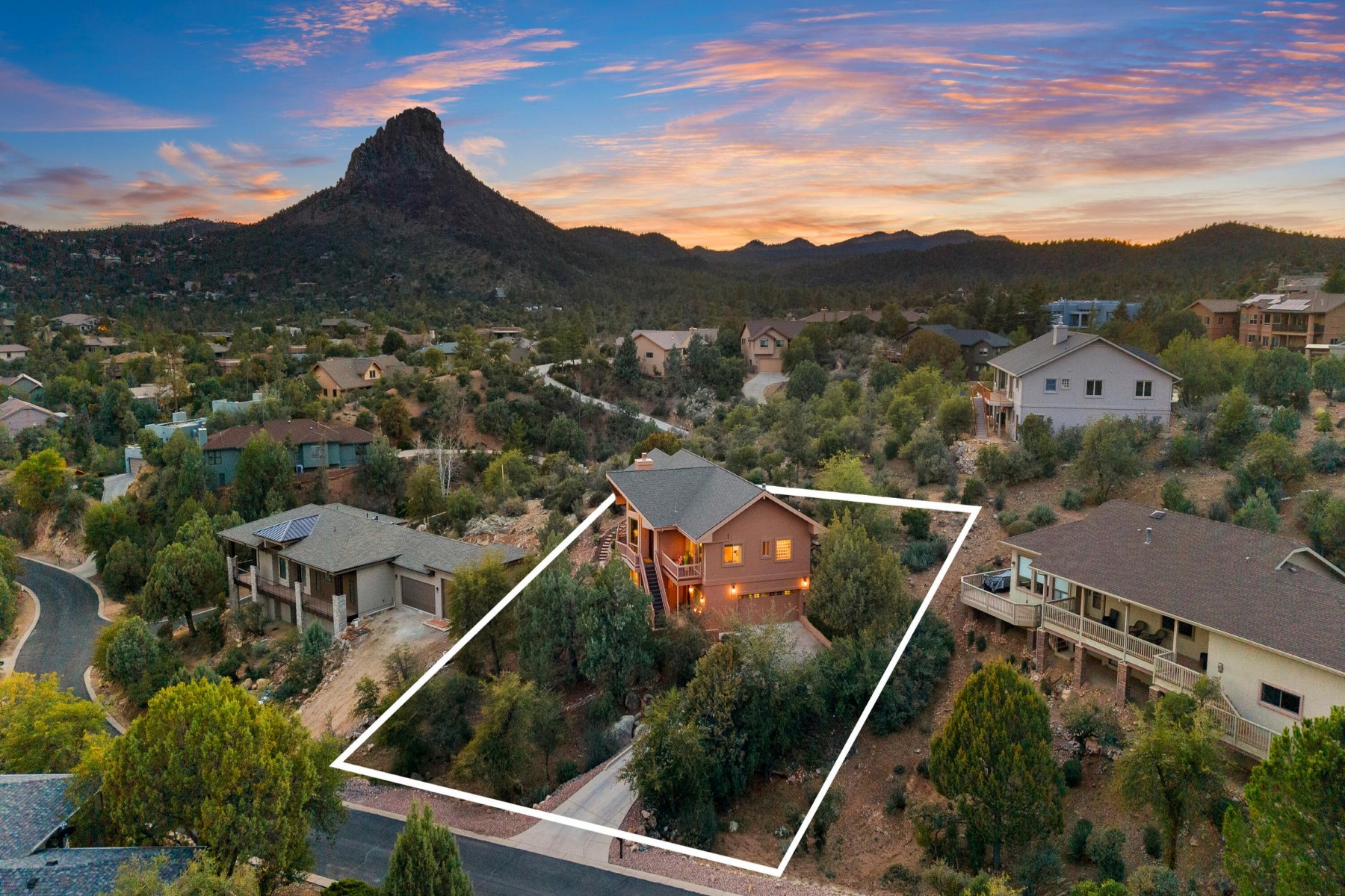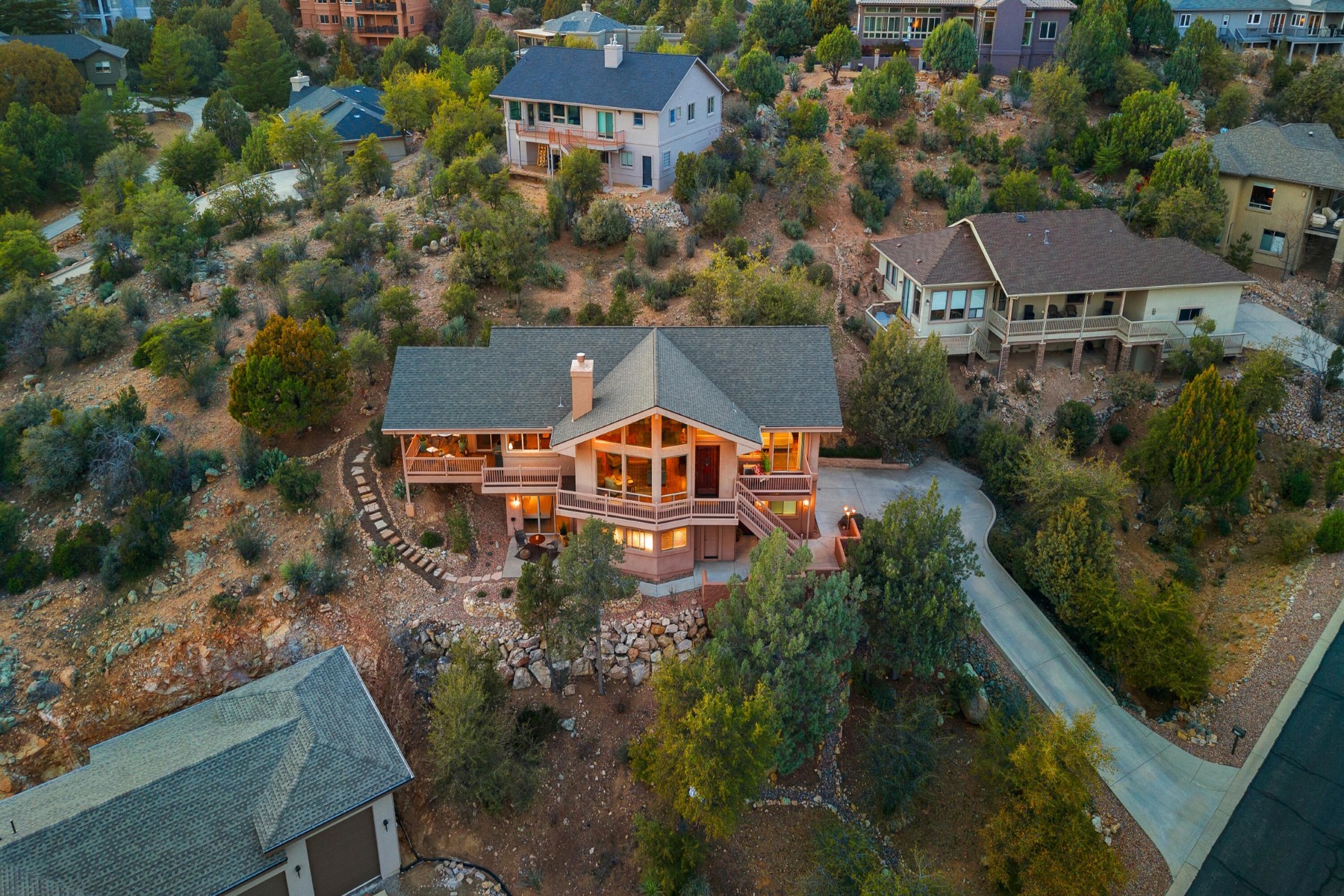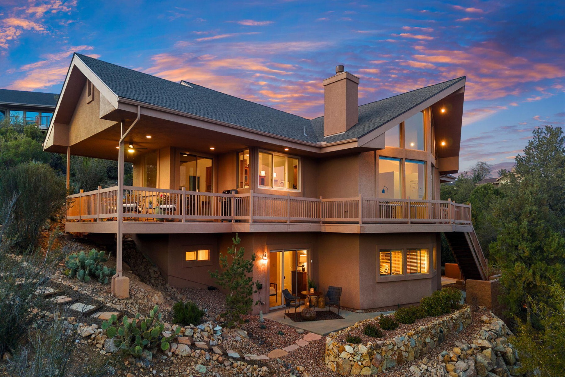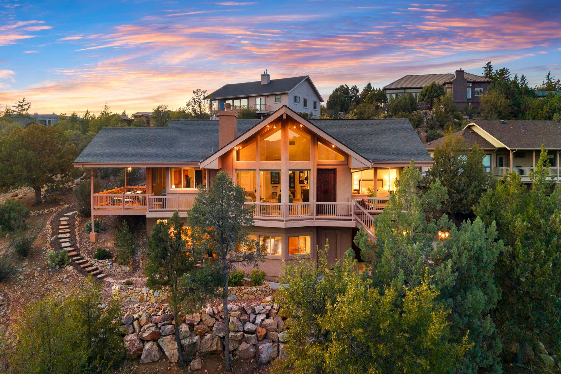 Set along a quiet hillside in Forest Trails, this custom residence has always been defined by its relationship to the land--long views, layered horizons, and a sense of elevation that feels bothexpansive and grounding. Thoughtfully positioned on just over .4 of an acre, the home was designed to frame its surroundings through generous windows, multiple decks, and a flowingmulti-level layout that invites the outdoors in. At the heart of the home, the great room remains a signature space, with a fireplace, and where soaring windows draw the eye toward distant city lightsbelow and forested slopes. The kitchen was intentionally designed as a gathering place rather than a pass-through, anchored by a substantial island, granite counters, two ovens, two sinks, and a walk-in pantry. Recent kitchen enhancements include Renewal by Andersen windows, updated pendant lighting above the island, and a Bosch dishwasher, all opening naturally to a dining area and view-facing decks that have long hosted quiet mornings and unhurried evenings. A peaceful breakfast room with another fireplace off the kitchen has a lovely, unmistakable profile of Thumb Butte. A rare dumbwaiter connects levels with subtle practicality, a detail that reflects the home's original custom intent. The primary suite is tucked away for privacy and enjoys its own sense of retreat, enhanced by personalized climate control,walk-in closet, en suite bath, and covered porch. The lower level offers flexibility and separation with a private guest suite featuring outdoor access, a spacious family or recreation room/hobby/studio, with wet-bar and storage spaces that adapt easily to changing needs. Luxury vinyl plank flooring adds durability and continuity on this level, complemented by updated lighting, ceiling fans, and refreshed interior paint throughout the main and lower living areas. Behind the scenes, the home has been carefully updated to support comfort and peace of mind. Improvements include a full tear-off roof, a modern HVAC system in 2024, with integrated humidification, a dedicated mini-split serving the primary suite, an upgraded electrical system, a newer (2024) water heater, and exterior lighting around the 21/2 car garage for improved function and arrival experience. The result is a home that feels both established and current--one that has evolved thoughtfully while preserving the views, craftsmanship, and architectural character that made it special from the beginning. Here privacy, comfort, and setting come together in a way that reflects the enduring appeal of life in the forested hills of Prescott, just minutes from downtown amenities. This is one of the better locations to access Prescott forested trails, hundreds of miles of hiking, biking, and equestrian trails, await.