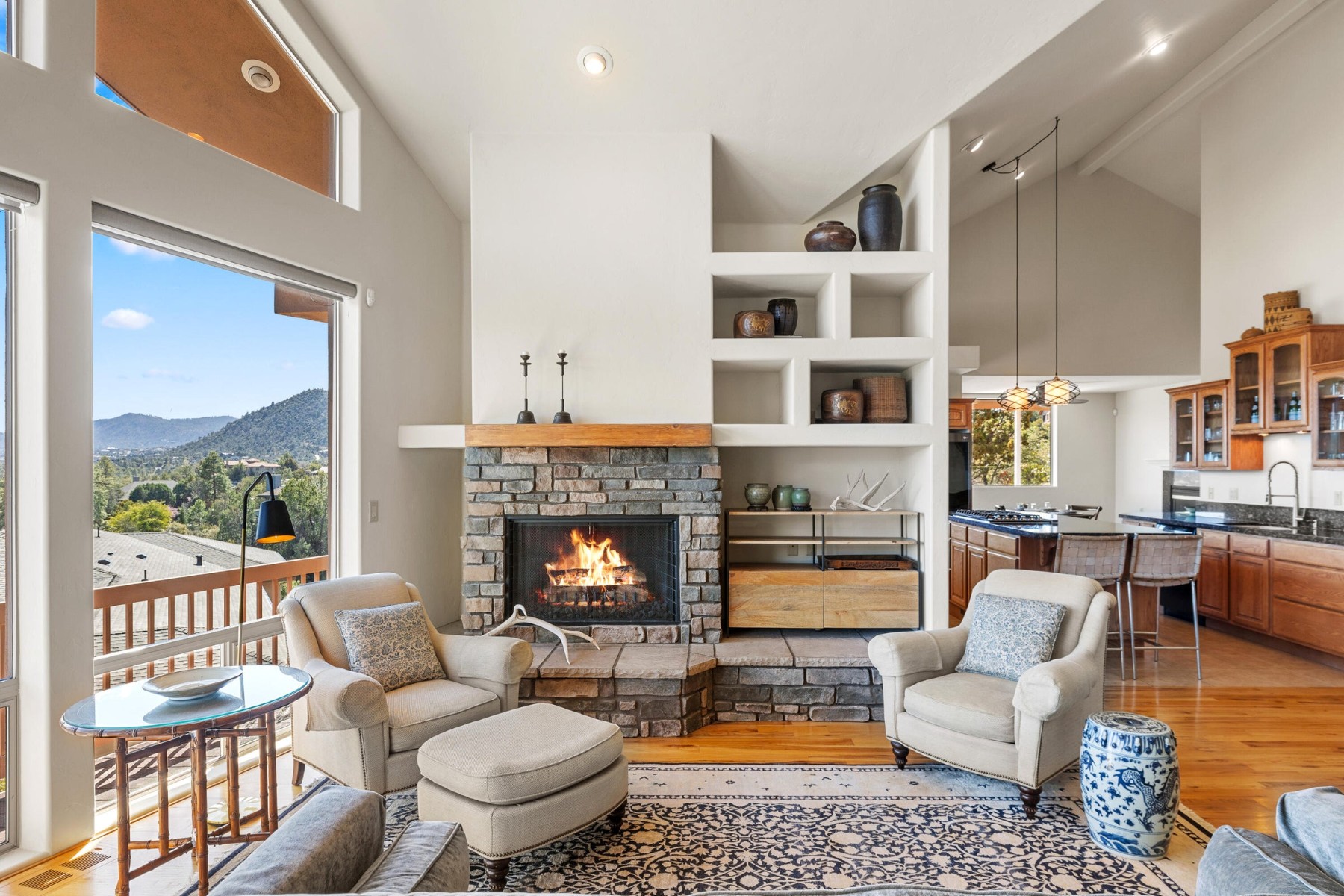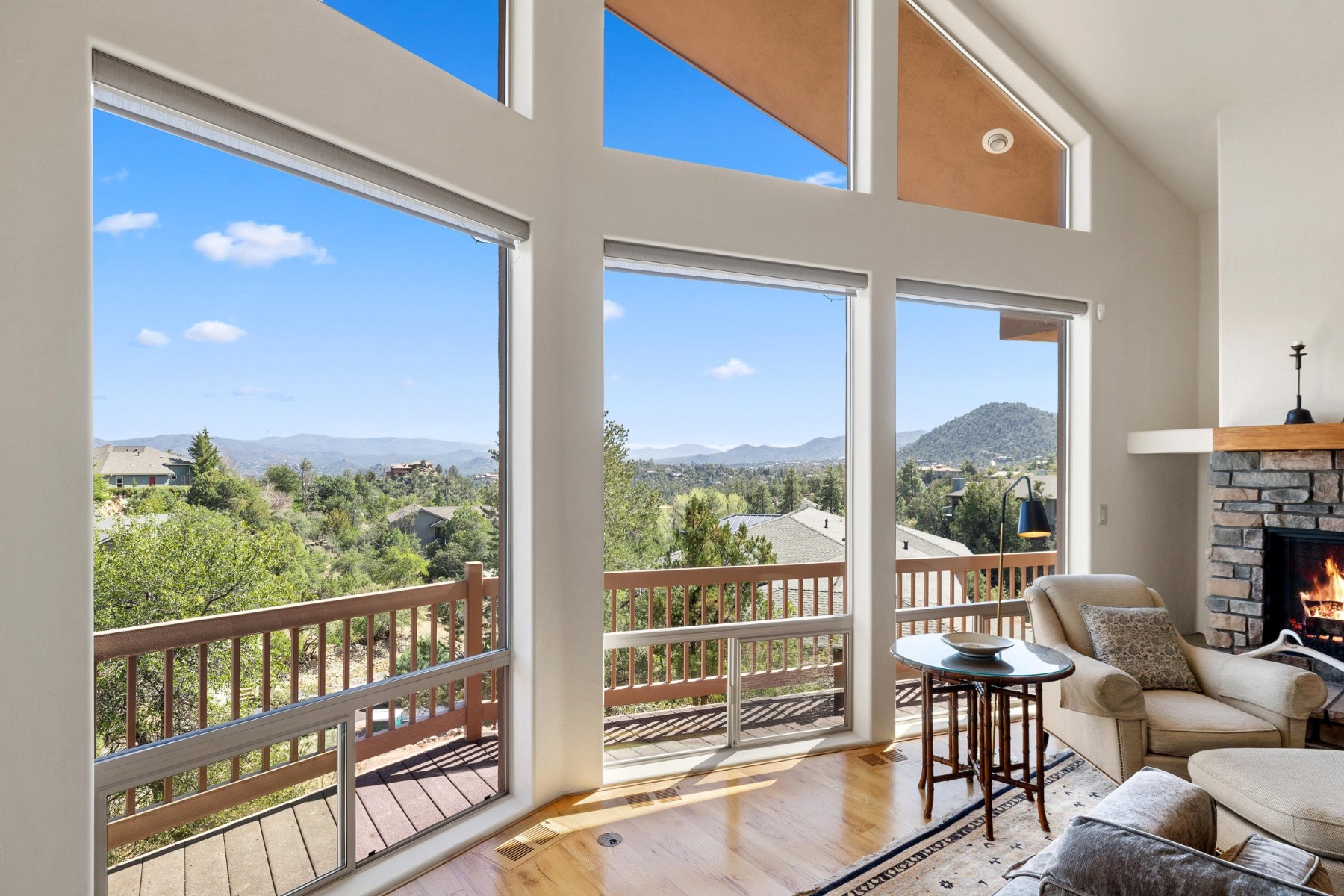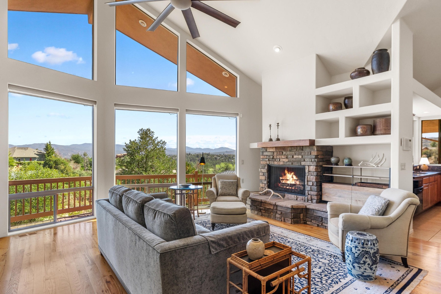 Set along a quiet hillside in Forest Trails, this custom residence has always been defined by its relationship to the land--long views, layered horizons, and a sense of elevation that feels bothexpansive and grounding. Thoughtfully positioned on just over .4 of an acre, the home was designed to frame its surroundings through generous windows, multiple decks, and a flowingmulti-level layout that invites the outdoors in. At the heart of the home, the great room remains a signature space, with a fireplace, and where soaring windows draw the eye toward distant city lightsbelow and forested slopes. The kitchen was intentionally designed as a gathering place rather than a pass-through, anchored by a substantial island, granite counters, two ovens, two sinks, and a walk-in pantry. Recent kitchen enhancements include Renewal by Andersen windows, updated pendant lighting above the island, and a Bosch dishwasher, all opening naturally to a dining area and view-facing decks that have long hosted quiet mornings and unhurried evenings. A peaceful breakfast room with another fireplace off the kitchen has a lovely, unmistakable profile of Thumb Butte. A rare dumbwaiter connects levels with subtle practicality, a detail that reflects the home's original custom intent. The primary suite is tucked away for privacy and enjoys its own sense of retreat, enhanced by personalized climate control,walk-in closet, en suite bath, and covered porch. The lower level offers flexibility and separation with a private guest suite featuring outdoor access, a spacious family or recreation room/hobby/studio, with wet-bar and storage spaces that adapt easily to changing needs. Luxury vinyl plank flooring adds durability and continuity on this level, complemented by updated lighting, ceiling fans, and refreshed interior paint throughout the main and lower living areas. Behind the scenes, the home has been carefully updated to support comfort and peace of mind. Improvements include a full tear-off roof, a modern HVAC system in 2024, with integrated humidification, a dedicated mini-split serving the primary suite, an upgraded electrical system, a newer (2024) water heater, and exterior lighting around the 21/2 car garage for improved function and arrival experience. The result is a home that feels both established and current--one that has evolved thoughtfully while preserving the views, craftsmanship, and architectural character that made it special from the beginning. Here privacy, comfort, and setting come together in a way that reflects the enduring appeal of life in the forested hills of Prescott, just minutes from downtown amenities. This is one of the better locations to access Prescott forested trails, hundreds of miles of hiking, biking, and equestrian trails, await.