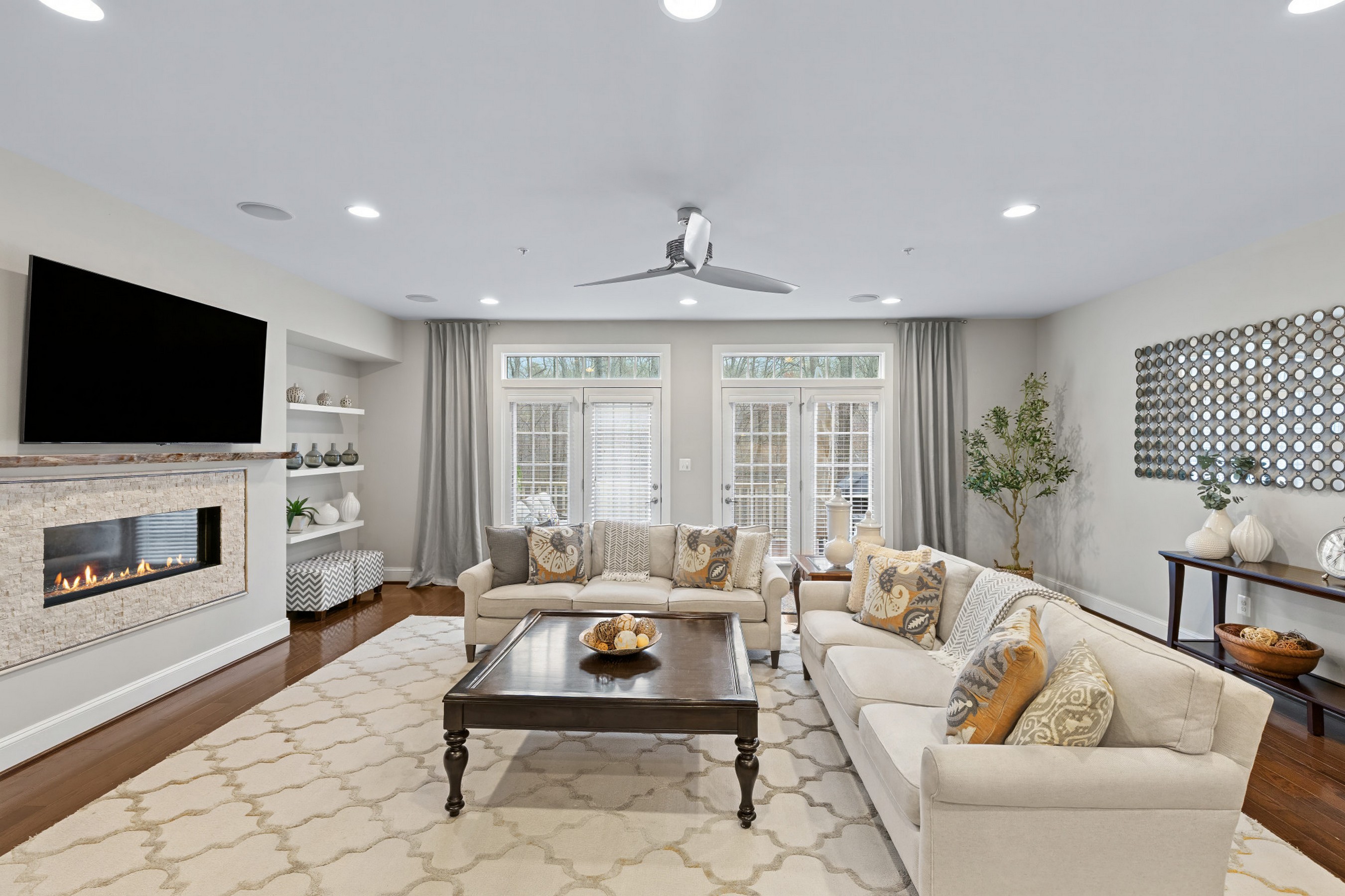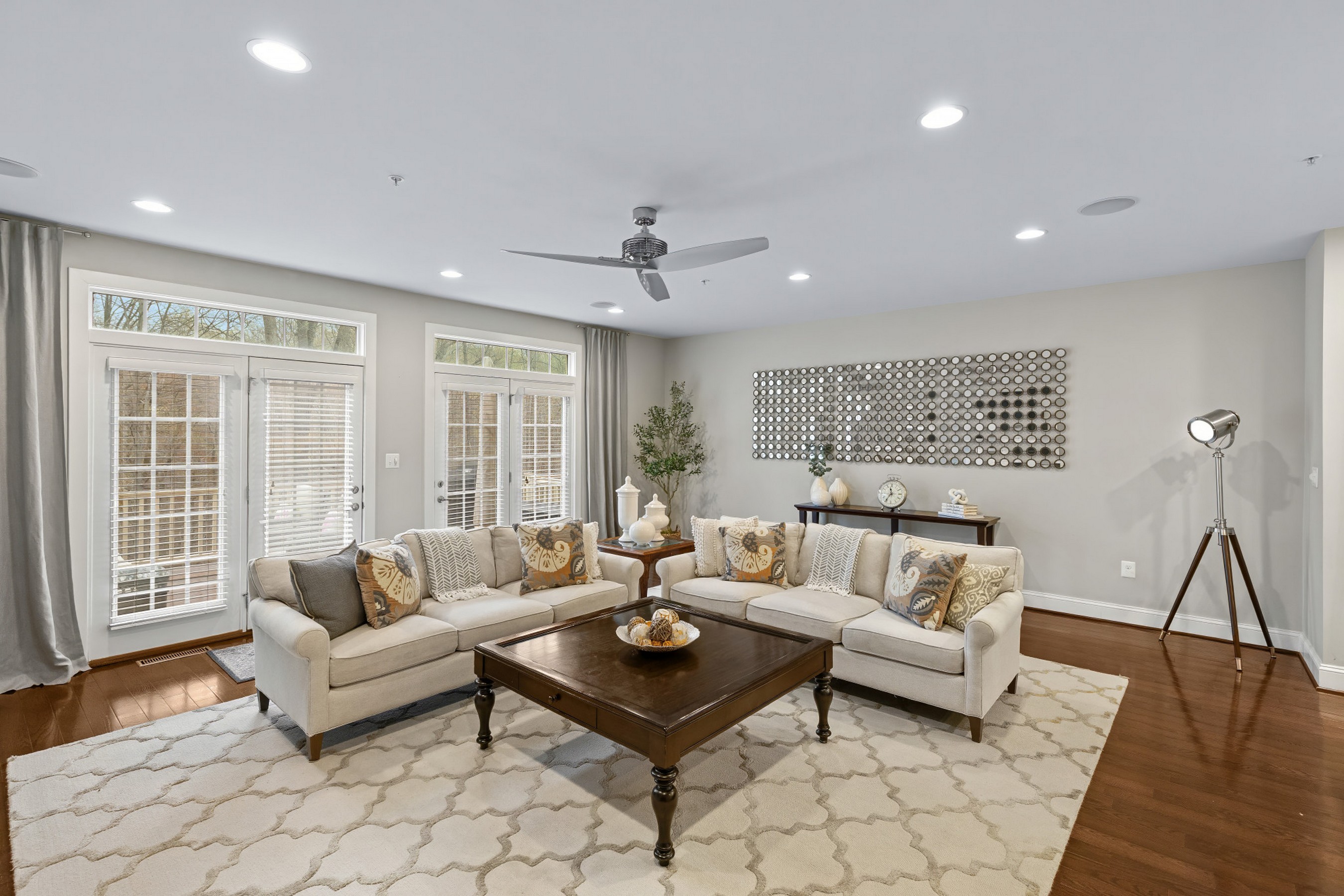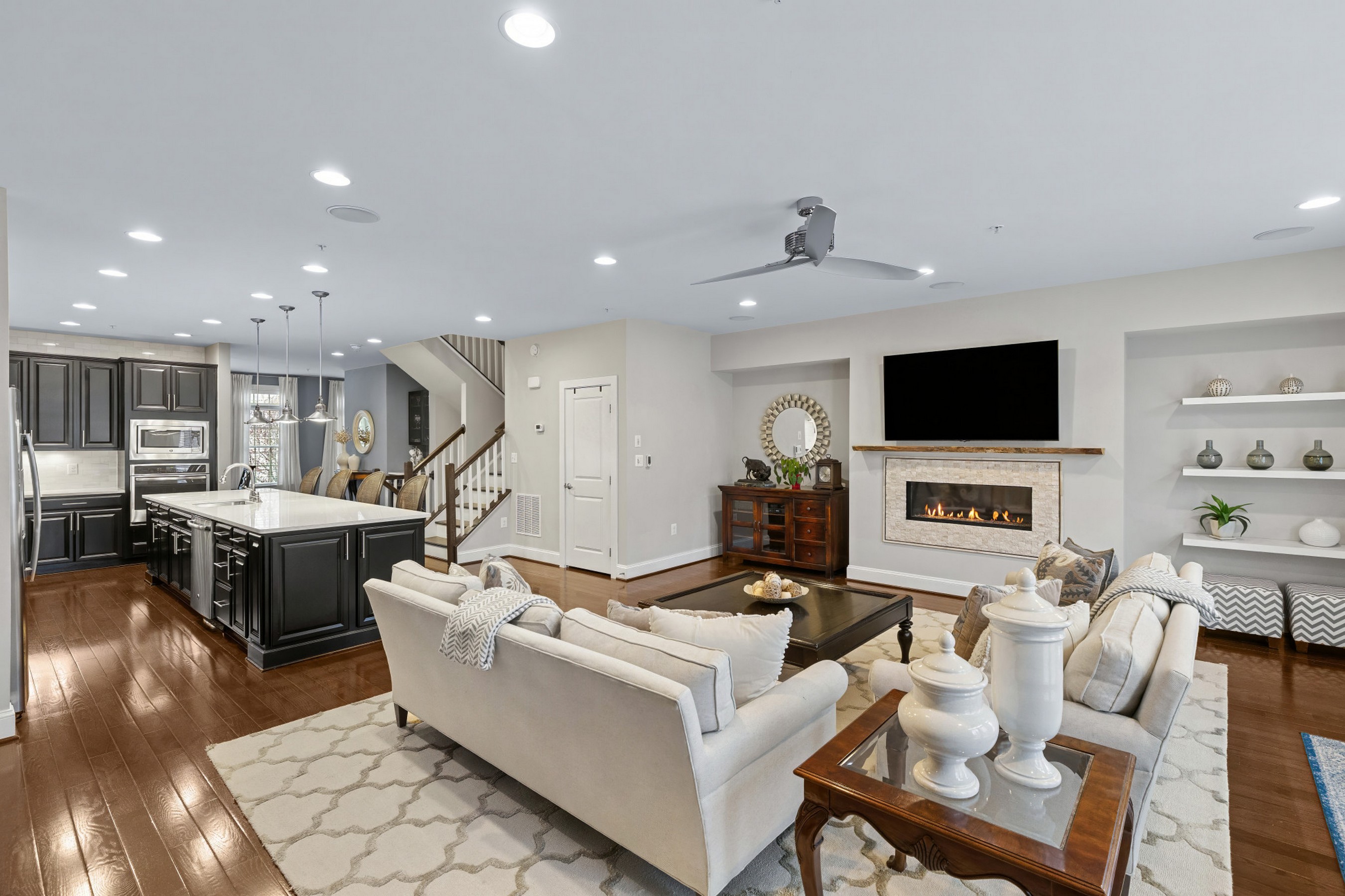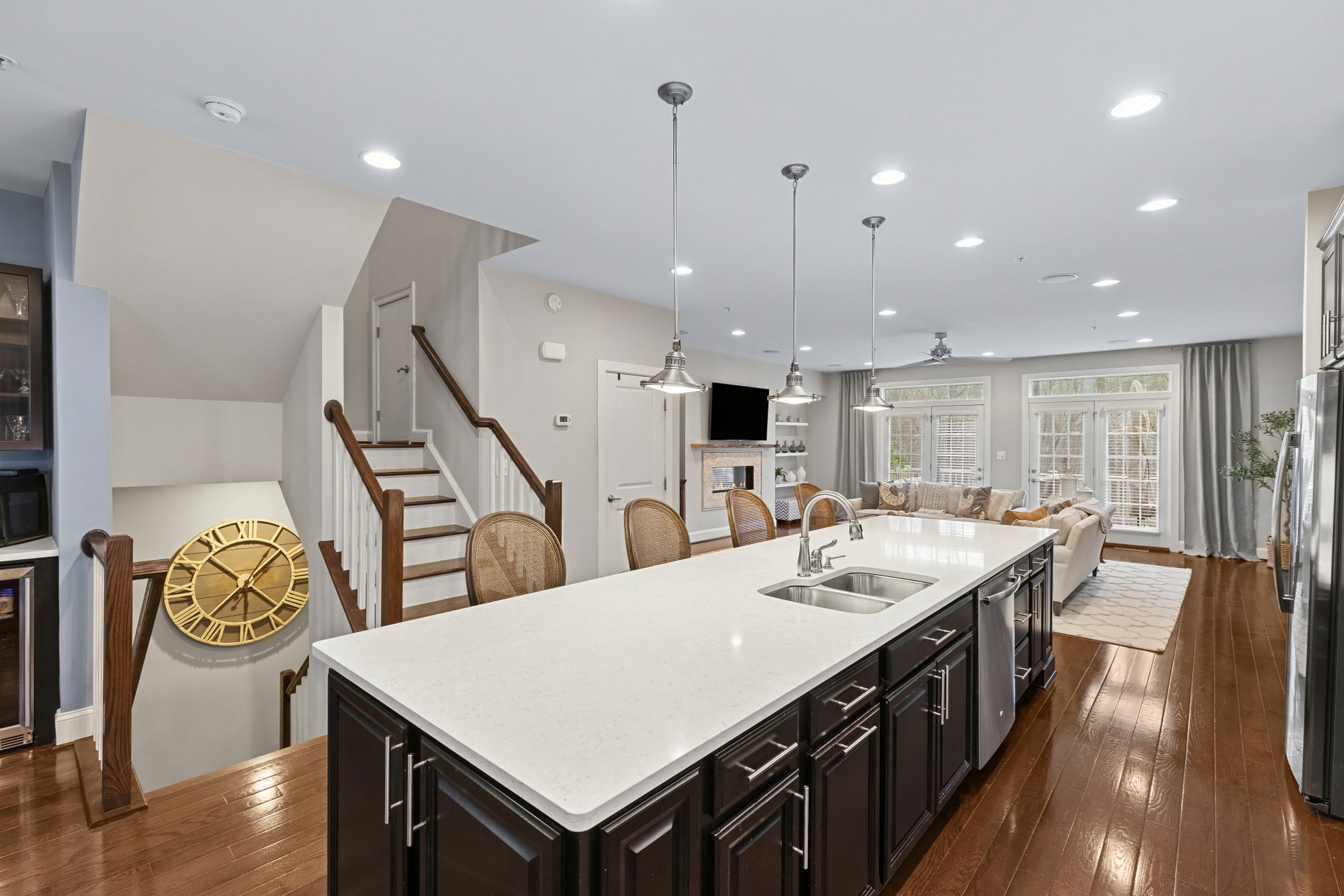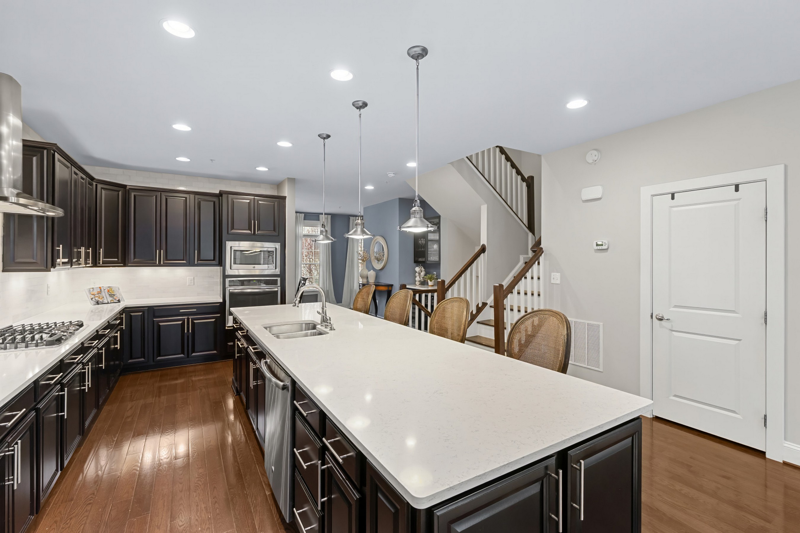 Set in one of Hawthorne's Grant's most desirable and private locations, this luxury colonial townhome backs to peaceful wooded views and protected green space. Meticulously maintained and thoughtfully upgraded, this exceptional 3-bedroom, 2.5-bath residence offers beautifully finished living spaces across three levels. The open-concept main level is designed for both everyday living and elevated entertaining, featuring rich hardwood floors, recessed and designer lighting, and a stunning chef's kitchen anchored by an impressive 13-foot quartz island. Highlights include a 5-burner gas cooktop with vent hood, wall oven and built-in microwave, double sink, and a striking tile backsplash that extends to the ceiling, a rare and sophisticated detail. The adjoining dining area is complemented by a well-appointed butler's pantry with beverage center, wine cooler, and additional cabinetry, along with a walk-in pantry and a discreet powder room. The spacious family room offers built-in surround sound, ceiling speakers, and an upgraded gas fireplace, with two sets of French doors that seamlessly connect indoor and outdoor living. Step onto the maintenance-free composite deck overlooking expansive manicured green space and protected wooded surroundings that can never be developed, offering a rare sense of privacy, perfect for entertaining or relaxing. Upstairs, the serene primary suite features two generous walk-in closets, including a custom-designed closet, and a spa-inspired en-suite bath with dual vanities, a glass-enclosed tiled shower, and a private water closet. Two additional bedrooms, a full hall bath with dual vanity and shower/tub combination, and a convenient upper-level laundry room complete this level. The light-filled lower level offers exceptional flexibility with a spacious recreation room ideal for a second family room, guest space, office, or gym. High ceilings, recessed lighting, and side windows enhance the space, while a patio door leads to a covered stone patio. This inviting outdoor space provides a true extension of the home, ideal for relaxing, dining, or entertaining while enjoying the peaceful, private natural surroundings. A large storage room is already roughed in for a future bathroom, and three oversized closets provide abundant storage. The two-car garage includes drop-down storage systems. Enjoy a peaceful, private setting just minutes from shopping, dining, major commuter routes, downtown Annapolis, and BWI Airport, and within close proximity to Blue Ribbon Arnold Elementary. A rare opportunity to own a truly turnkey, luxury townhome in an unbeatable location.