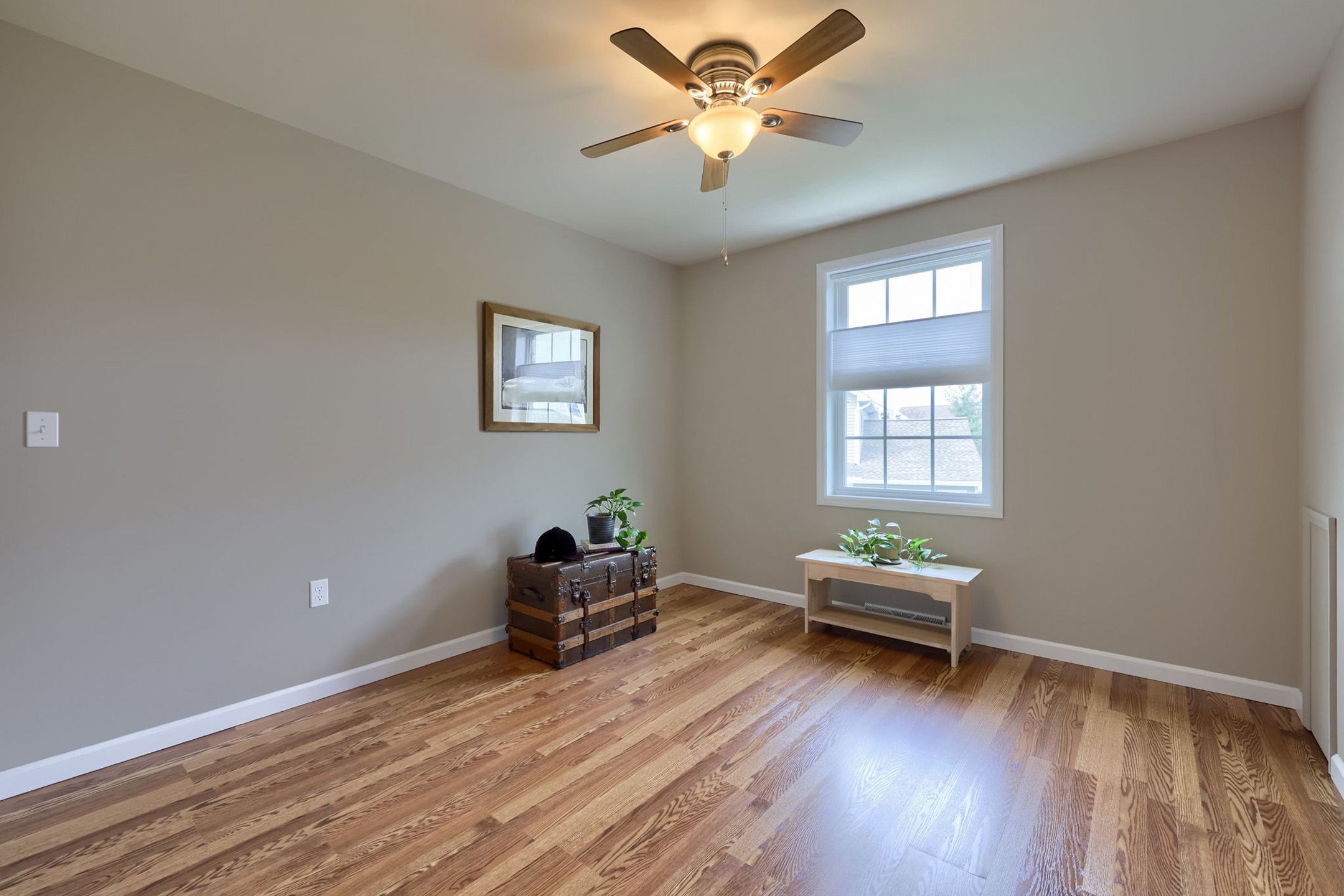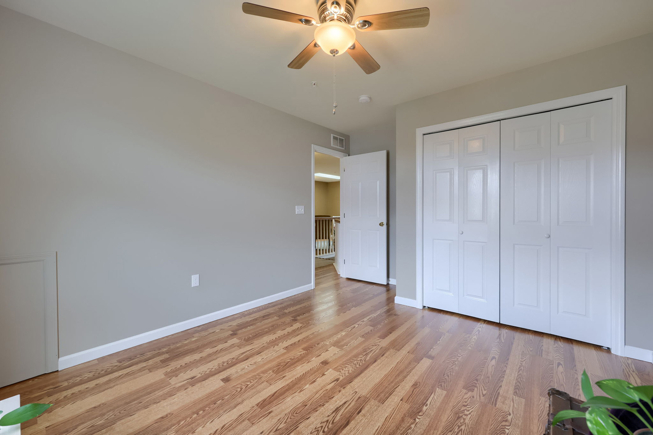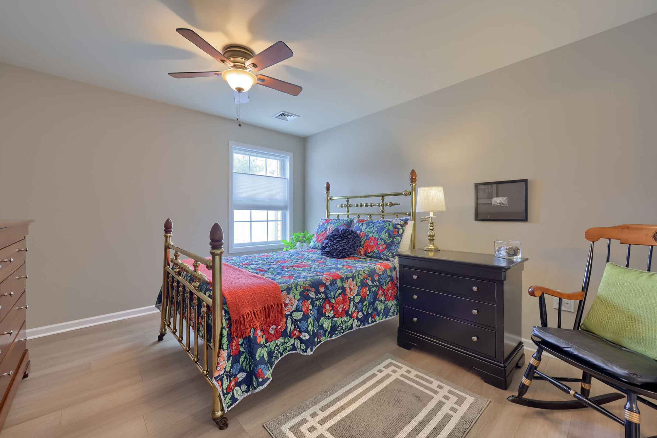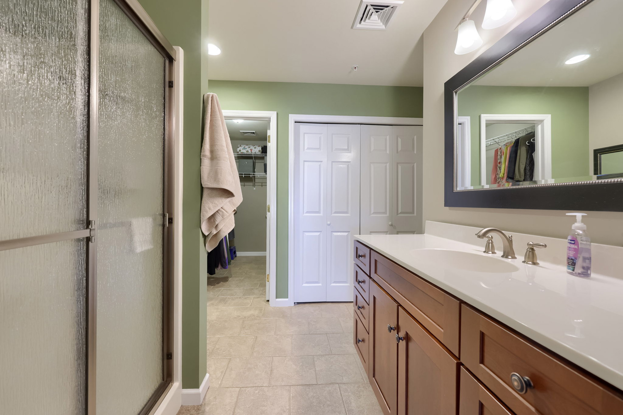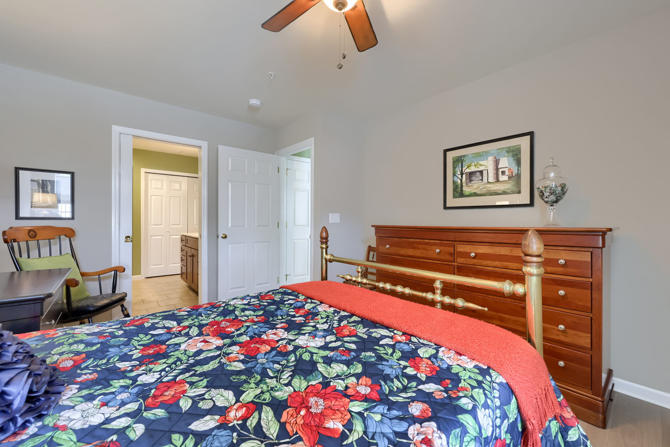 Tucked on the main level, the primary suite is a private retreat. A window with window treatments brightens the room. A ceiling fan stirs gently overhead, while the en-suite bath features a walk-in shower, recessed lighting, wall sconces, and a laundry closet. The spacious walk-in closet completes the suite, offering both ease and organization.