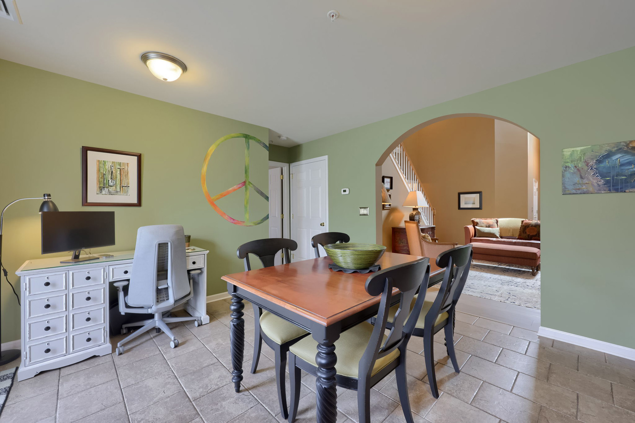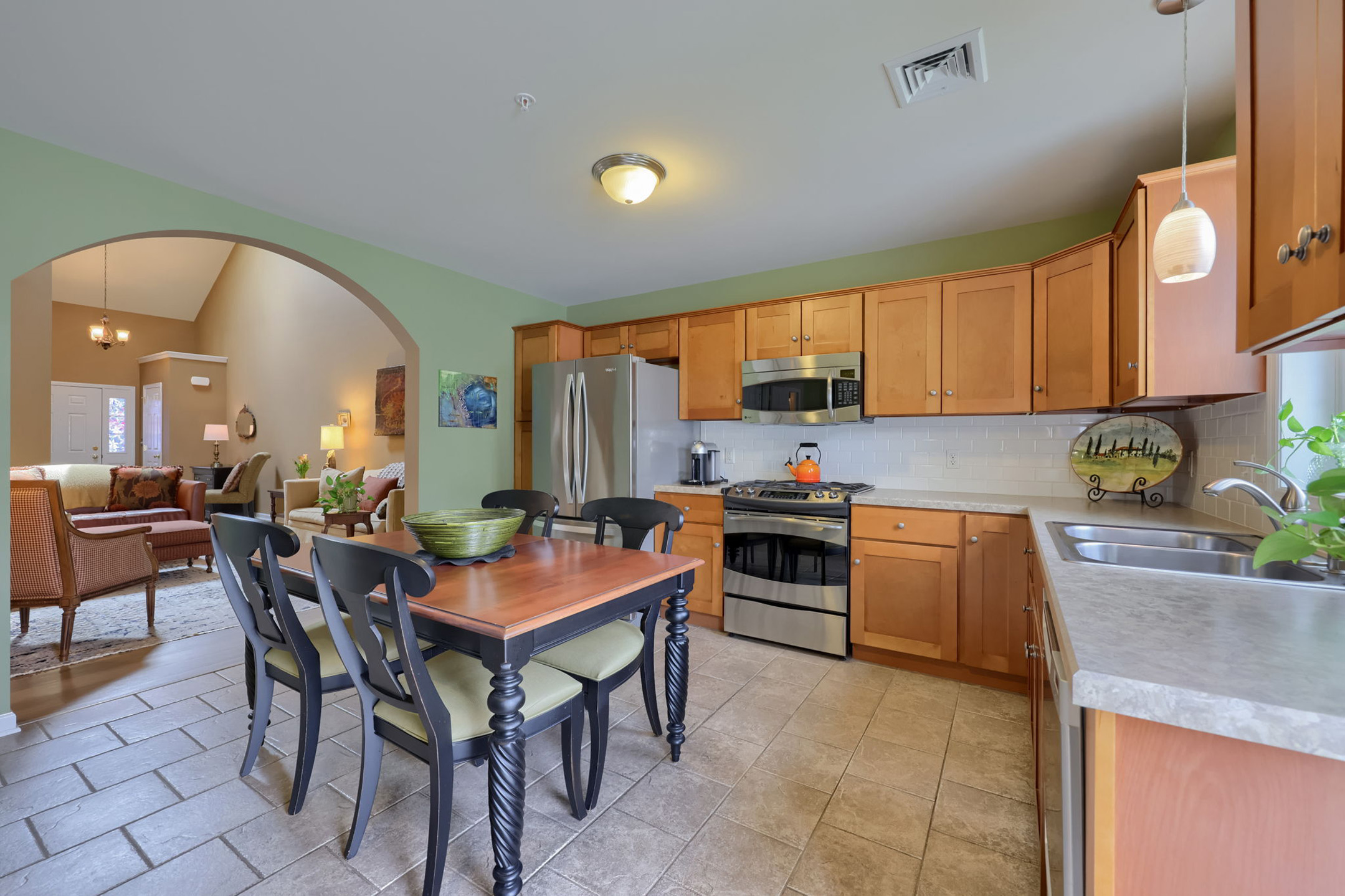 An arched doorway draws you into the kitchen, where form meets function. Tile floors anchor the space, while built-ins and a crisp white tile backsplash add both charm and practicality. Thoughtfully designed to serve as both kitchen and dining area, the space also offers flexibility for a desk or home workspace. The kitchen is equipped with a new Whirlpool refrigerator, GE built-in microwave and dual-fuel oven for efficiency, and a Fisher & Paykel double-drawer dishwasher designed for flexibility. The kitchen sink is positioned beneath a window overlooking the outdoors, allowing natural light to pour in.
